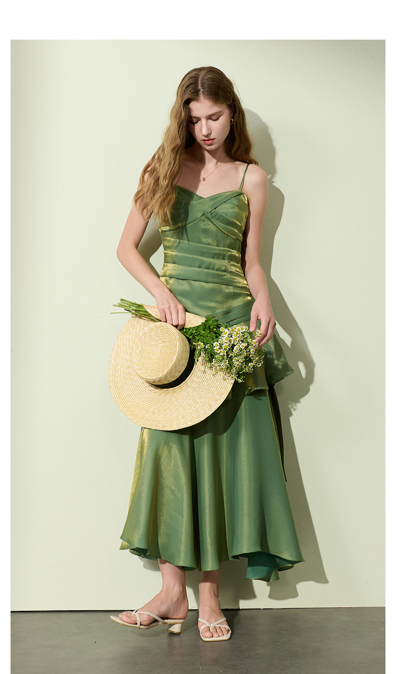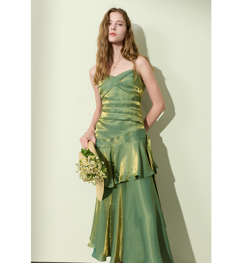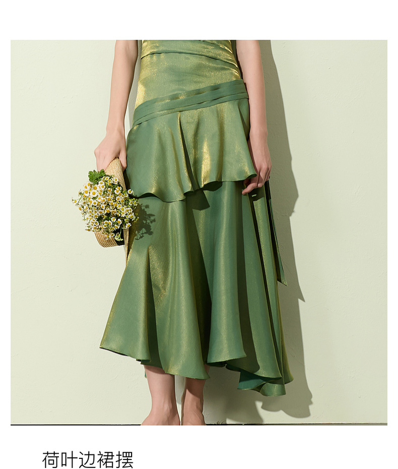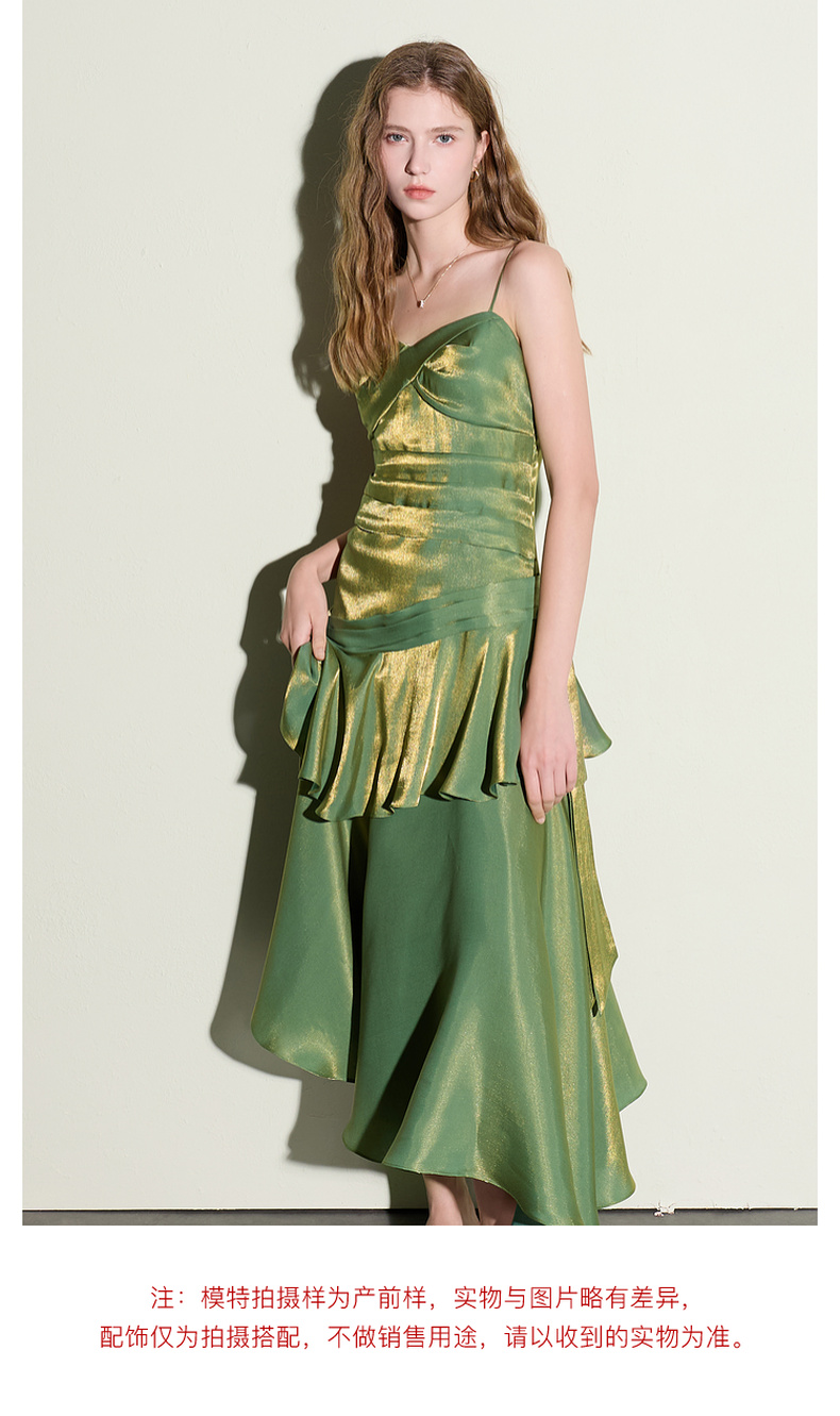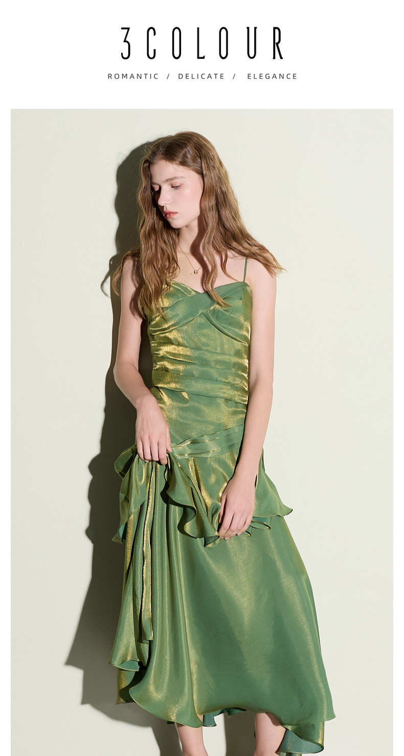 三彩2025夏季新款轻礼服吊带裙连衣裙荷叶边A字长裙轻奢小众M