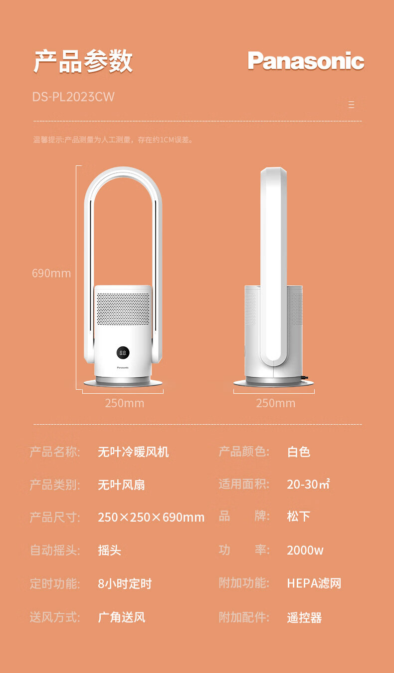松下(Panasonic)取暖器/无叶暖风机/家用电暖器/冷暖两用无叶扇/全屋取暖HEPA过滤网净化空气DS-PL2023CW