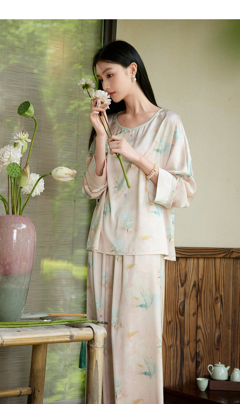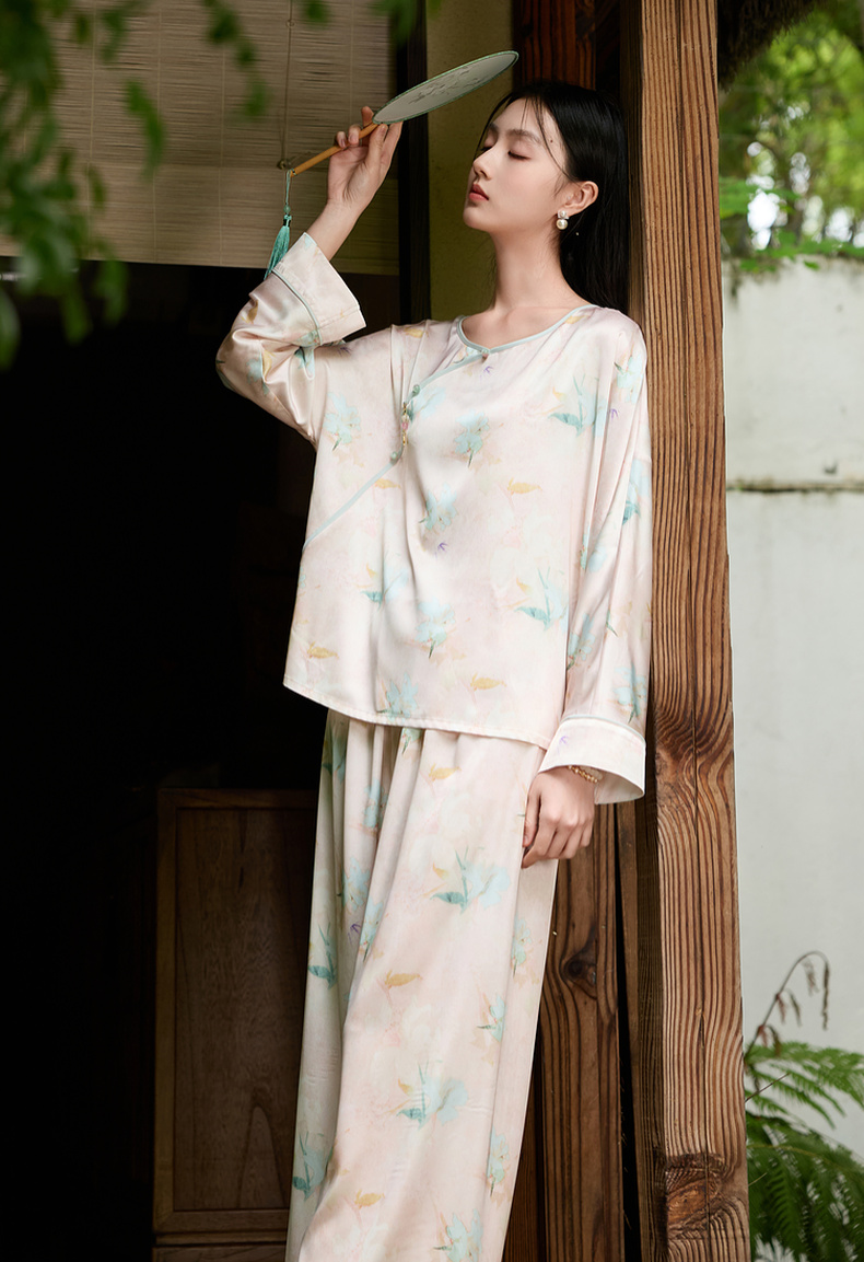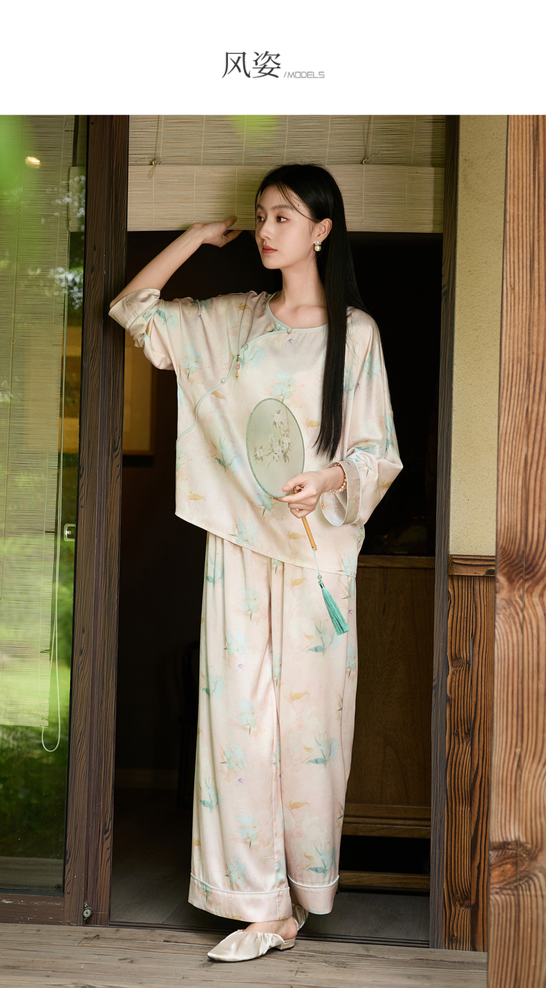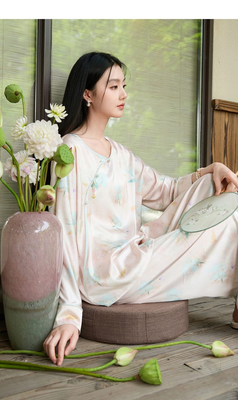 三彩【悠悠夏梦】2025夏季新款家居服套装长袖斜襟小衫长裤C
