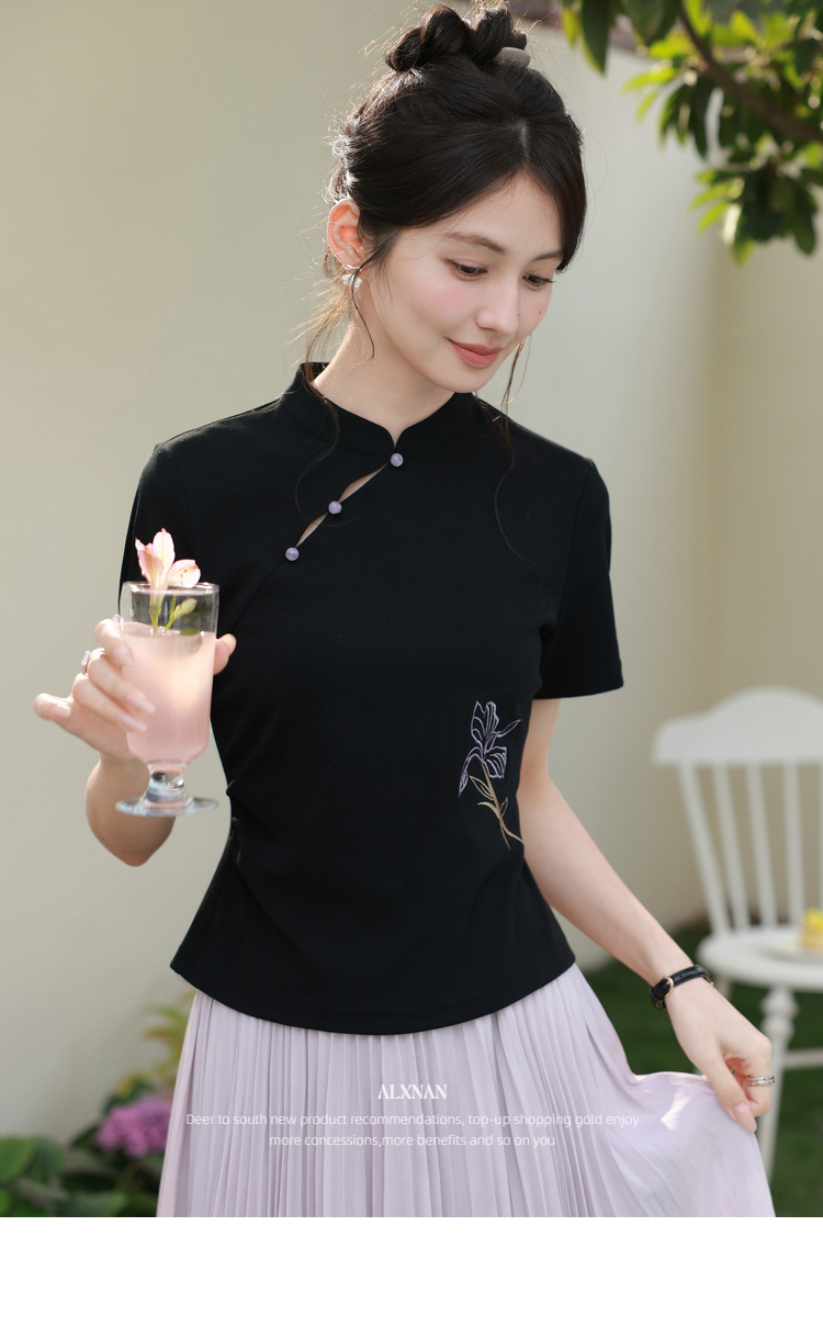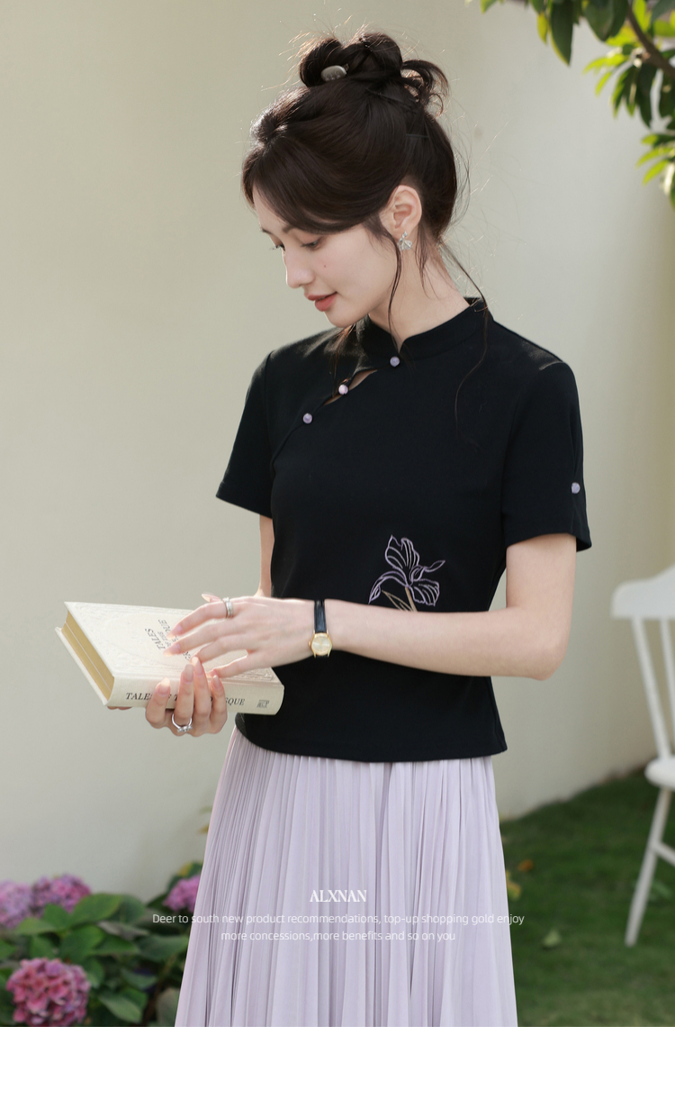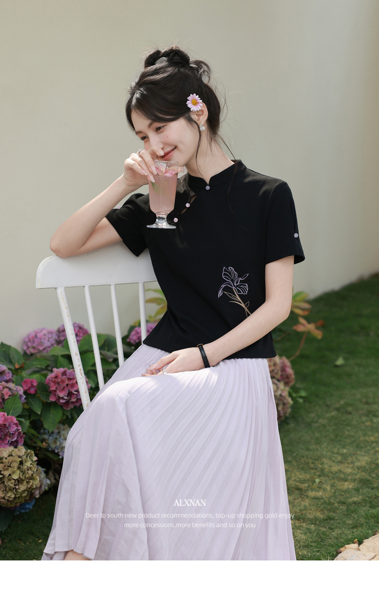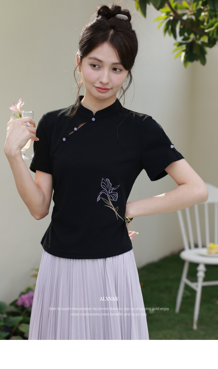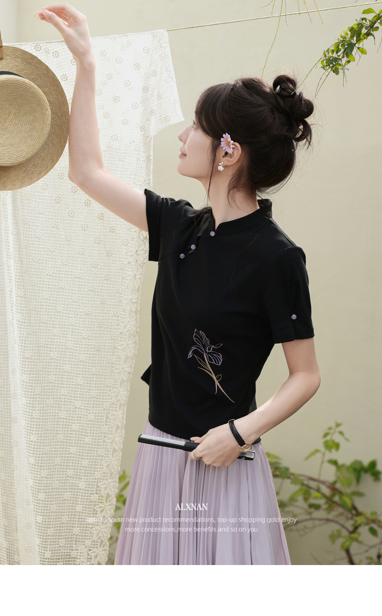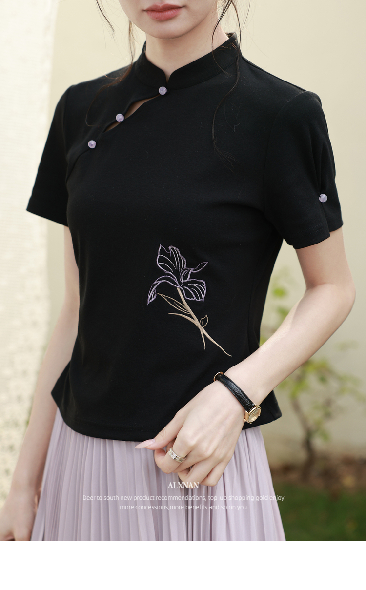 鹿向南「鸢尾琉璃」黑色国风新中式盘扣T恤女夏气质显瘦短袖上衣