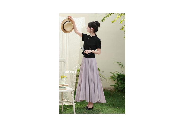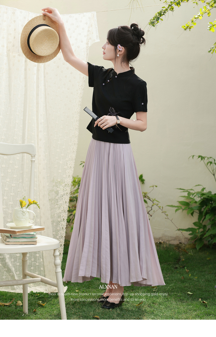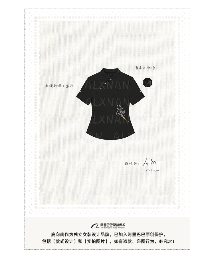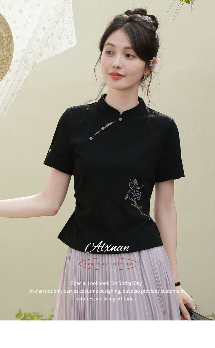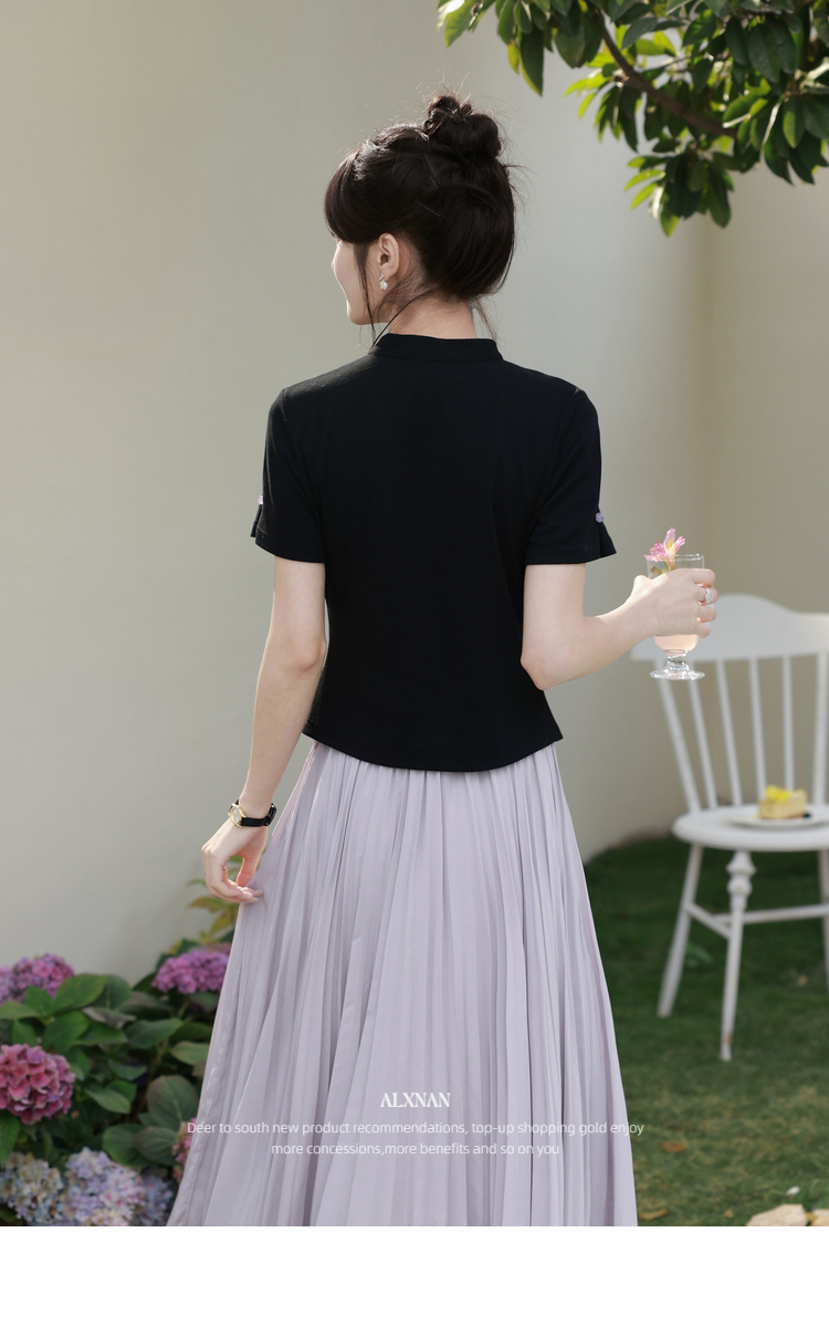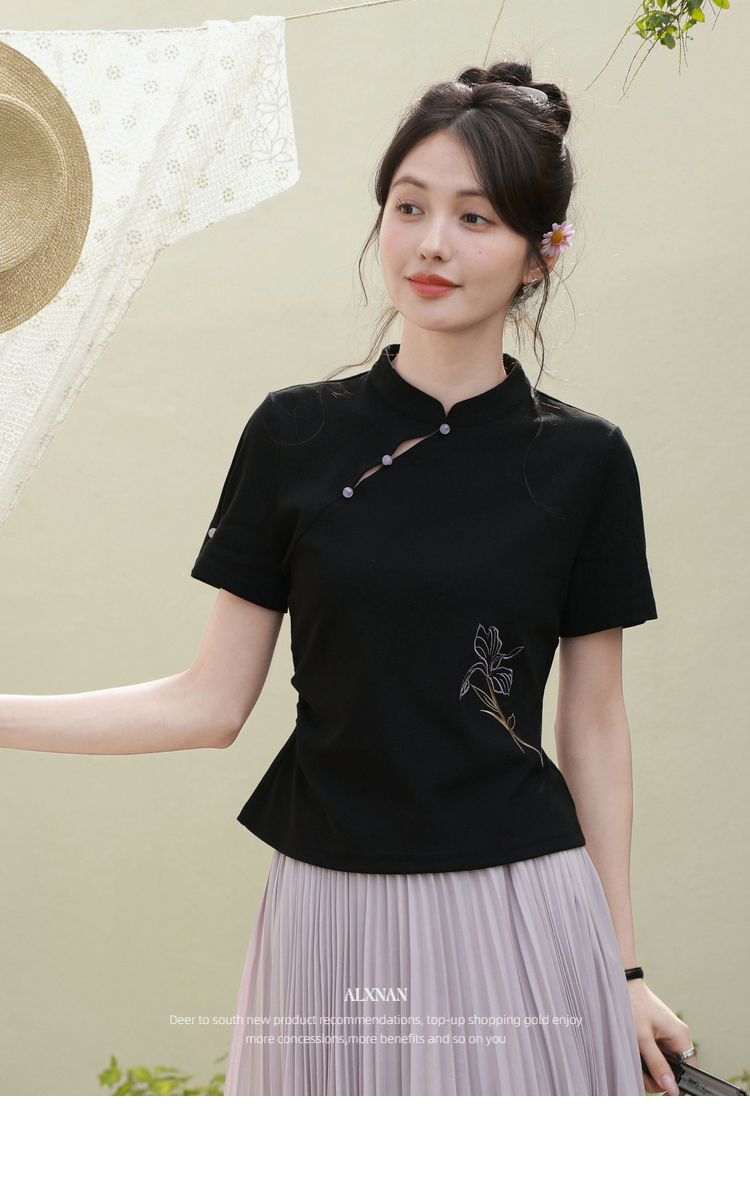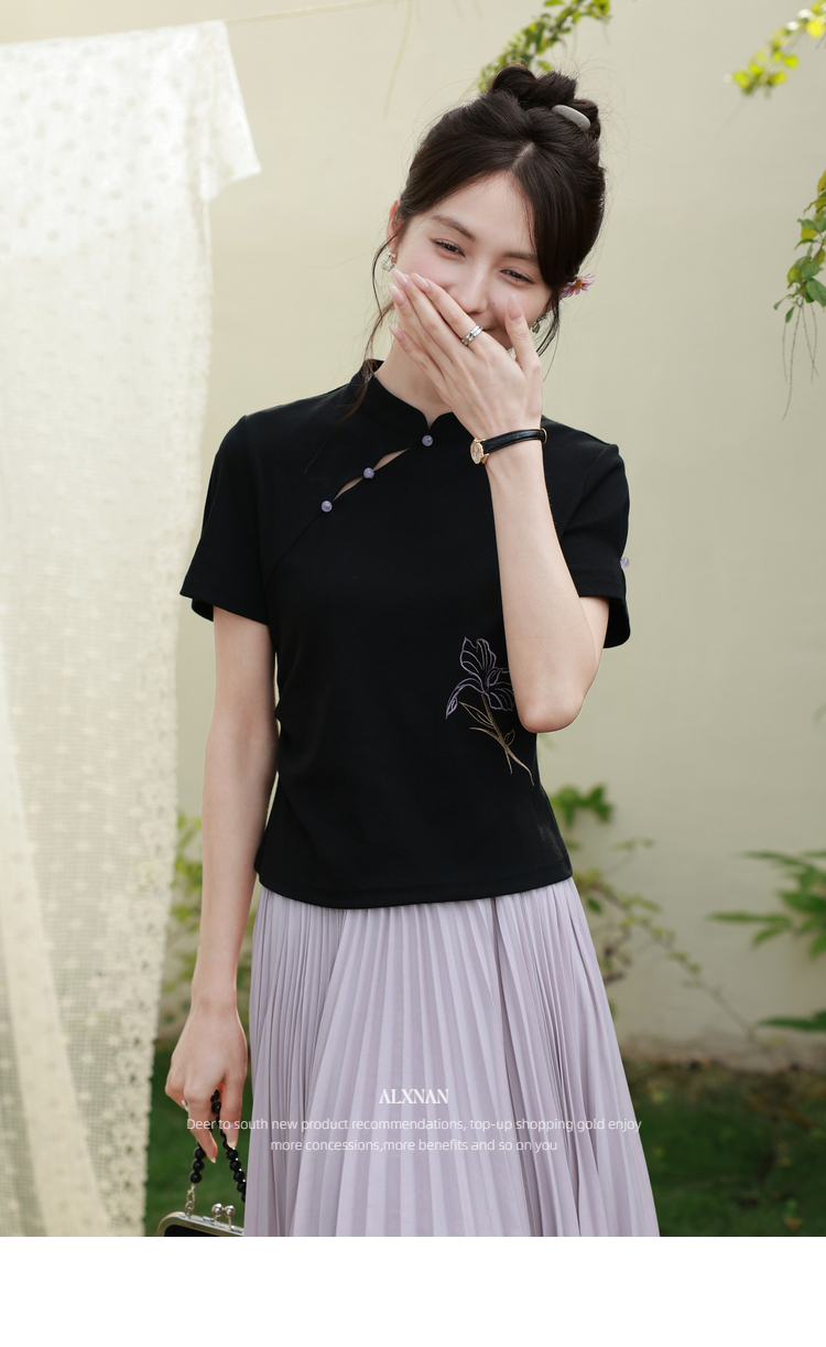 鹿向南「鸢尾琉璃」黑色国风新中式盘扣T恤女夏气质显瘦短袖上衣
