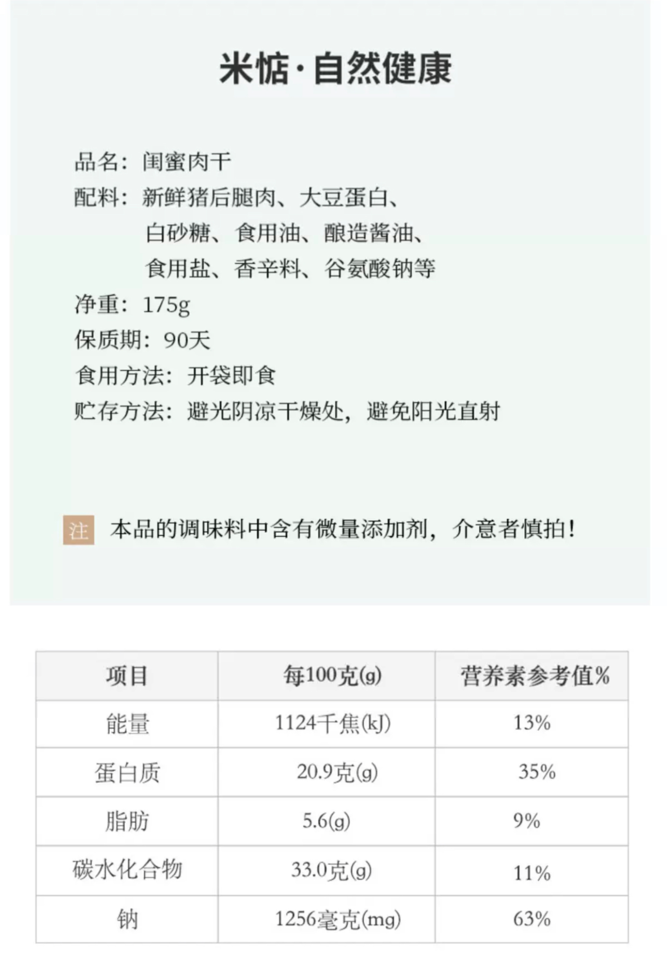 【产品名称】:闺蜜肉干 【产品规格】:175g/袋 【保质期】:90天 【配料表】:新鲜猪后腿肉、大豆蛋白、白砂糖、食用油、酿造酱油、食用盐、香辛料、谷氨酸钠。 【储存方式】:避光阴凉干燥处,避免阳光直射 【发货地】:福建漳州 【发货时效】:72小时内发出 【发货快递】:中通、申通随机发不指定 【不发地区】:新疆、西藏、青海、宁夏、甘肃、内蒙古及部分疫情地区 【补运费地区】:北京,上海➕一元,甘肃、内蒙古、宁夏运费加14元,青海、新疆、西藏运费加16元。 【售后说明】: 1、食品无质量问题不支持 7 天无理由退换。 2、产品少发、漏发,质量问题,请提供产品连同快递单(需看见单号)一起拍照24 小时内发给客服核实处理。 3、如包裹破损、挤压严重请拍照签收,签单破损签收,请在签收48小时内拍照联系客服处理。 4、产品已经发出的情况下,不建议更改地址、不退货,下单前,请仔细核对信息!货物产生物流单号,无法拦截,如需拦截须支付快递费用。