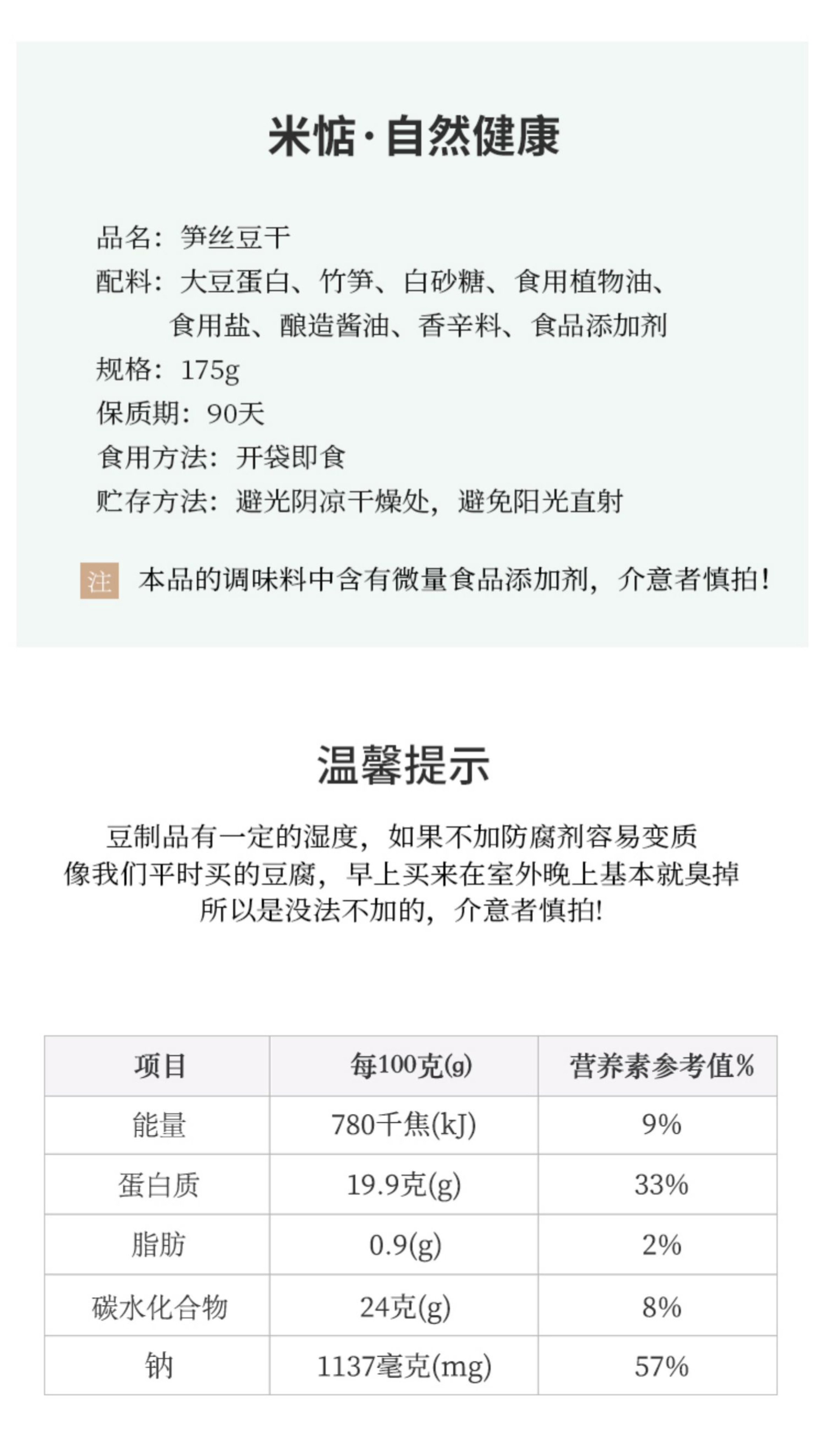 【产品名称】:笋丝豆干 【产品规格】:175g/袋 【保质期】:90天 【配料表】:大豆蛋白、竹笋、白砂糖、食用植物油、食用盐、酿造酱油、香辛料、食品添加剂 【储存方式】:避光阴凉干燥处,避免阳光直射 【发货地】:福建漳州 【发货时效】:72小时内发出,12点前给订单 【发货快递】:中通、申通随机发不指定 【不发地区】:新疆、西藏、青海、宁夏、甘肃、内蒙古及部分疫情地区 【补运费地区】:北京,上海➕一元,甘肃、内蒙古、宁夏运费加14元,青海、新疆、西藏运费加16元。