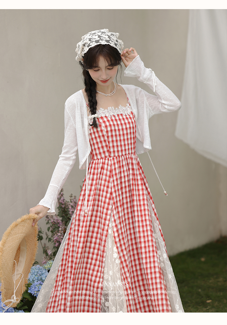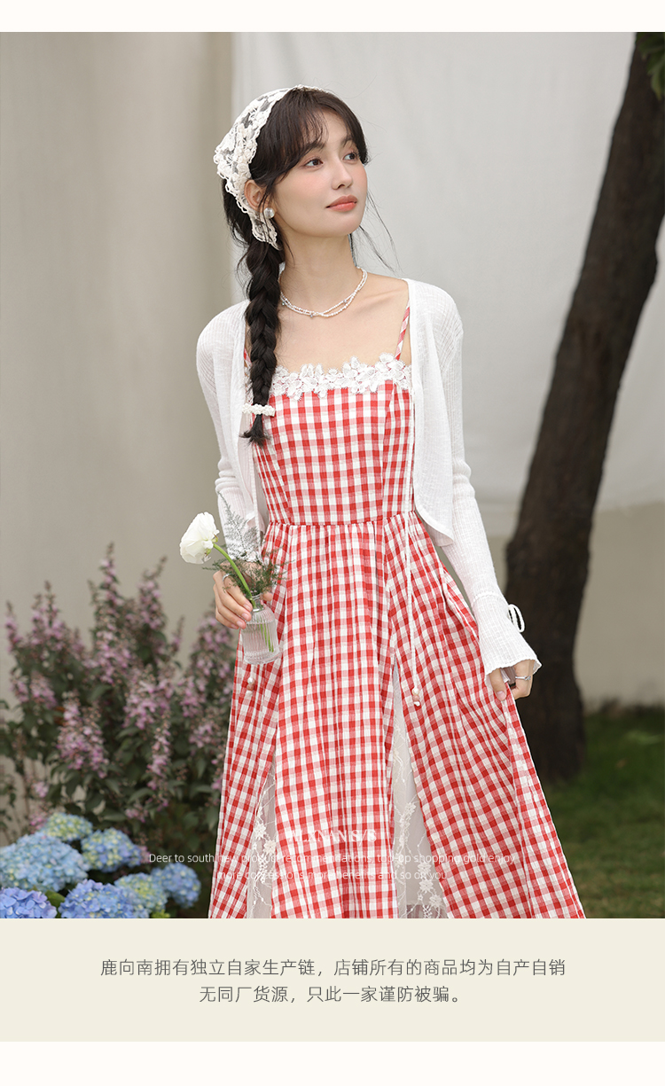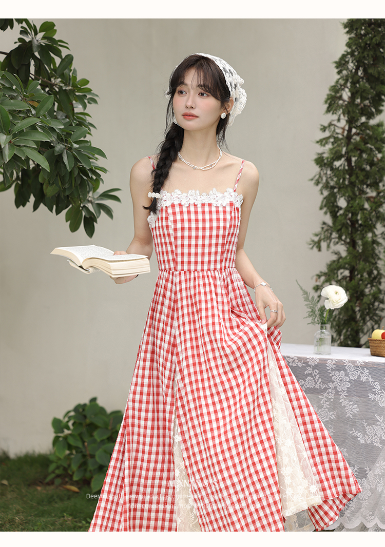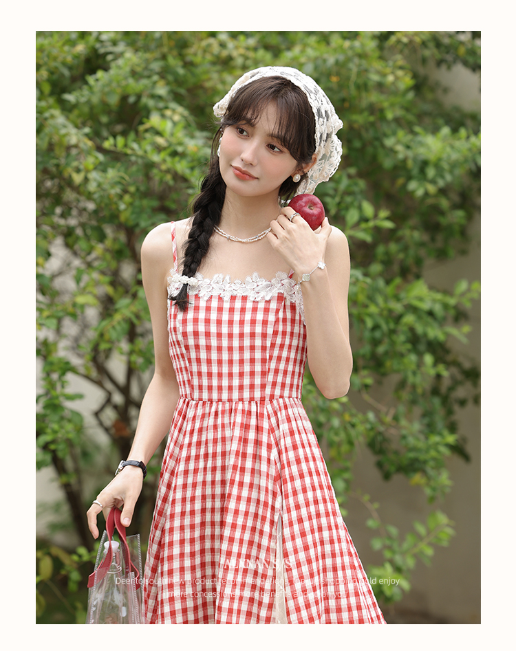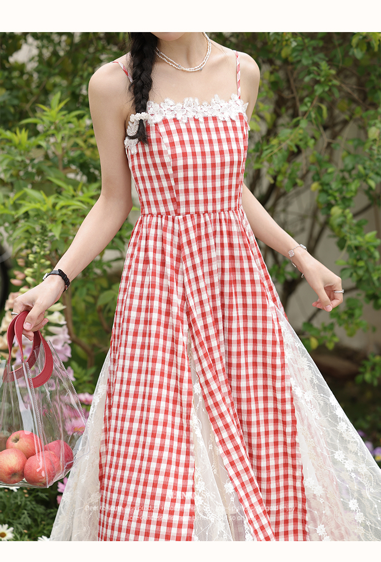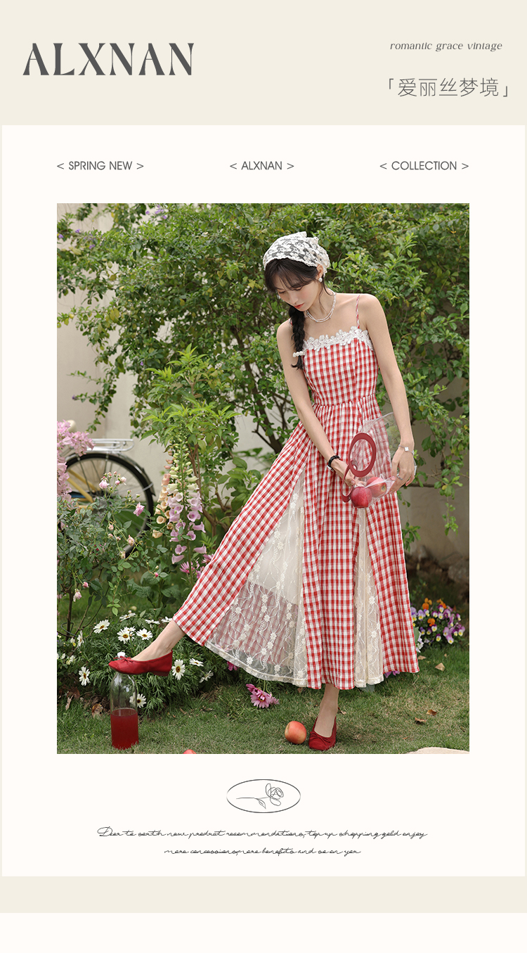 【6折秒杀】鹿向南「爱丽丝梦境」「爱丽丝梦境」法式吊带连衣裙女夏设计感红白格拼接蕾丝裙L53525