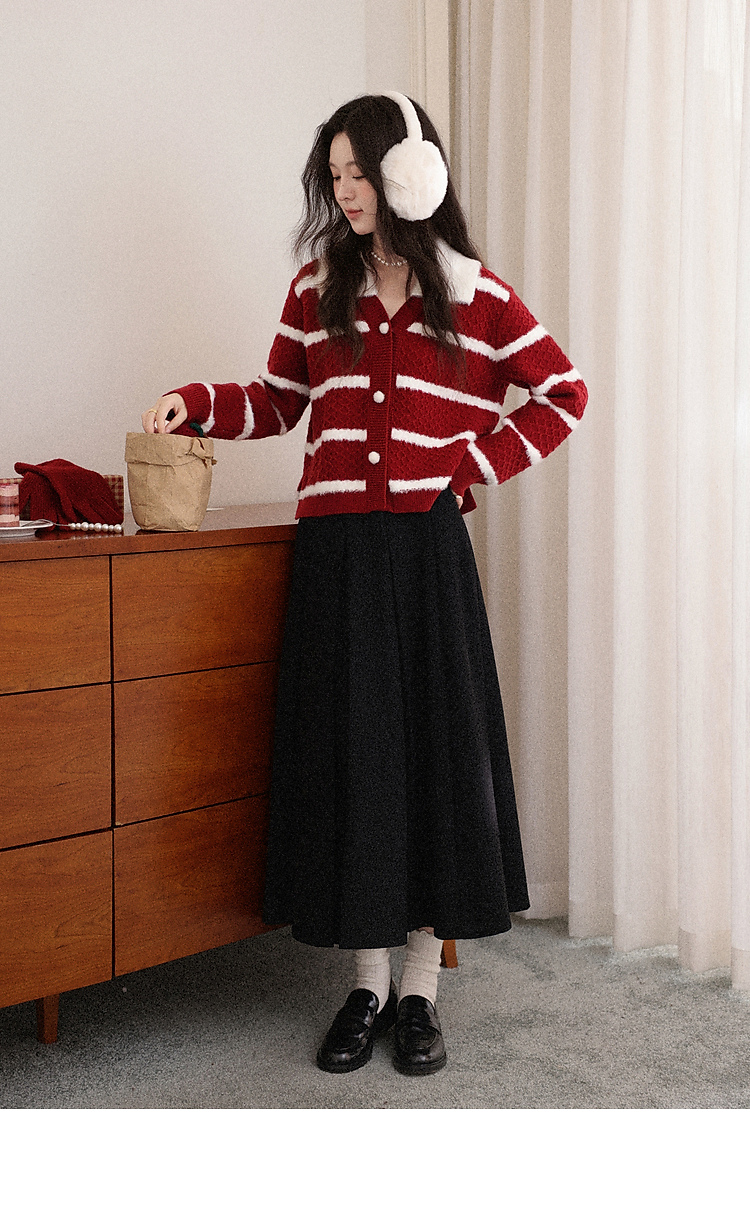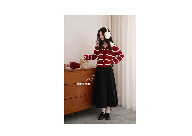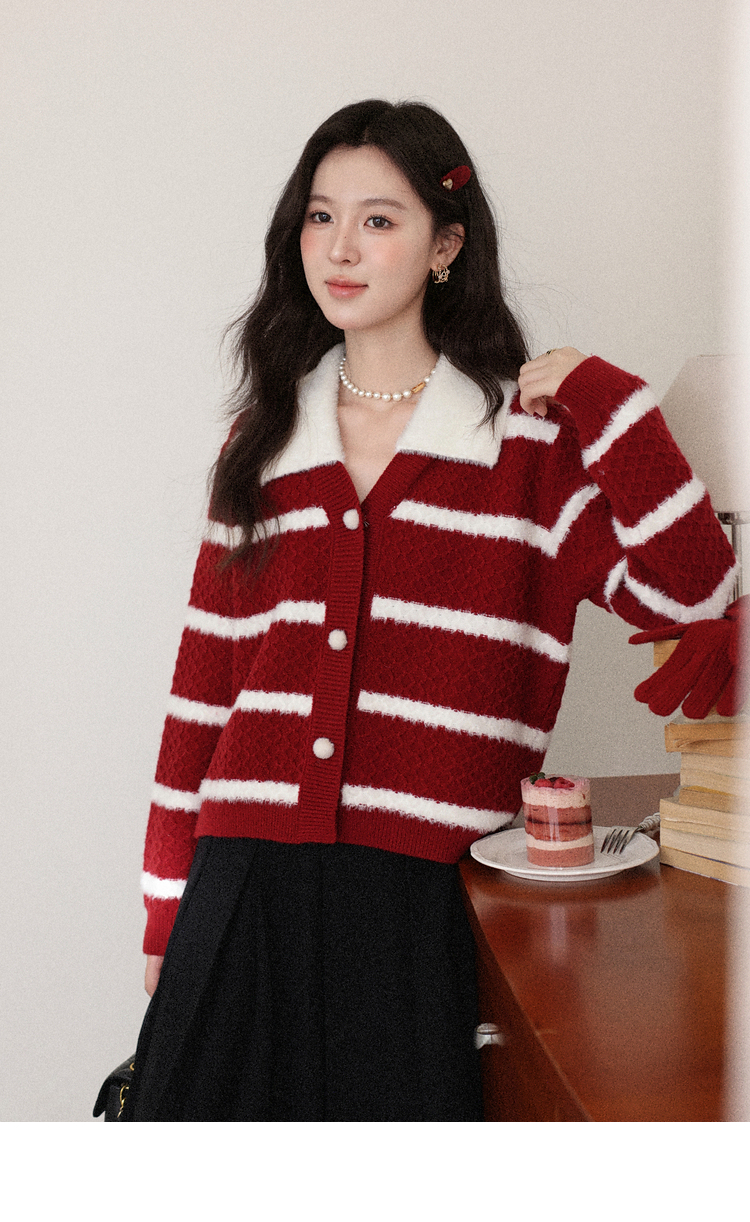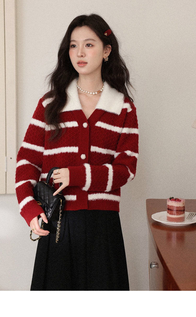 鹿向南「雪镜叠影」红杏圣诞条纹针织毛衣女秋冬正肩开衫显瘦上衣