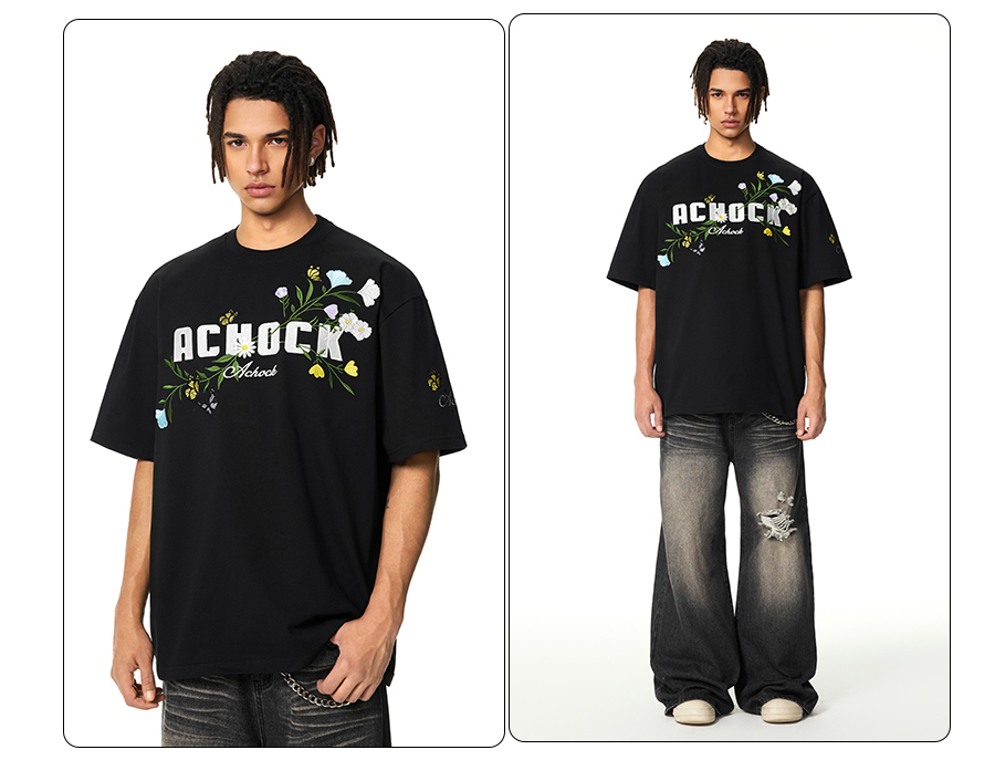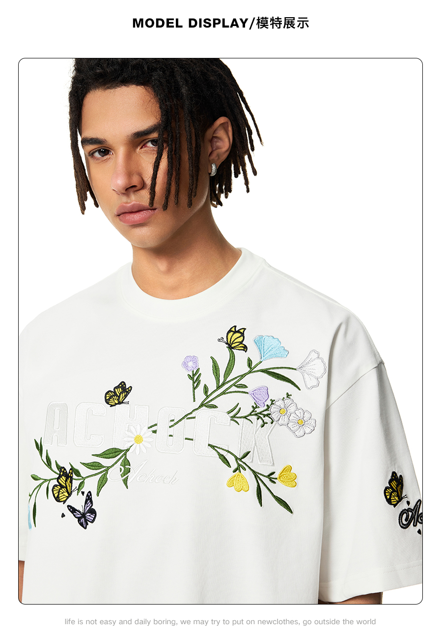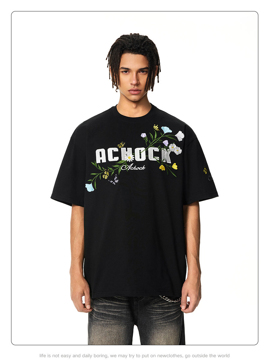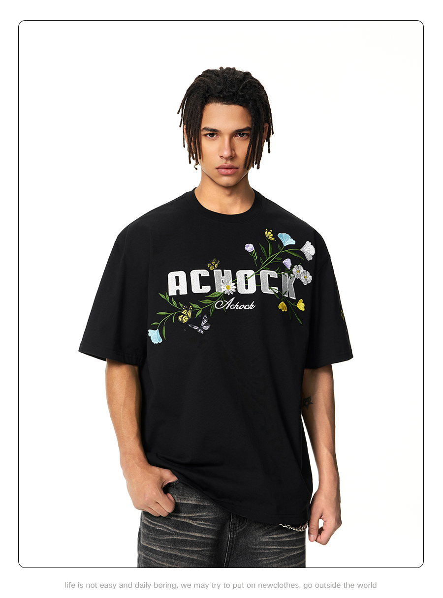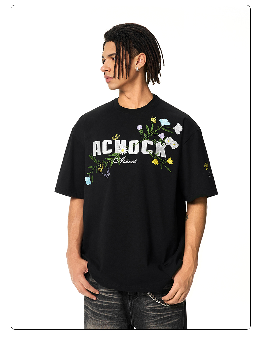 【Achock官方店】花卉刺绣短袖T恤男女新款潮牌美式情侣上衣体恤