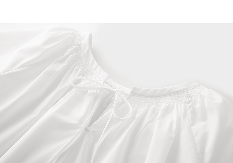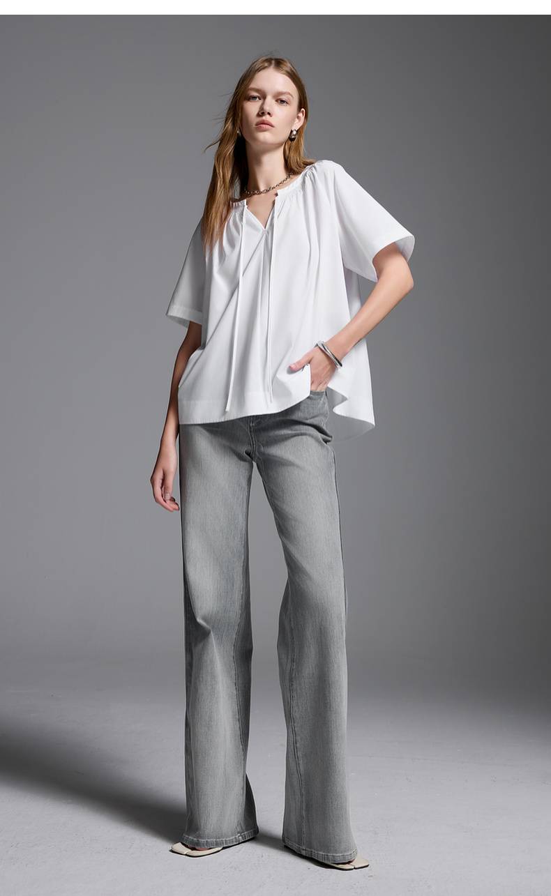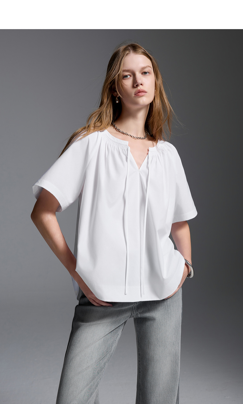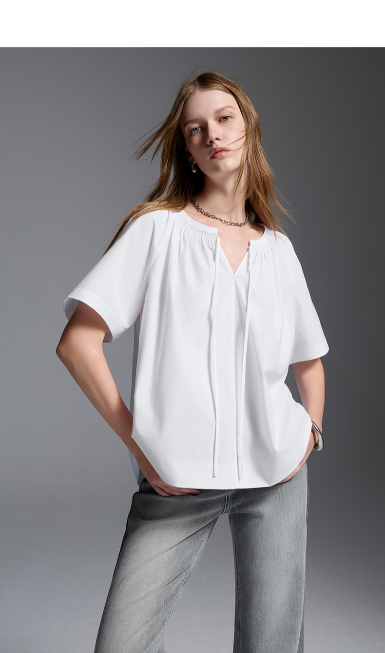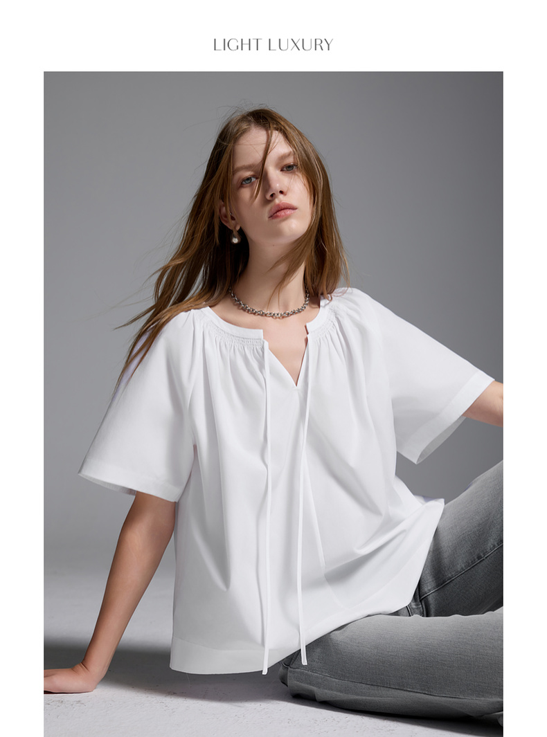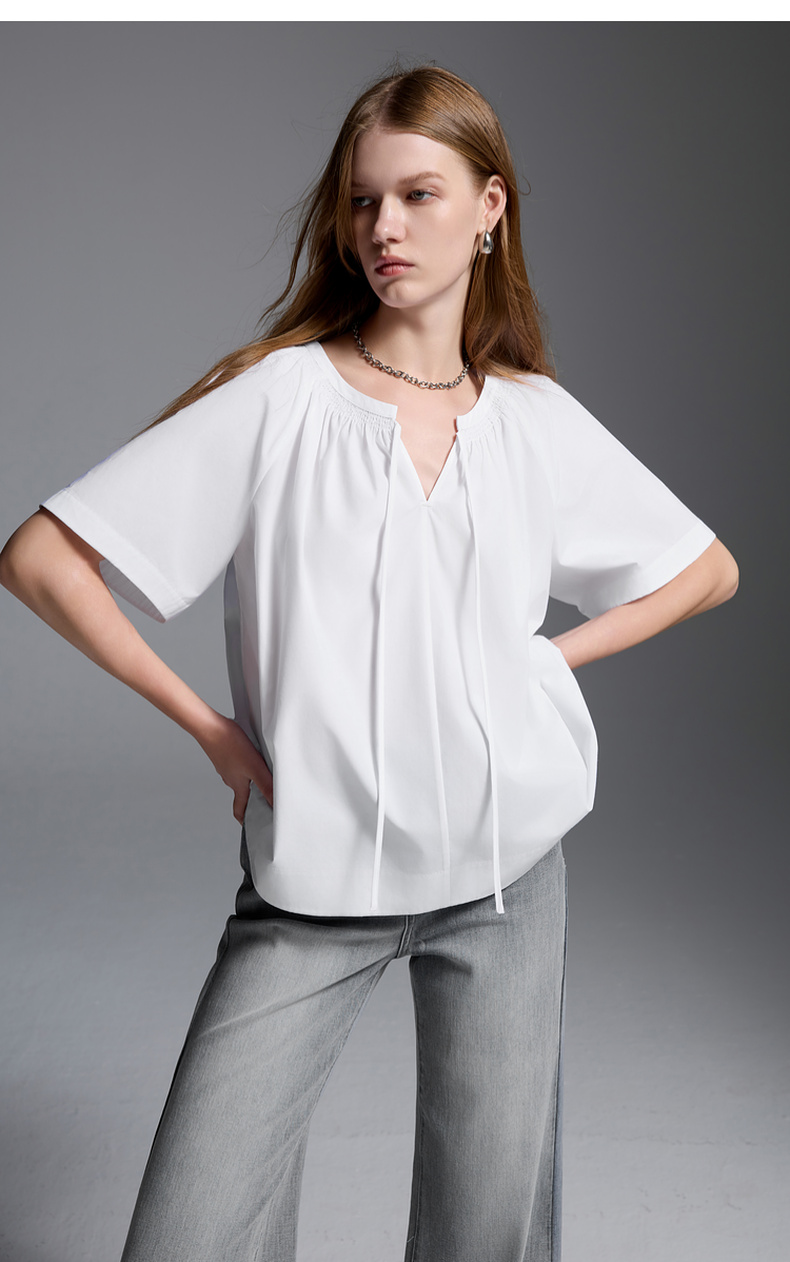三彩2025夏季新款纯色小衫插肩袖宽松上衣系带套头衫优雅S