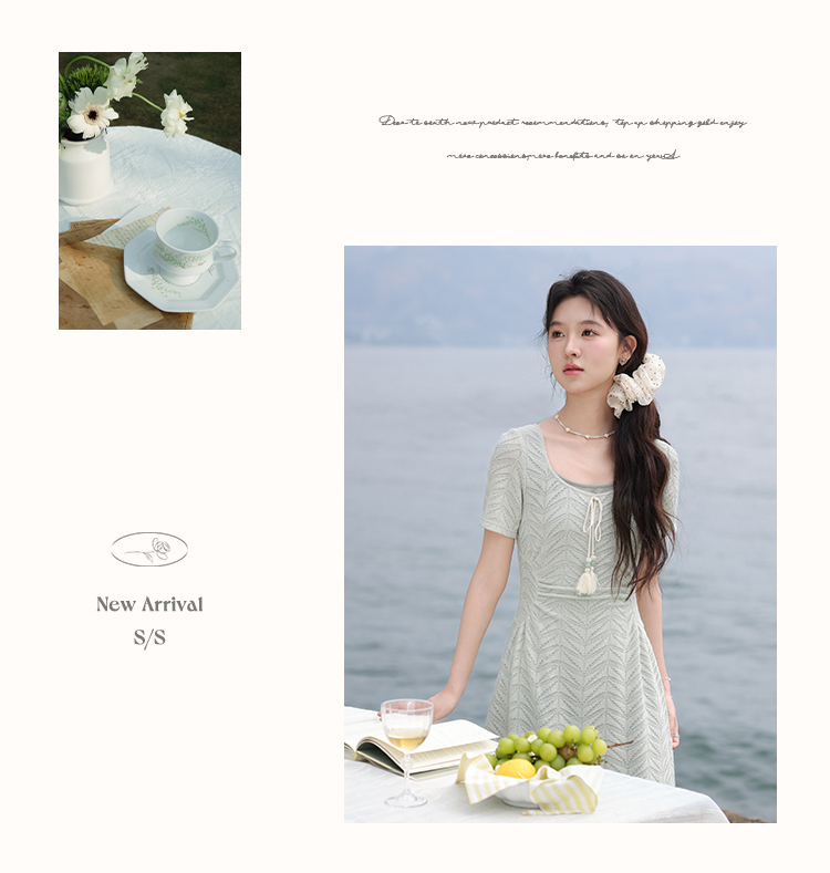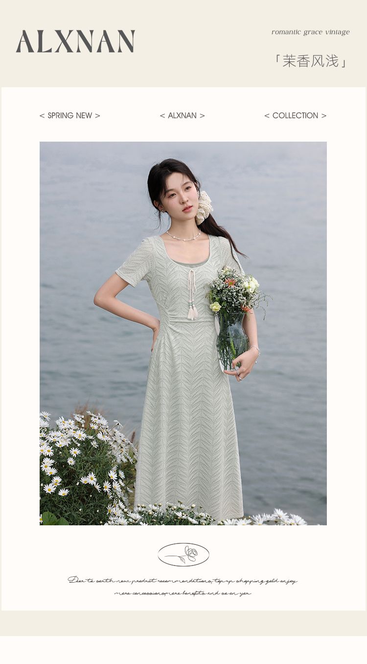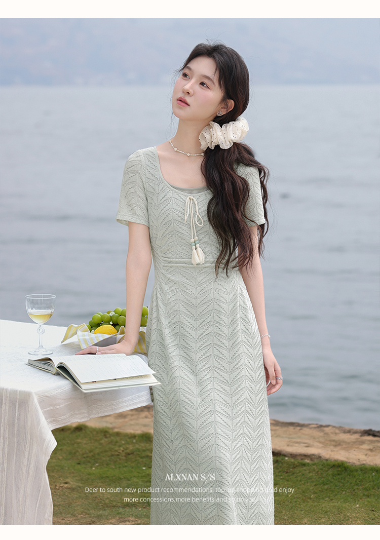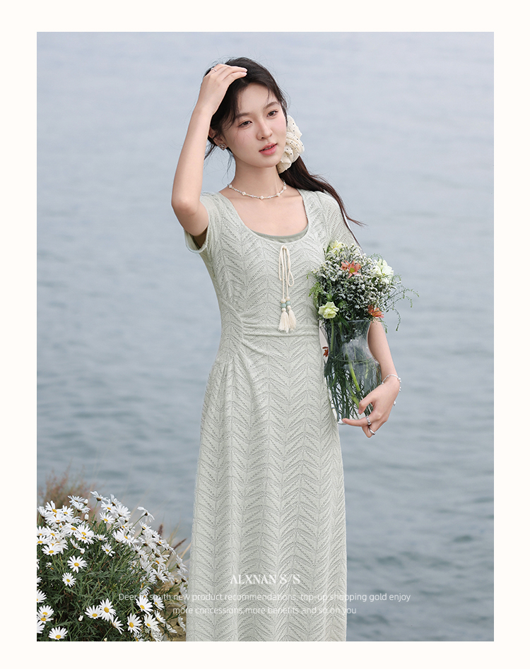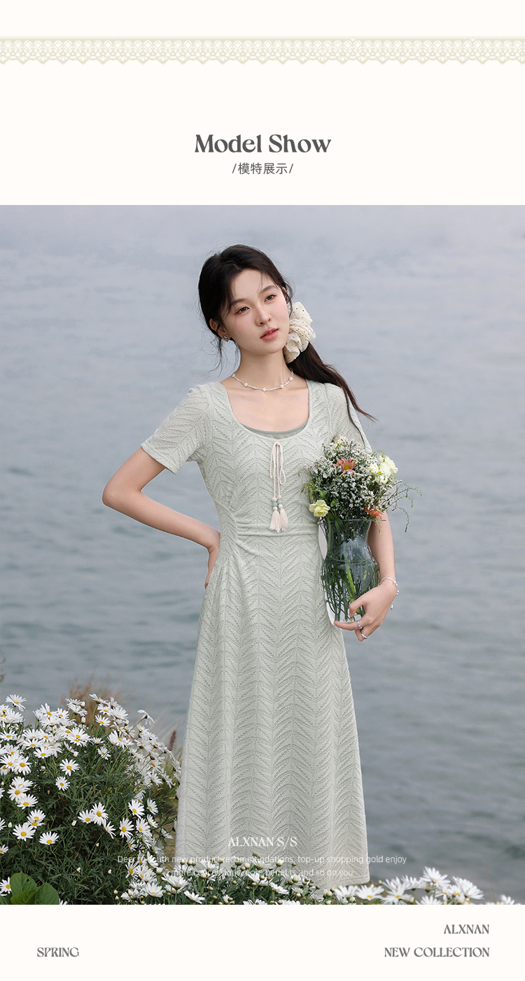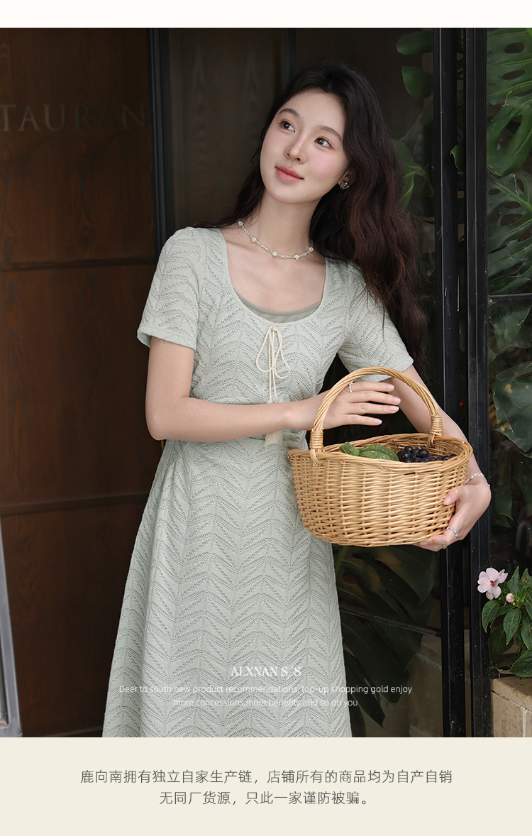 【6折秒杀】鹿向南「茉香风浅」绿色时尚连衣裙女夏季新高腰显瘦假两件长裙子