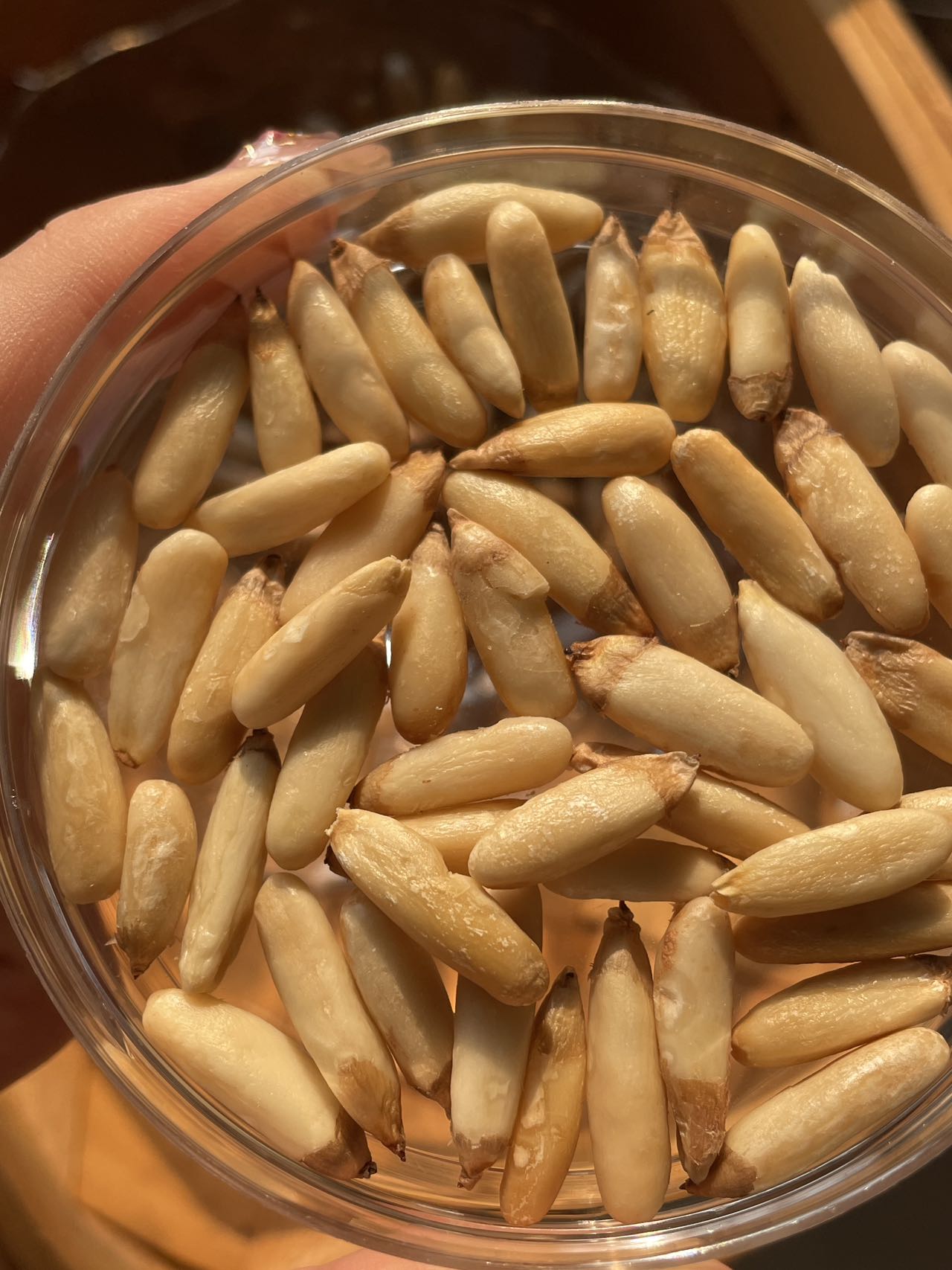 巴西松子"皮薄且脆",轻轻一剥就能拨开,不需要提前开口,并且松子呈长条形、个头更大。