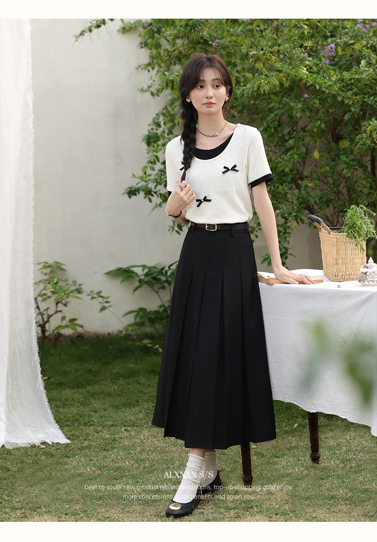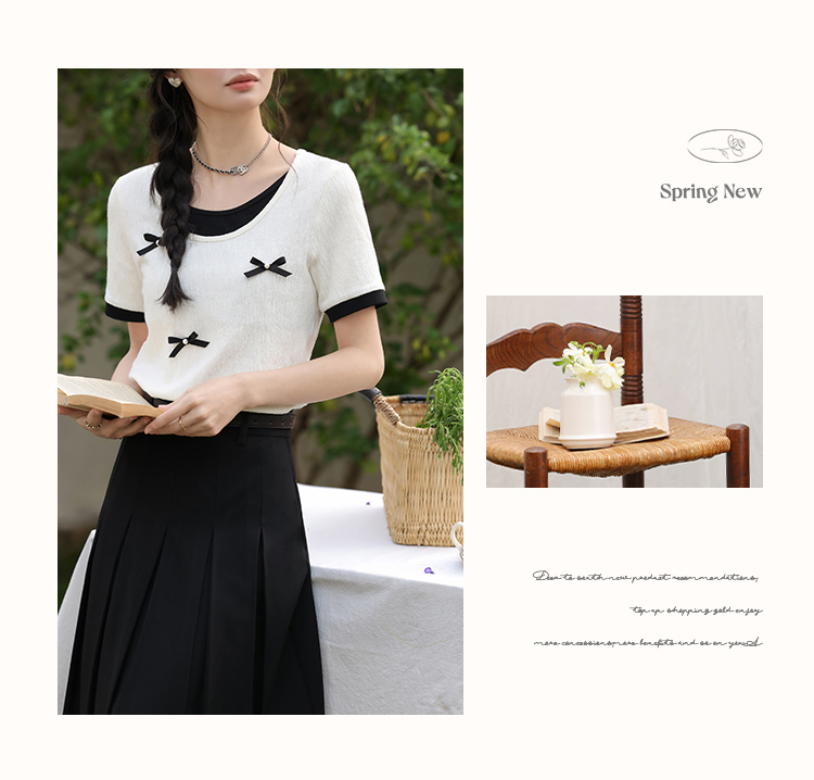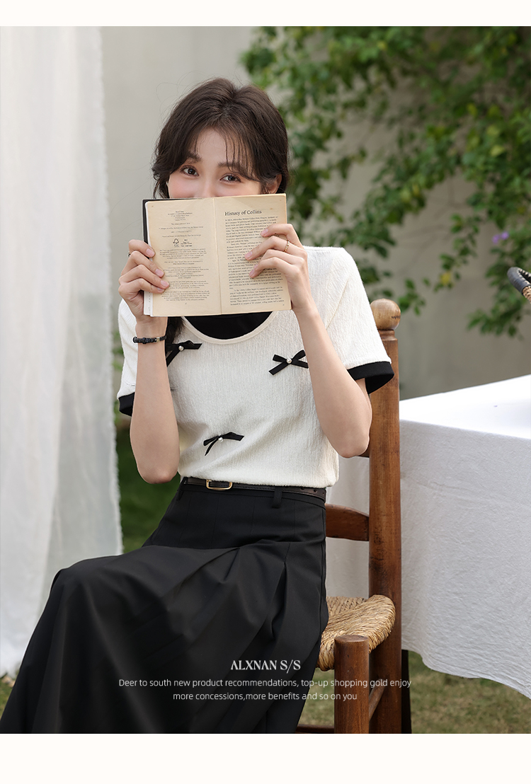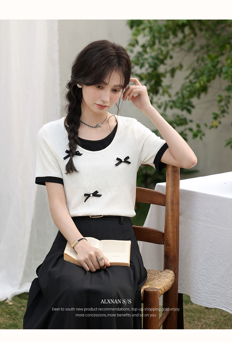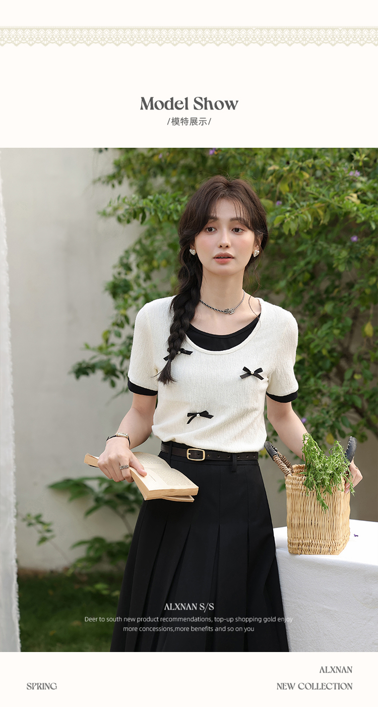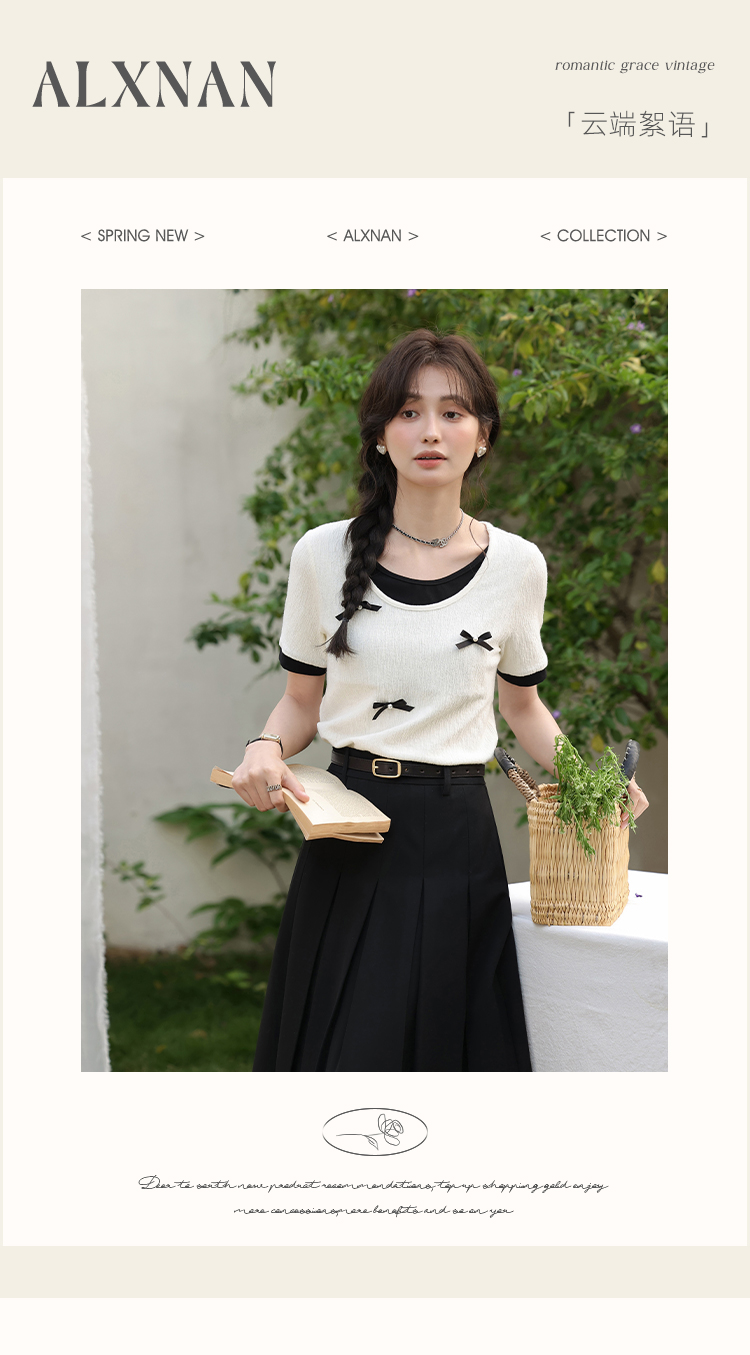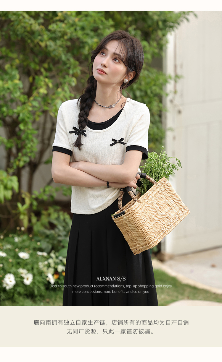 【65折秒杀】鹿向南「云端絮语」米白色T恤短袖女夏季新款假两件圆领正肩上衣L53573