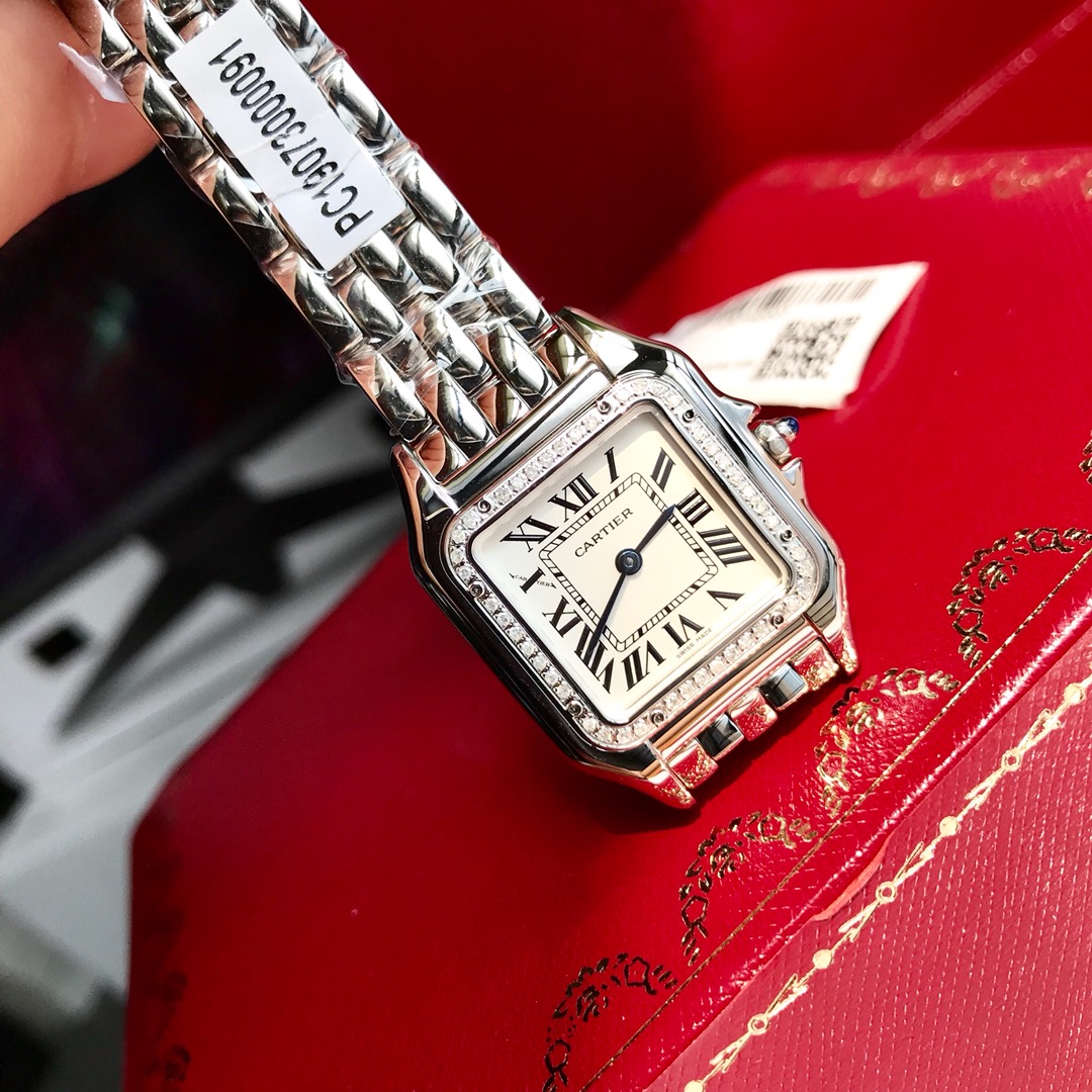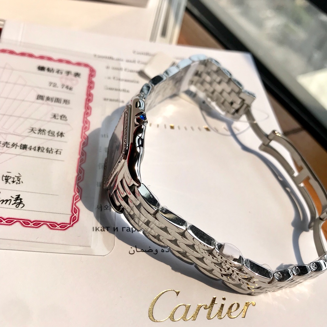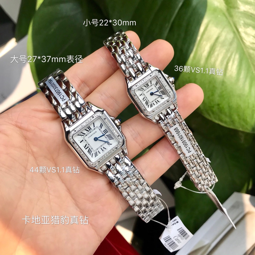 大号(官方叫中号)高端硬货到!表圈镶嵌44颗VS1.1天然真钻,中国GTC认证,一表一卡联网可查,渠道出口订单!配弹力开口原盒!部分配件可以与正品替换共用,可专柜卸表带(需付费),Panthère de Cartier 卡家猎豹手表,不会像蓝气球那么撞款,但识别度又很高,华丽而不羁,是Panthère de Cartier猎豹所传达的美学风格。它线条流畅,魅惑动人,柔软服帖于腕间,宛若在肌肤上翩翩起舞。独特的造型彰显成熟优雅、自信动人的女性形象。表壳一体成型,瑞士石英机芯,316L精钢壳套,表冠镶嵌一颗合成蓝色尖晶石,剑形烧蓝钢指针,防水深度约30米,~中号27*37mm,超薄6mm,性价比无敌
