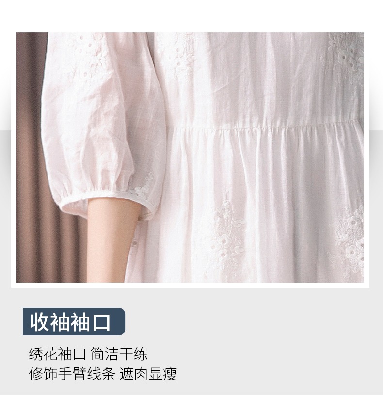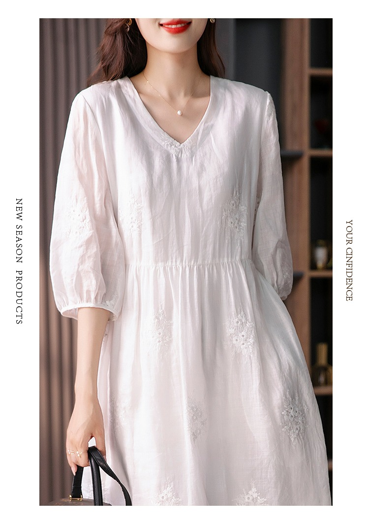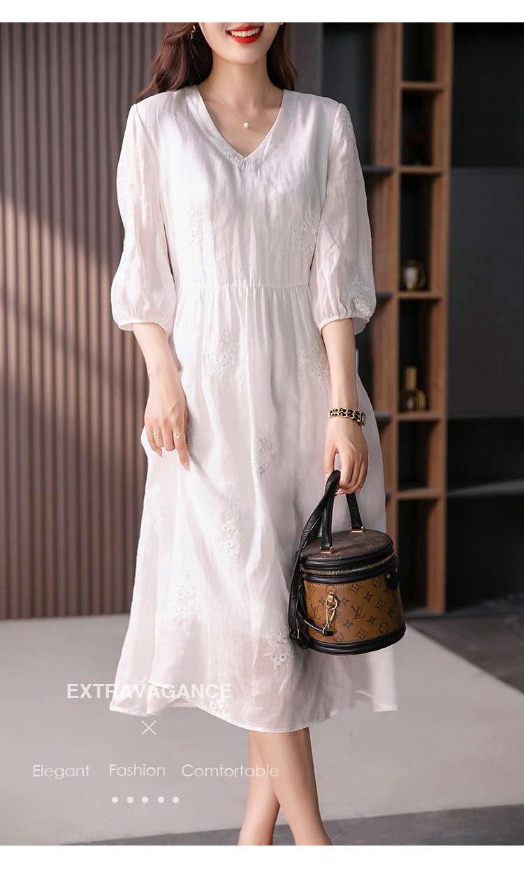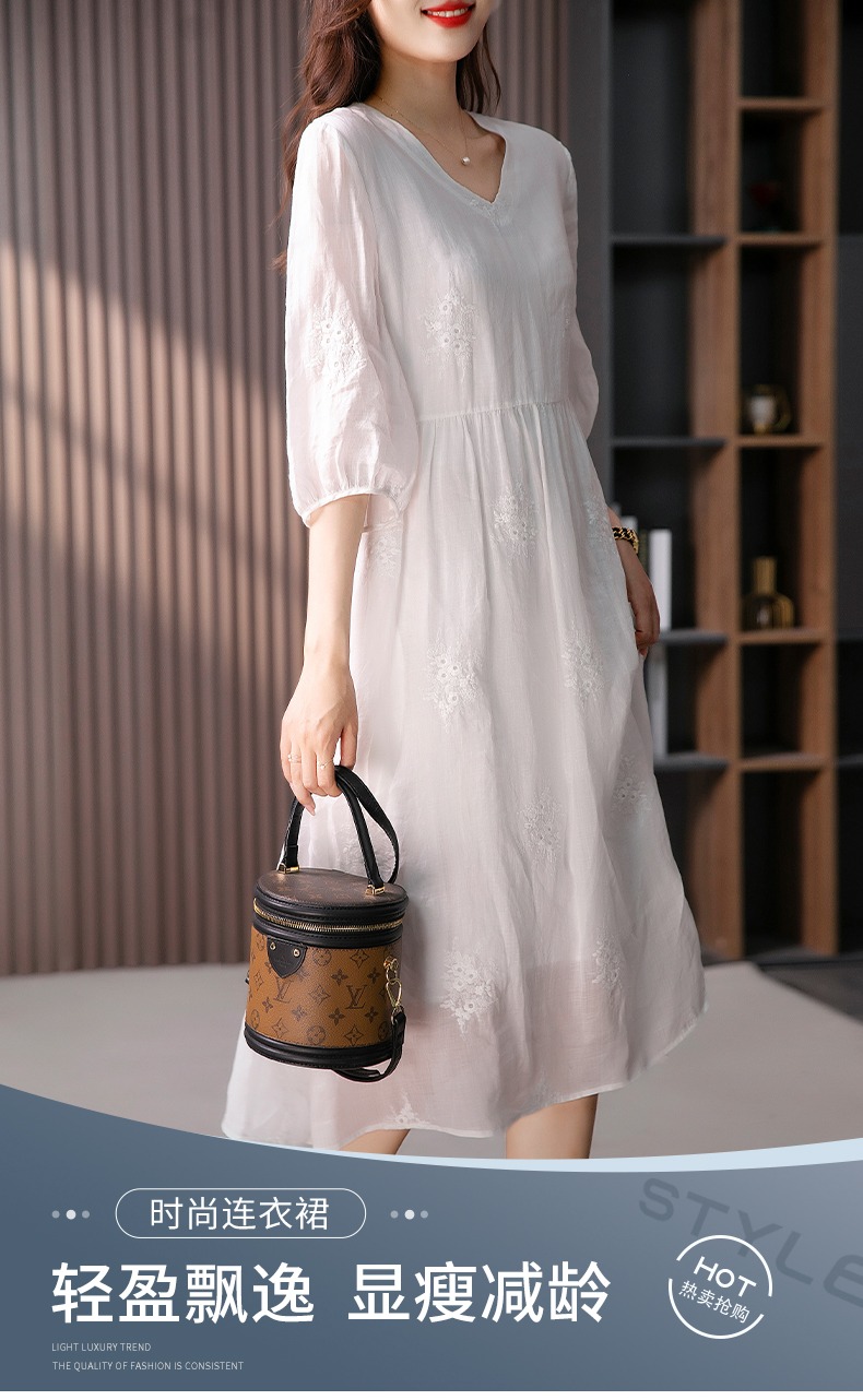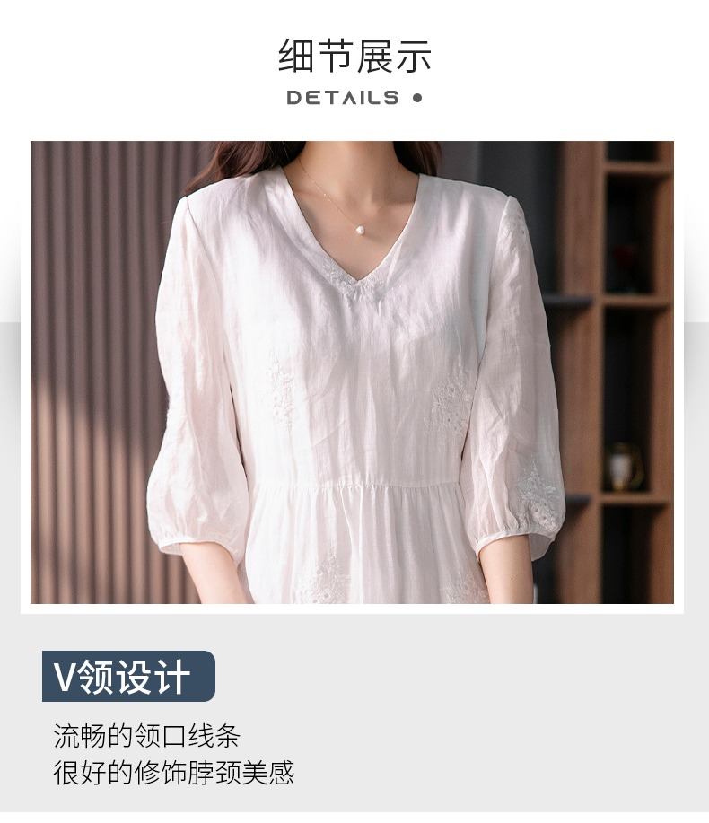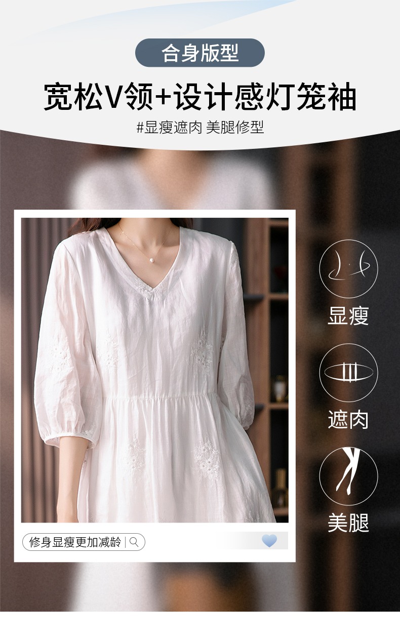 89205原形V领刺绣苎麻连衣裙女夏2024新款设计感灯笼袖绣花显瘦长裙子