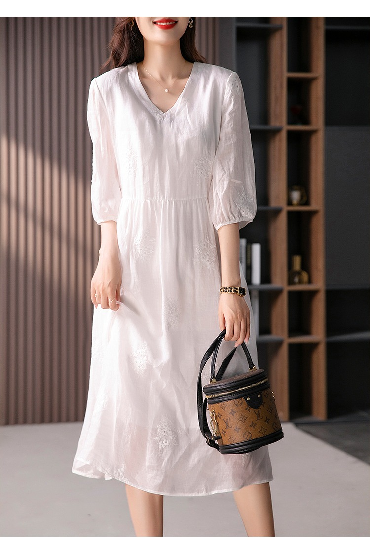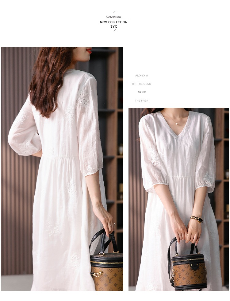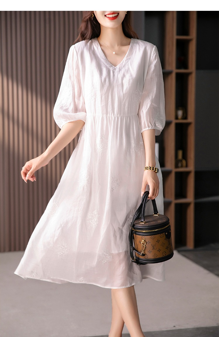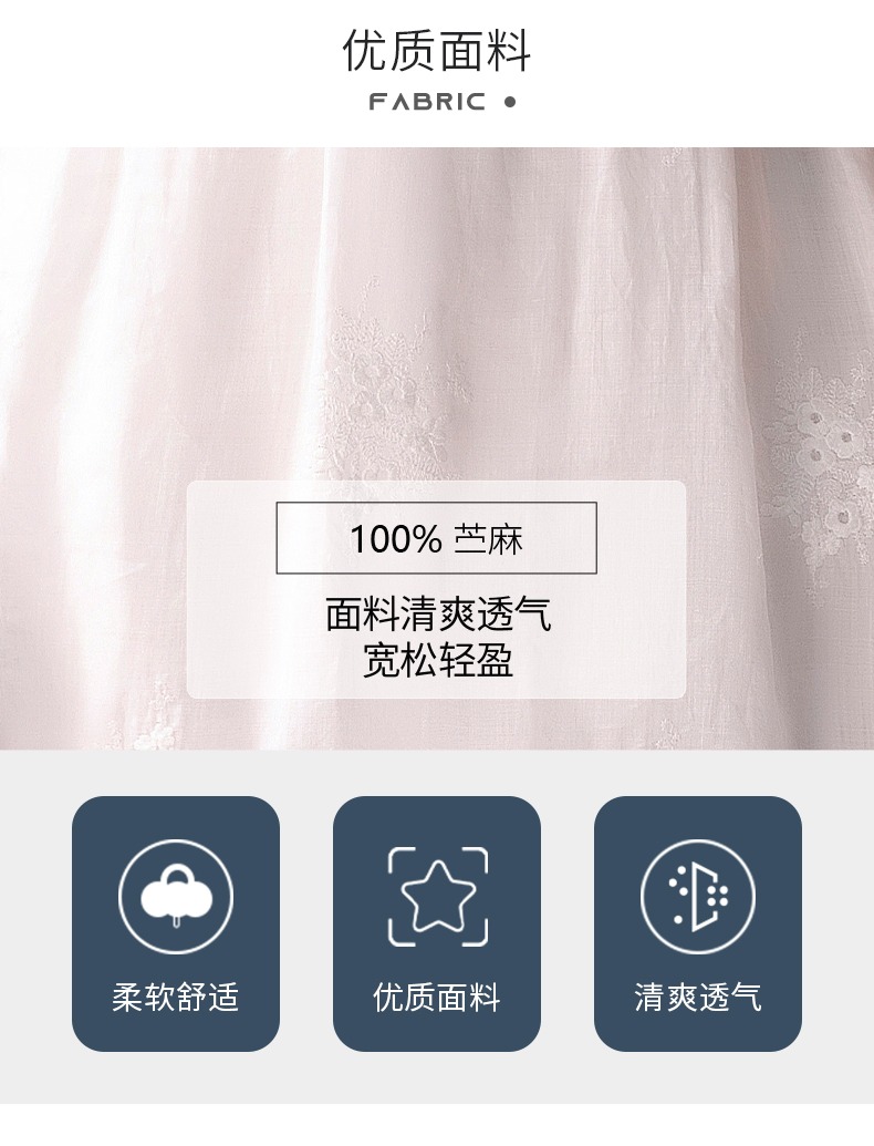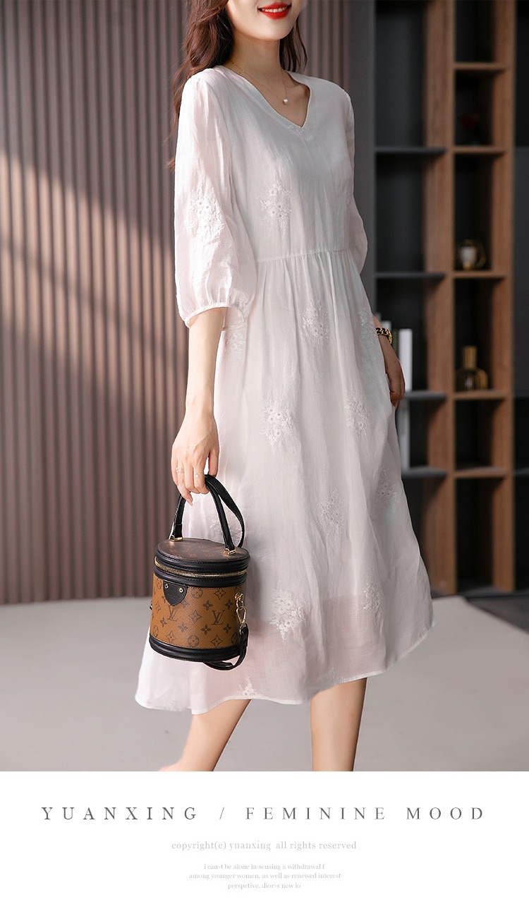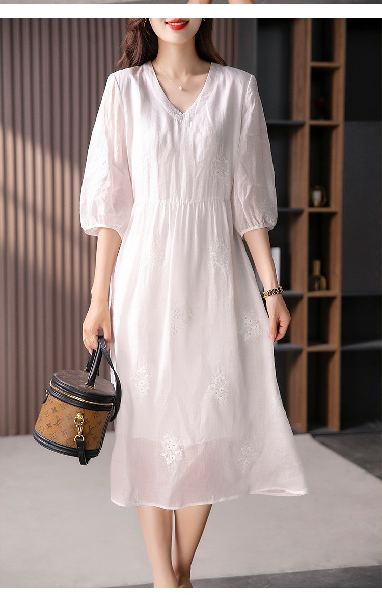 89205原形V领刺绣苎麻连衣裙女夏2024新款设计感灯笼袖绣花显瘦长裙子