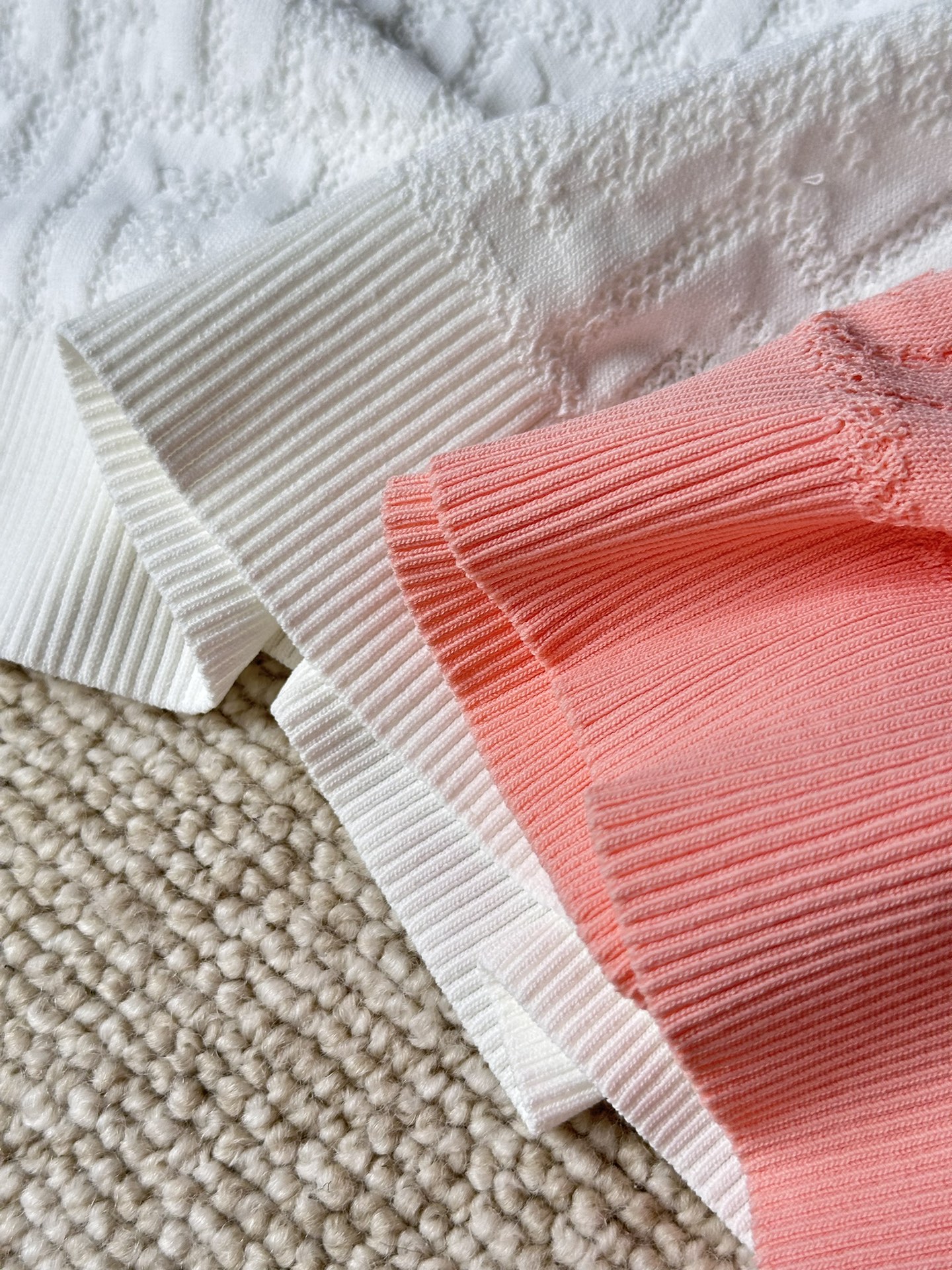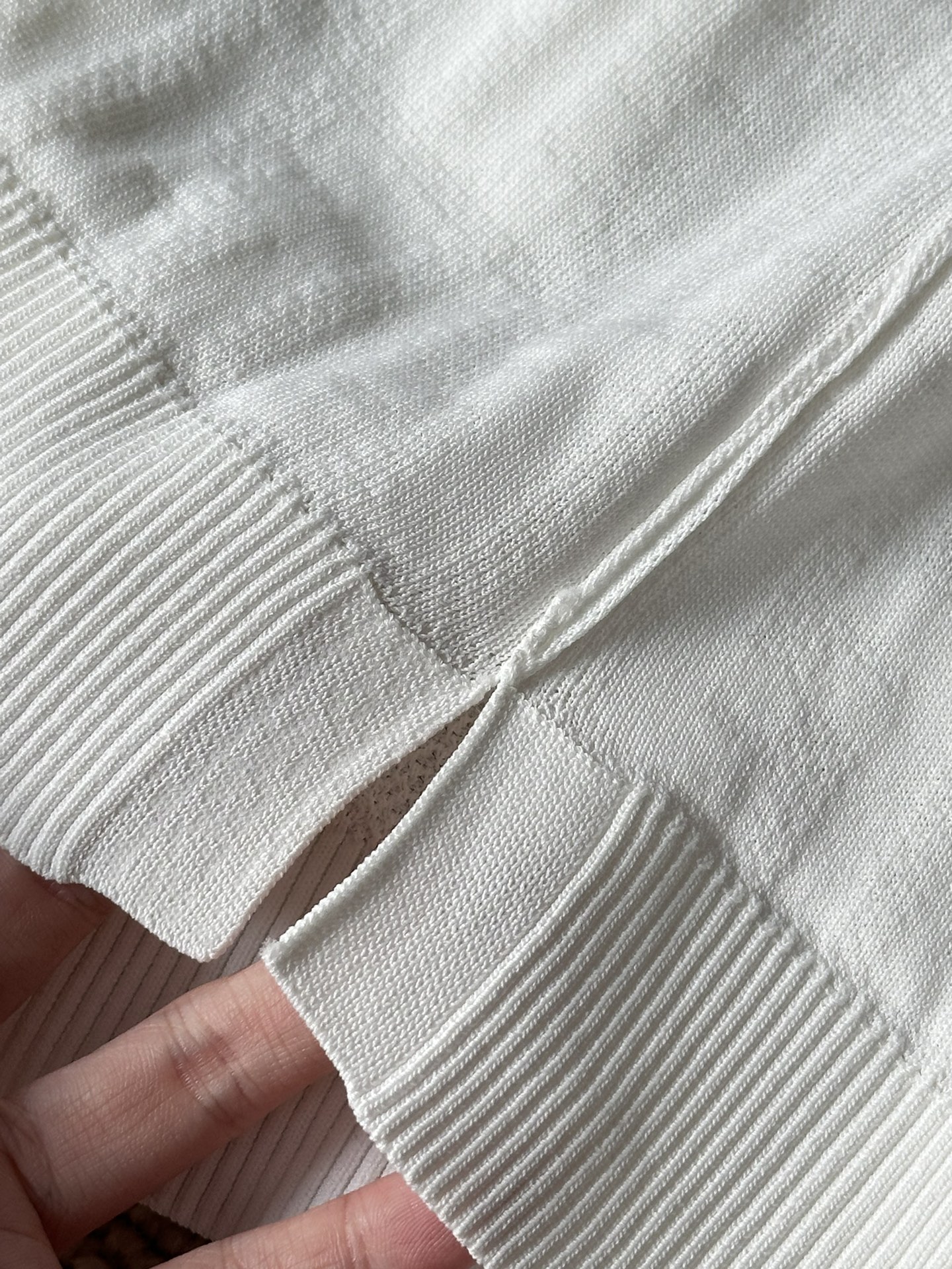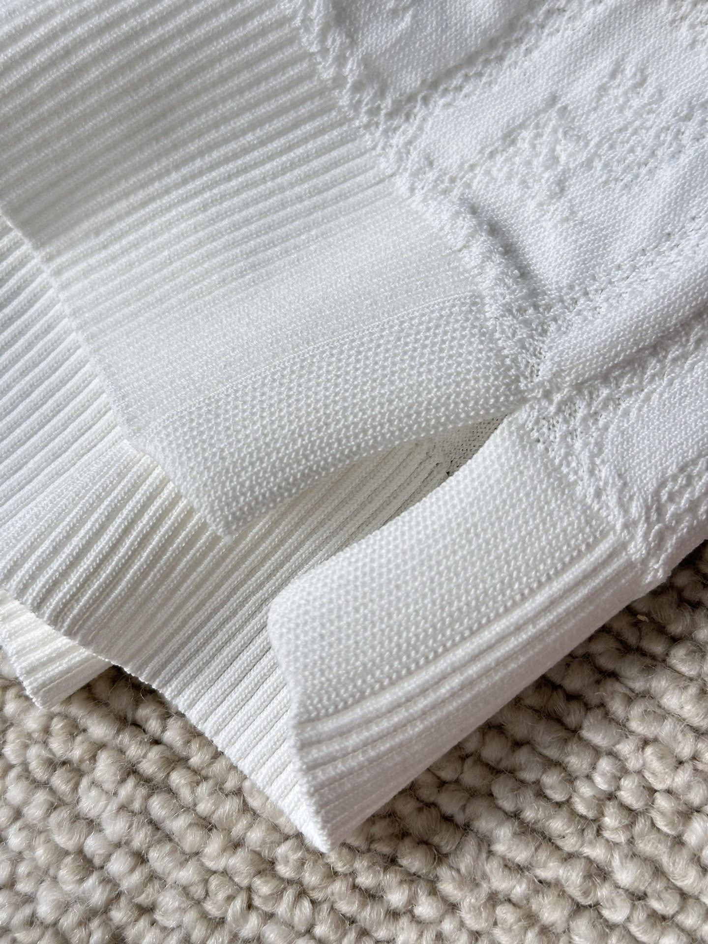 意大利进口14针细针设备织造出的全件双f挑空设计!天然高透气性属性! 上身穿着凉快舒适! 双f镂空花纹非常的温柔、气质、甜美