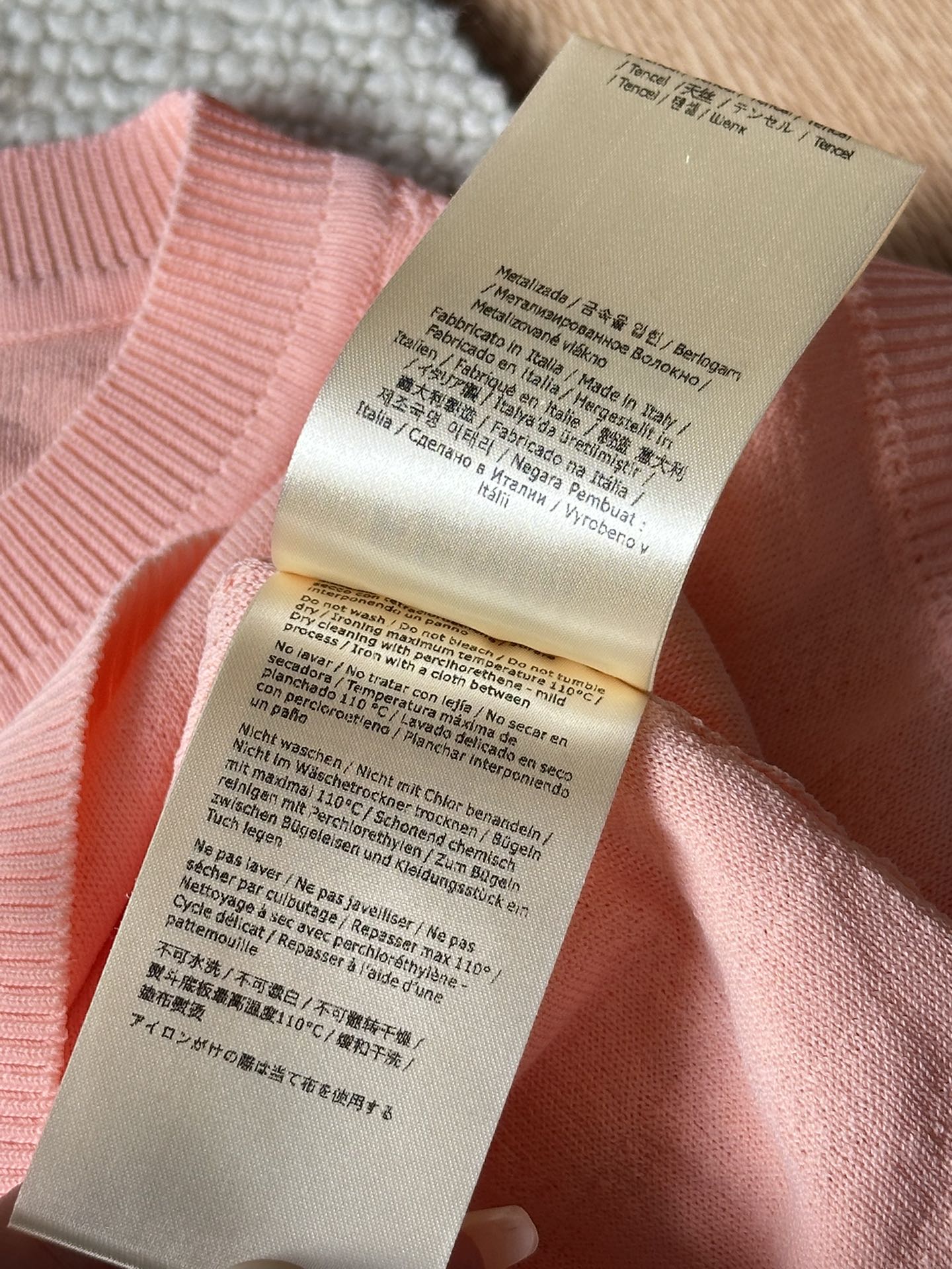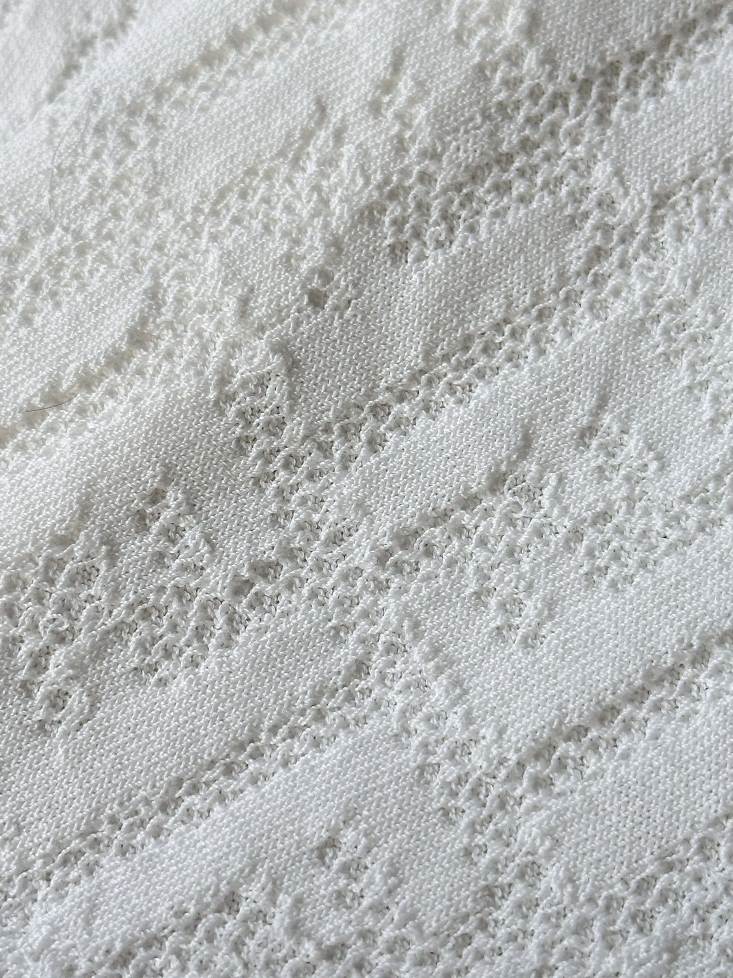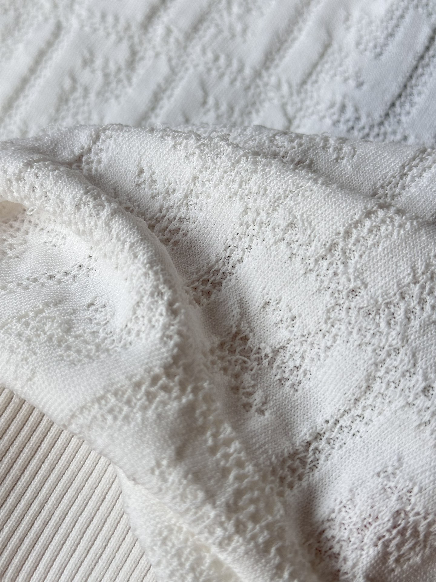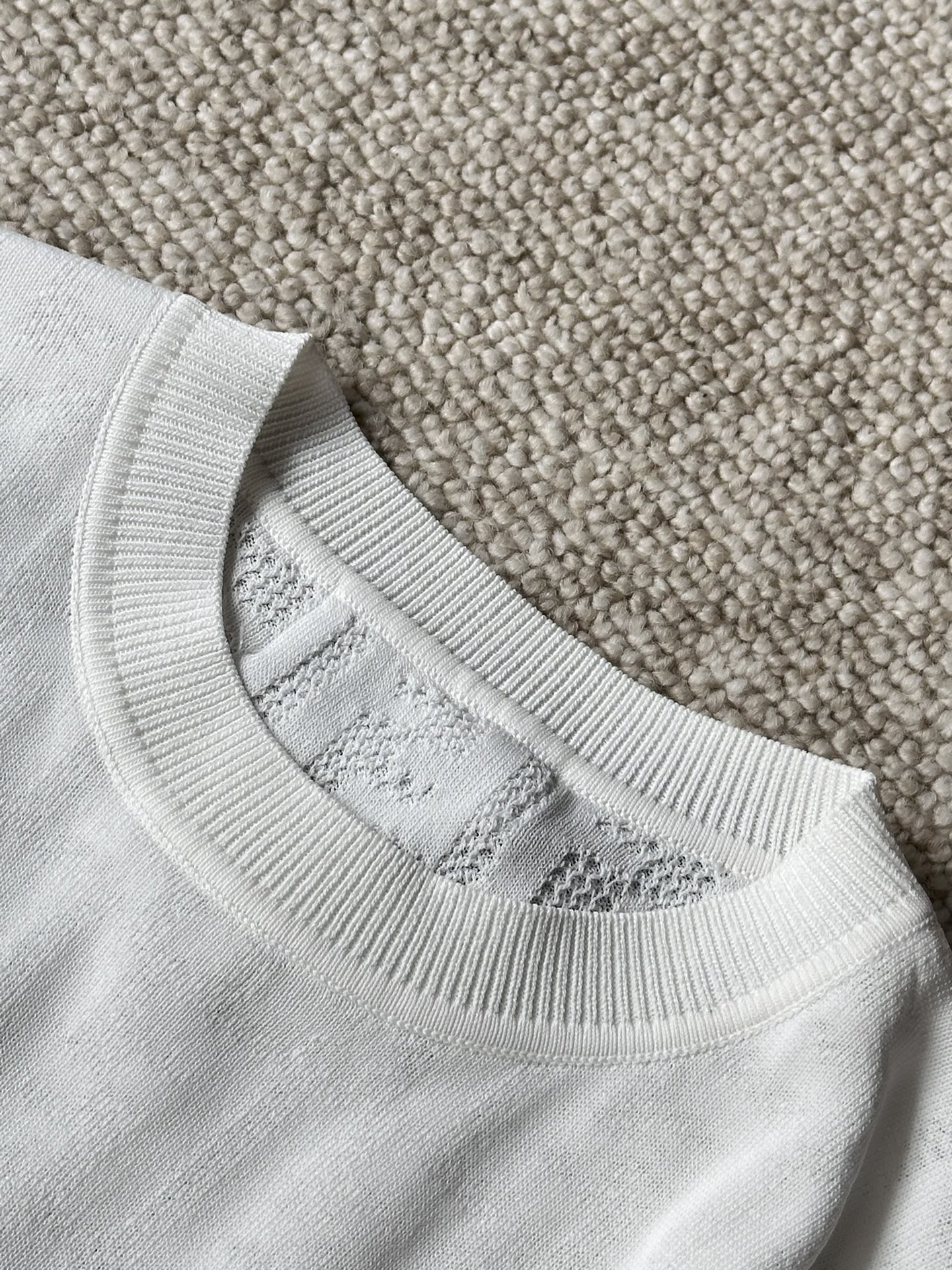 意大利进口14针细针设备织造出的全件双f挑空设计!天然高透气性属性! 上身穿着凉快舒适! 双f镂空花纹非常的温柔、气质、甜美