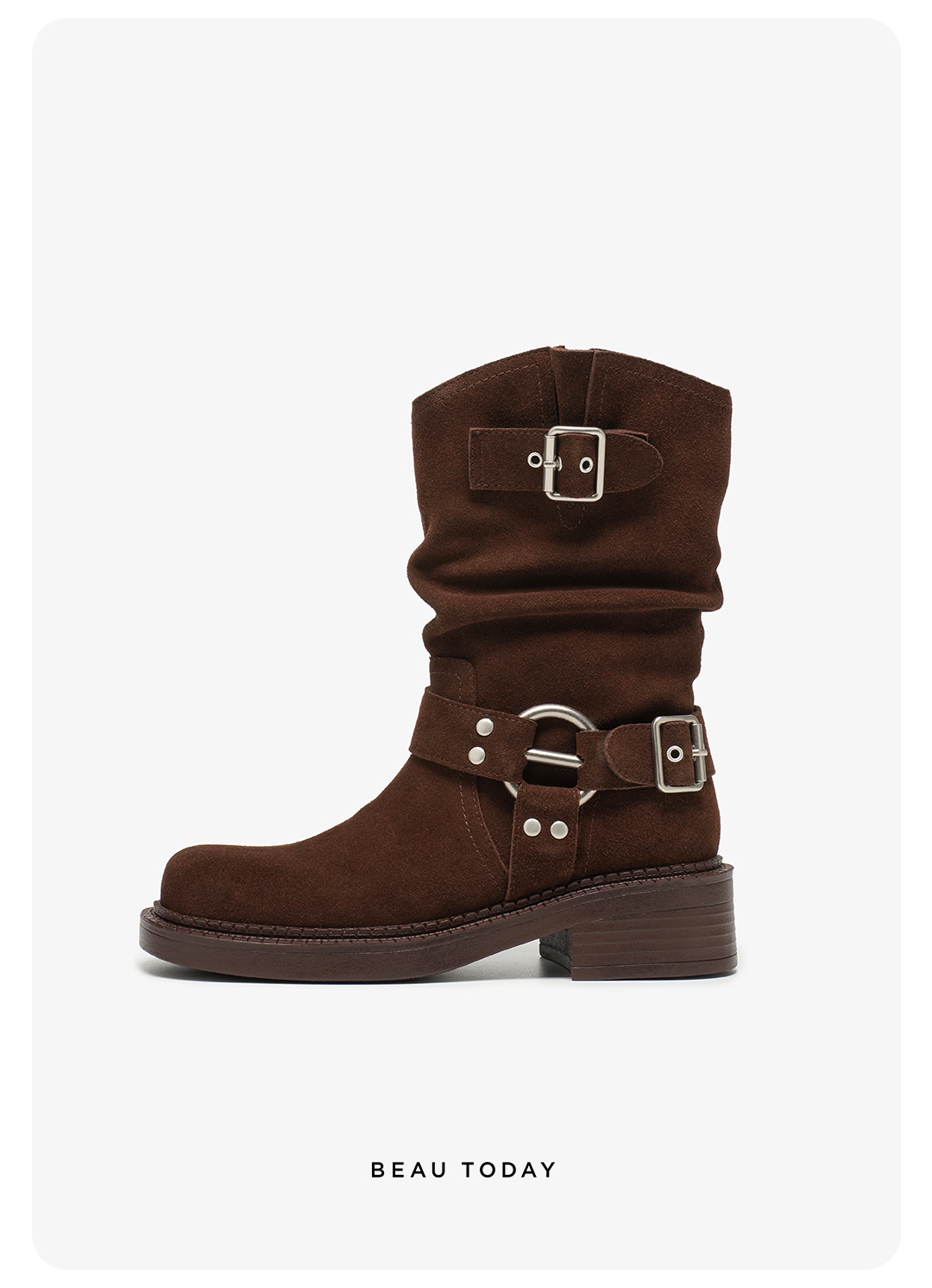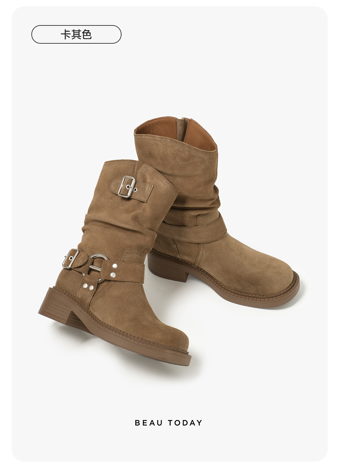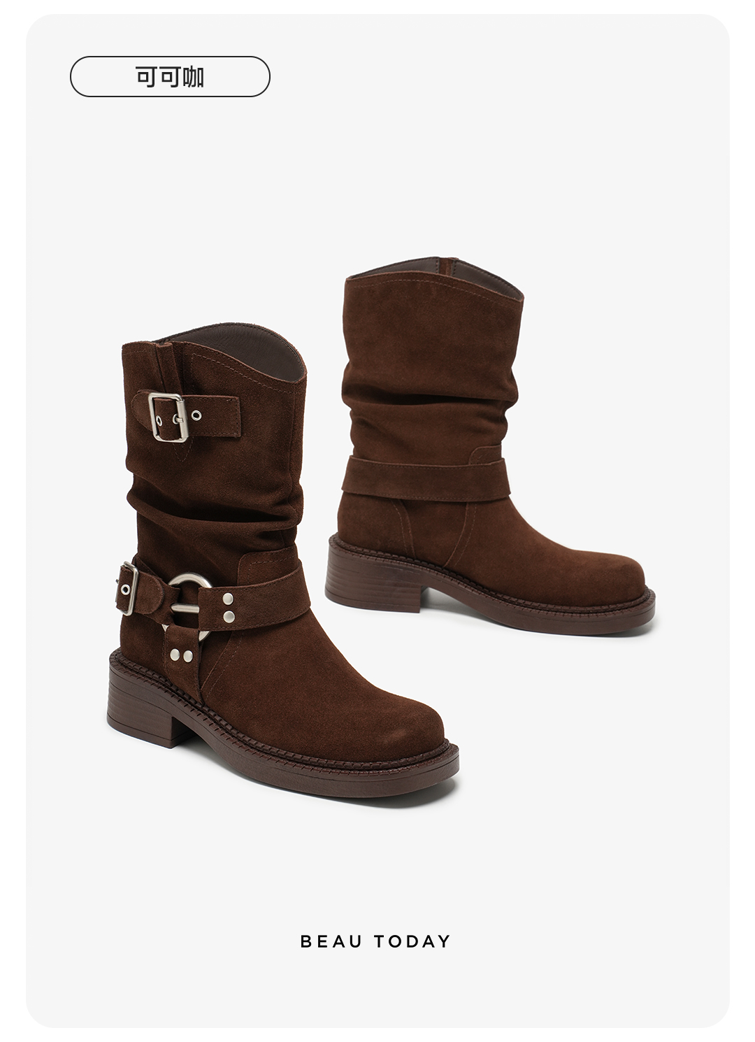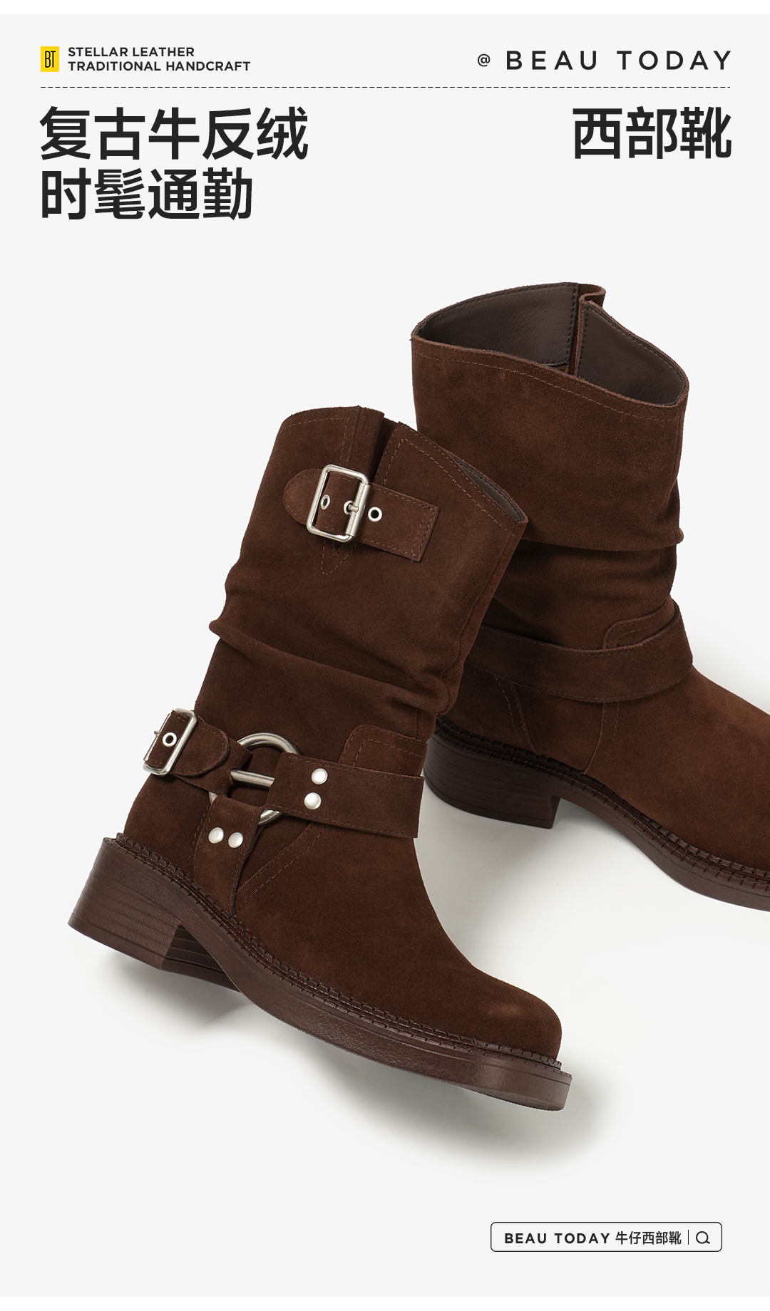 BeauToday 西部牛仔靴女复古牛反绒堆堆靴06158