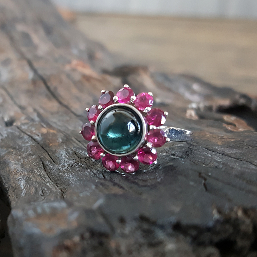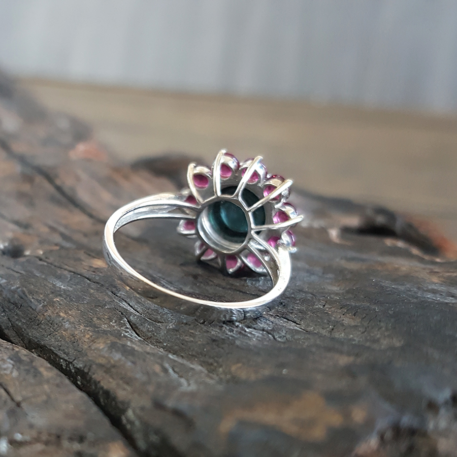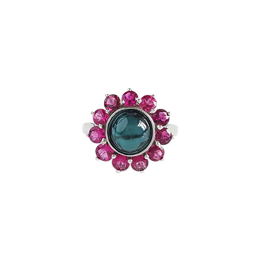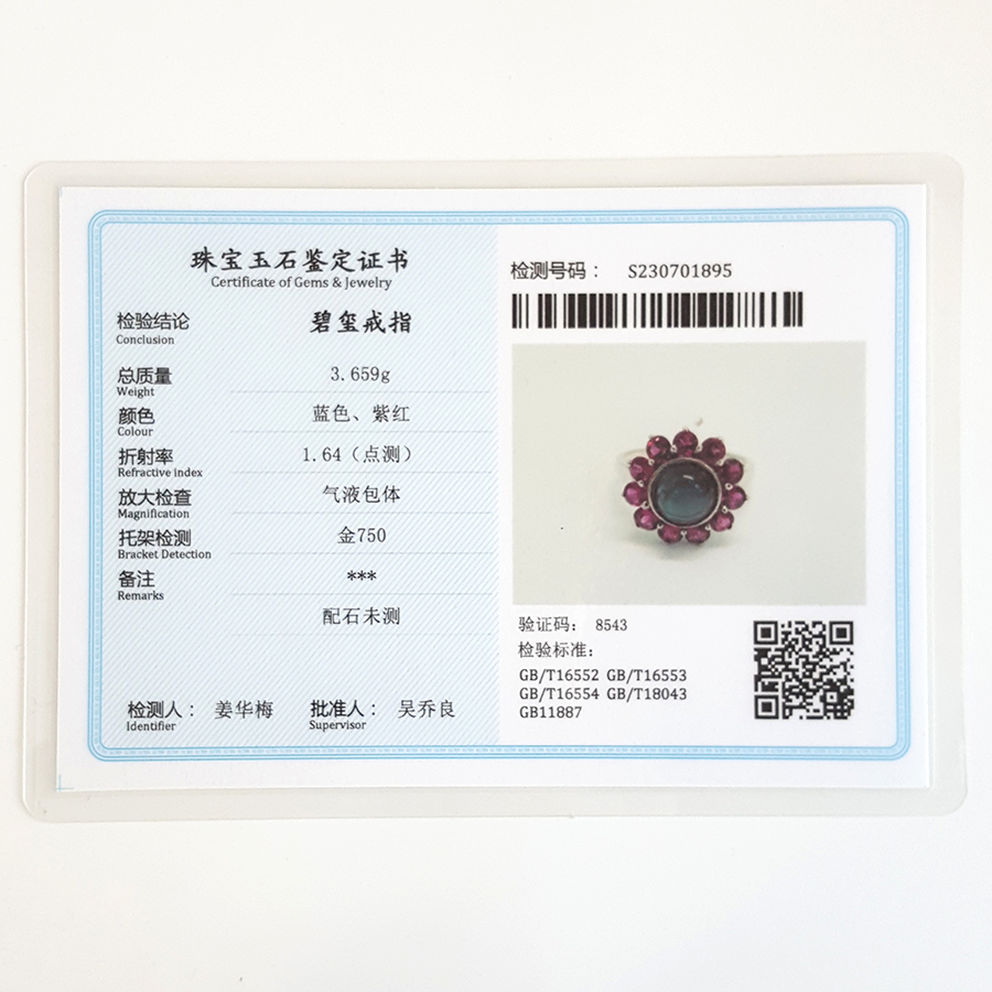 名称 | AU750白金镶钻镶天然蓝色和紫红色碧玺太阳花造型戒指 |