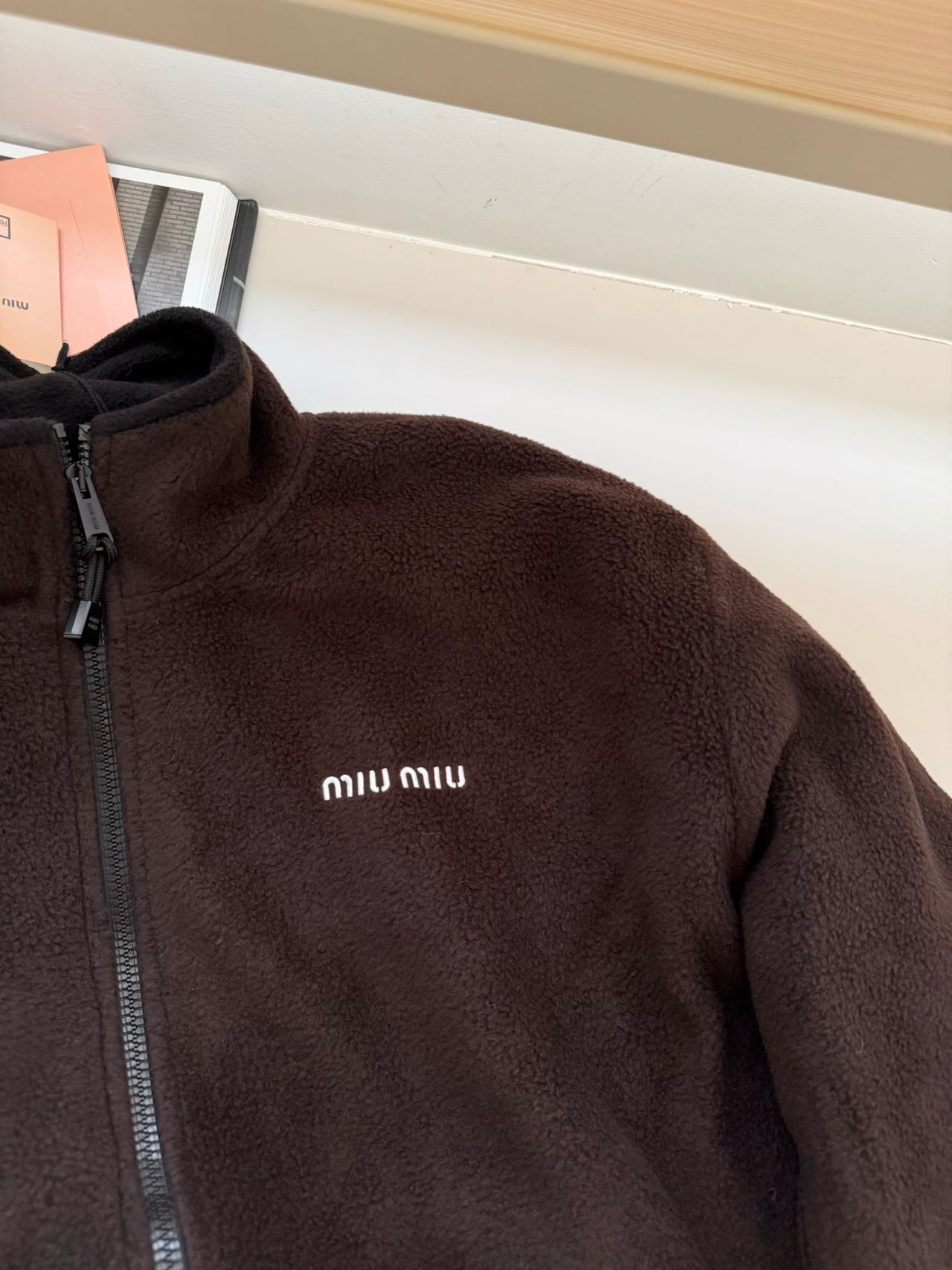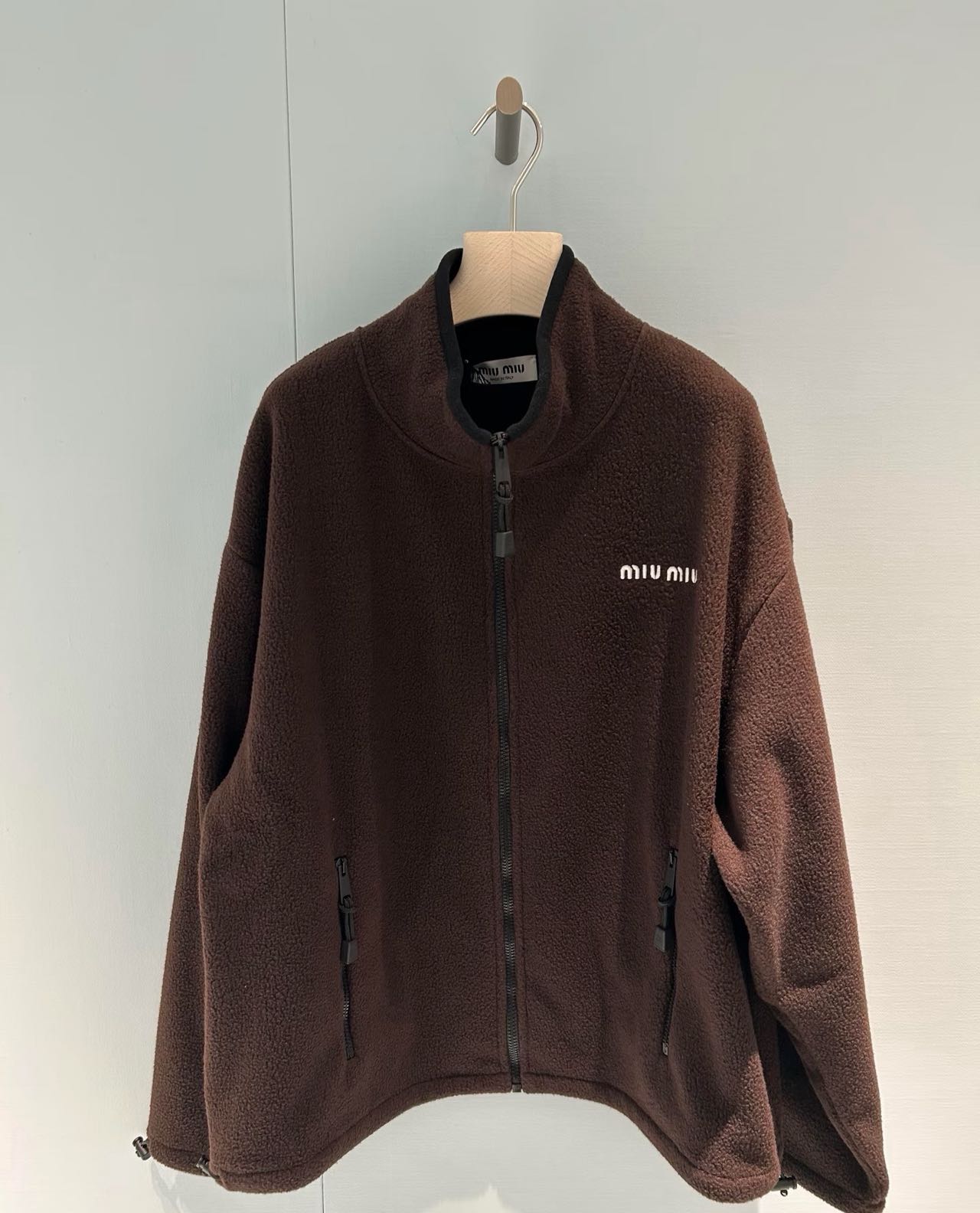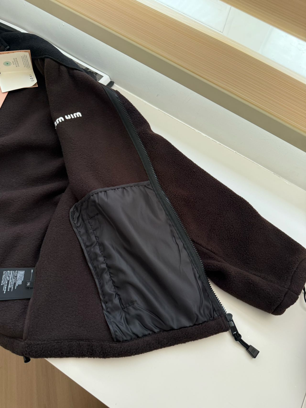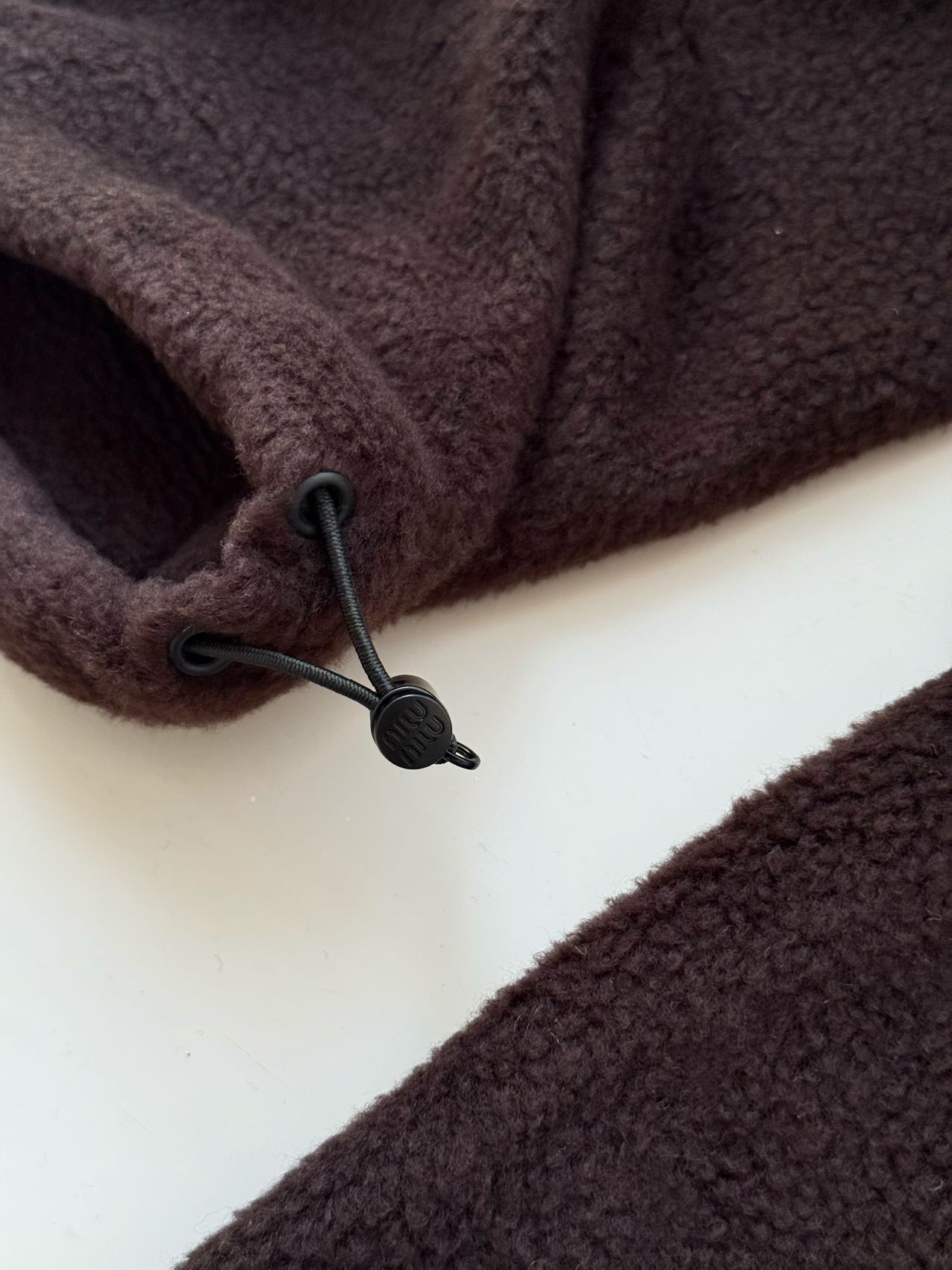 探长家 抽绳工艺:下摆抽绳为尼龙编织绳,金属头刻字“miu miu”,抽绳调节顺滑.市面大多数复刻款为普通棉绳,金属头无标识或刻字模糊。