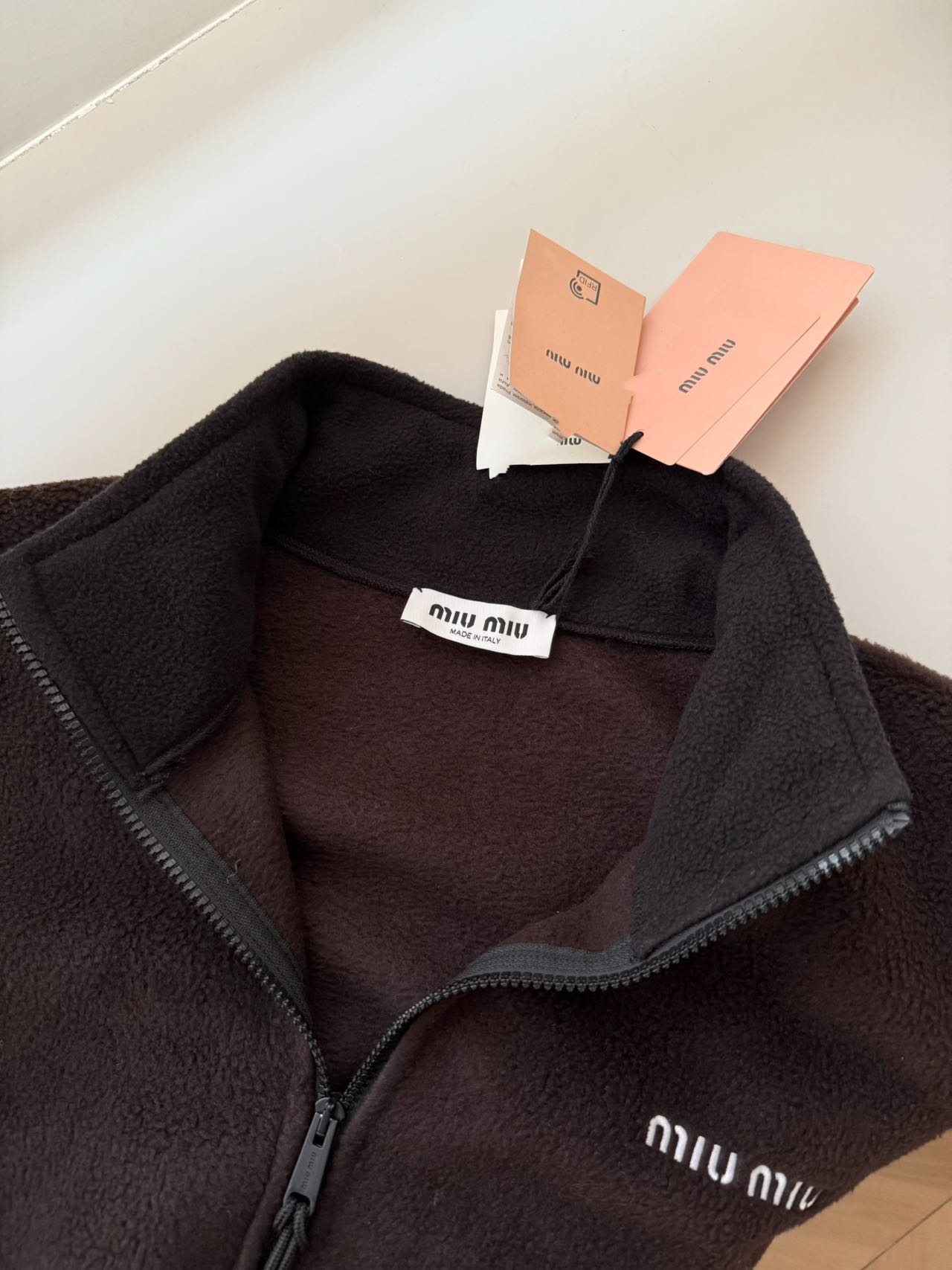 徽标工艺:对应正品,探长家采用左胸“miu miu”徽标为硅胶立体压印,厚度1mm,边缘光滑无毛刺,耐水洗不脱落;市面上大多数复刻款为印花/劣质胶印,徽标扁平,易开裂、脱落。