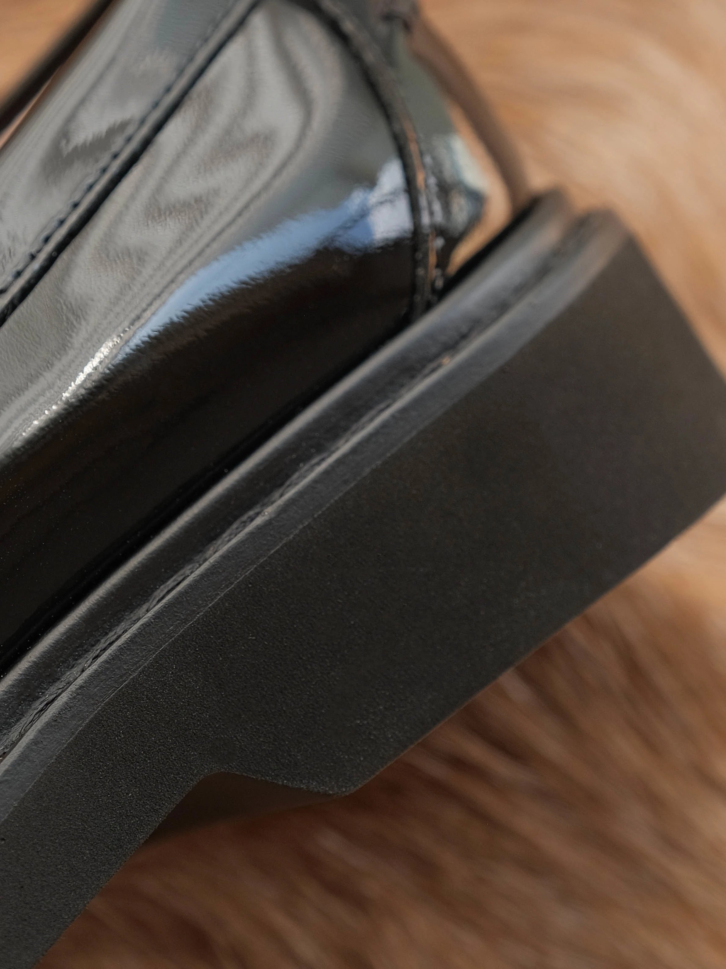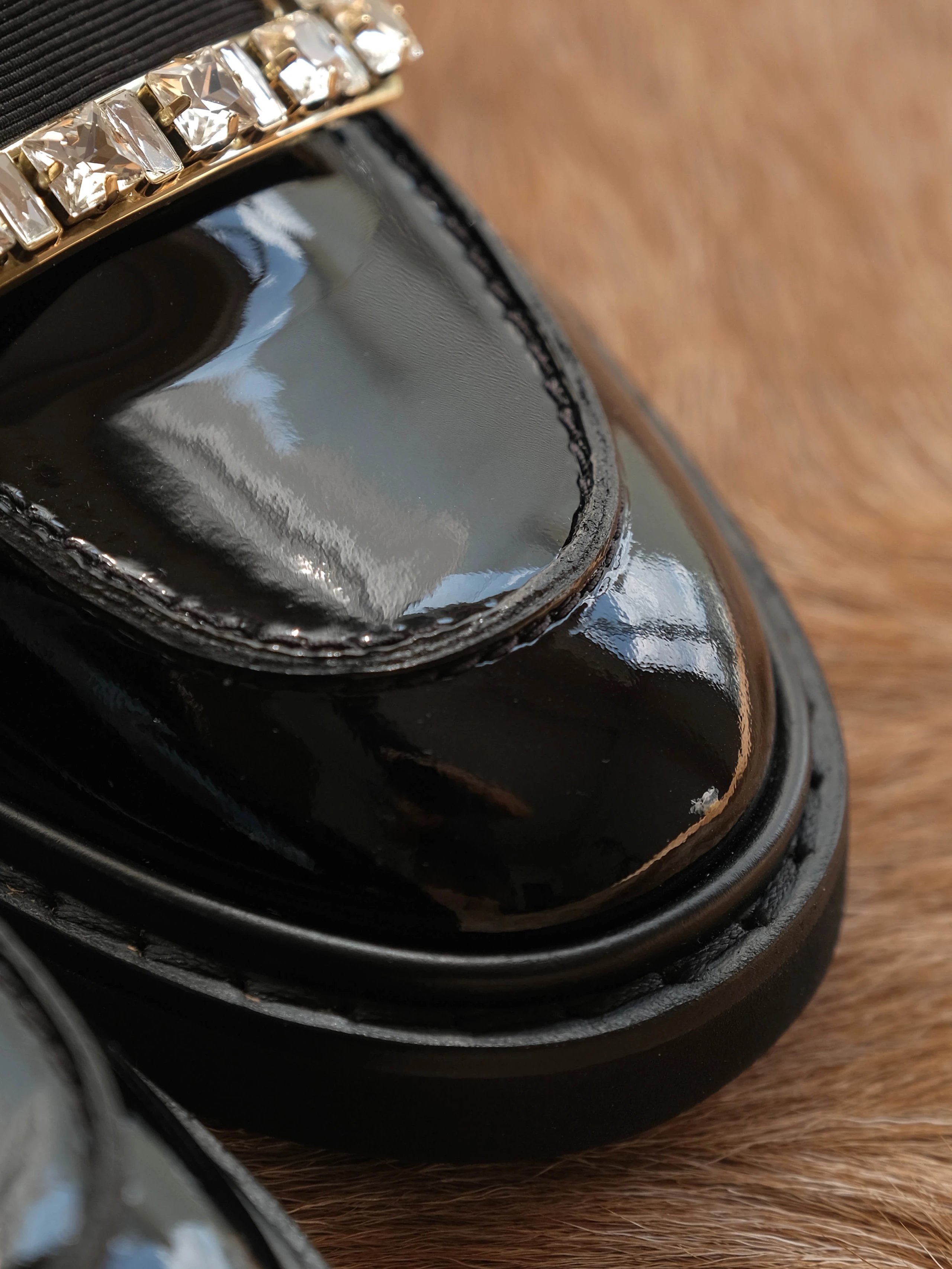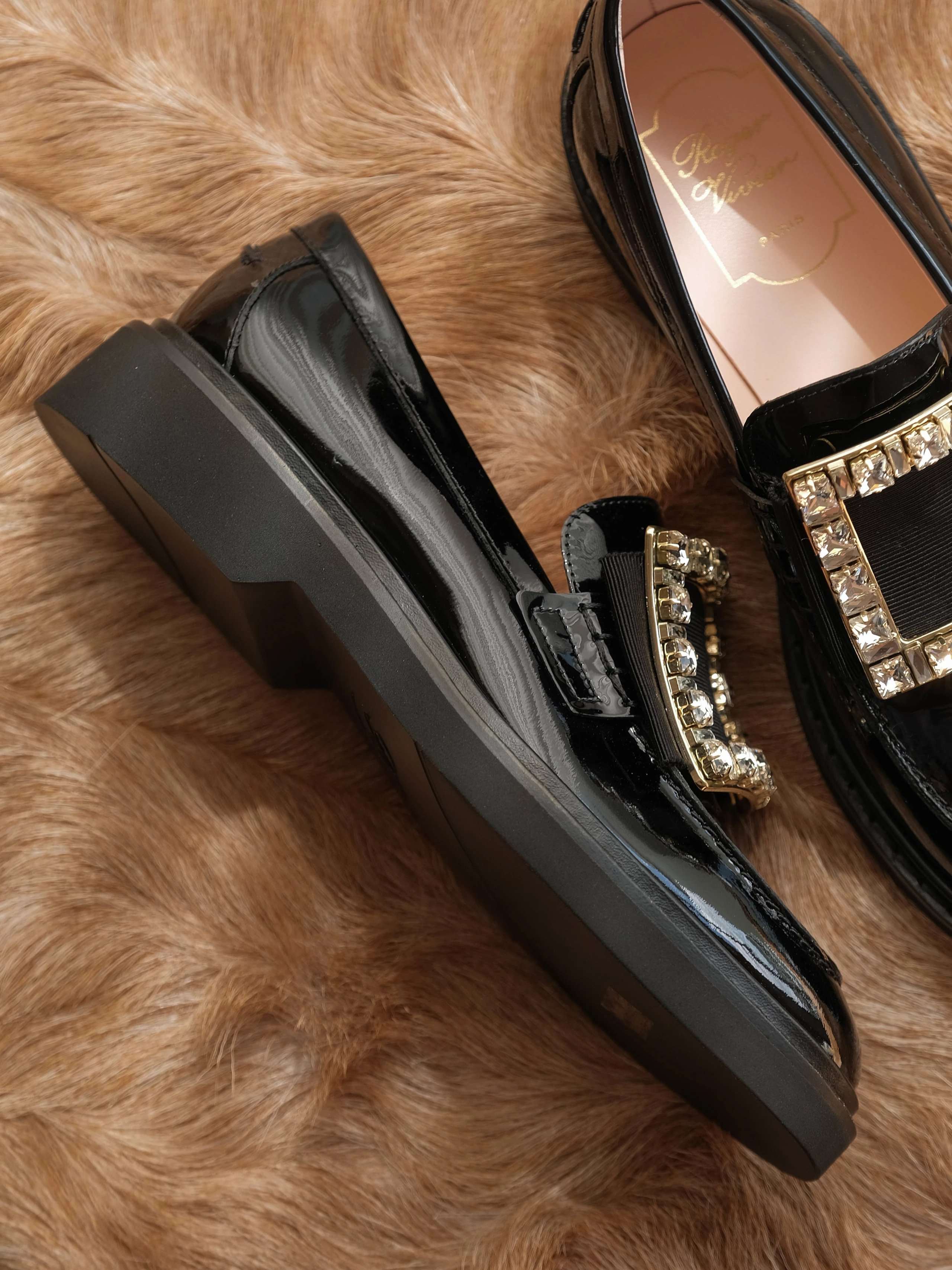 漆皮鞋面金属饰扣橡胶鞋底?