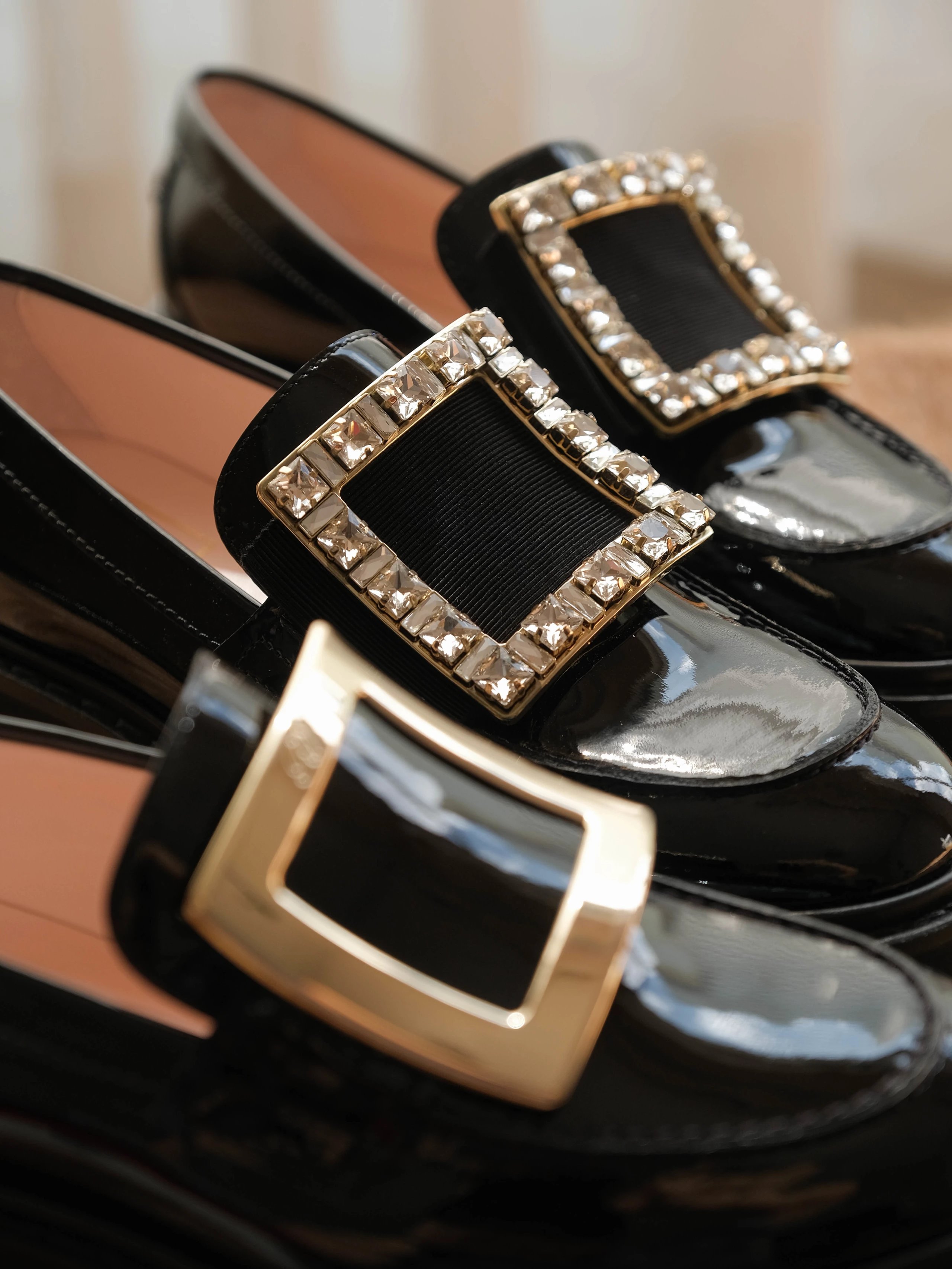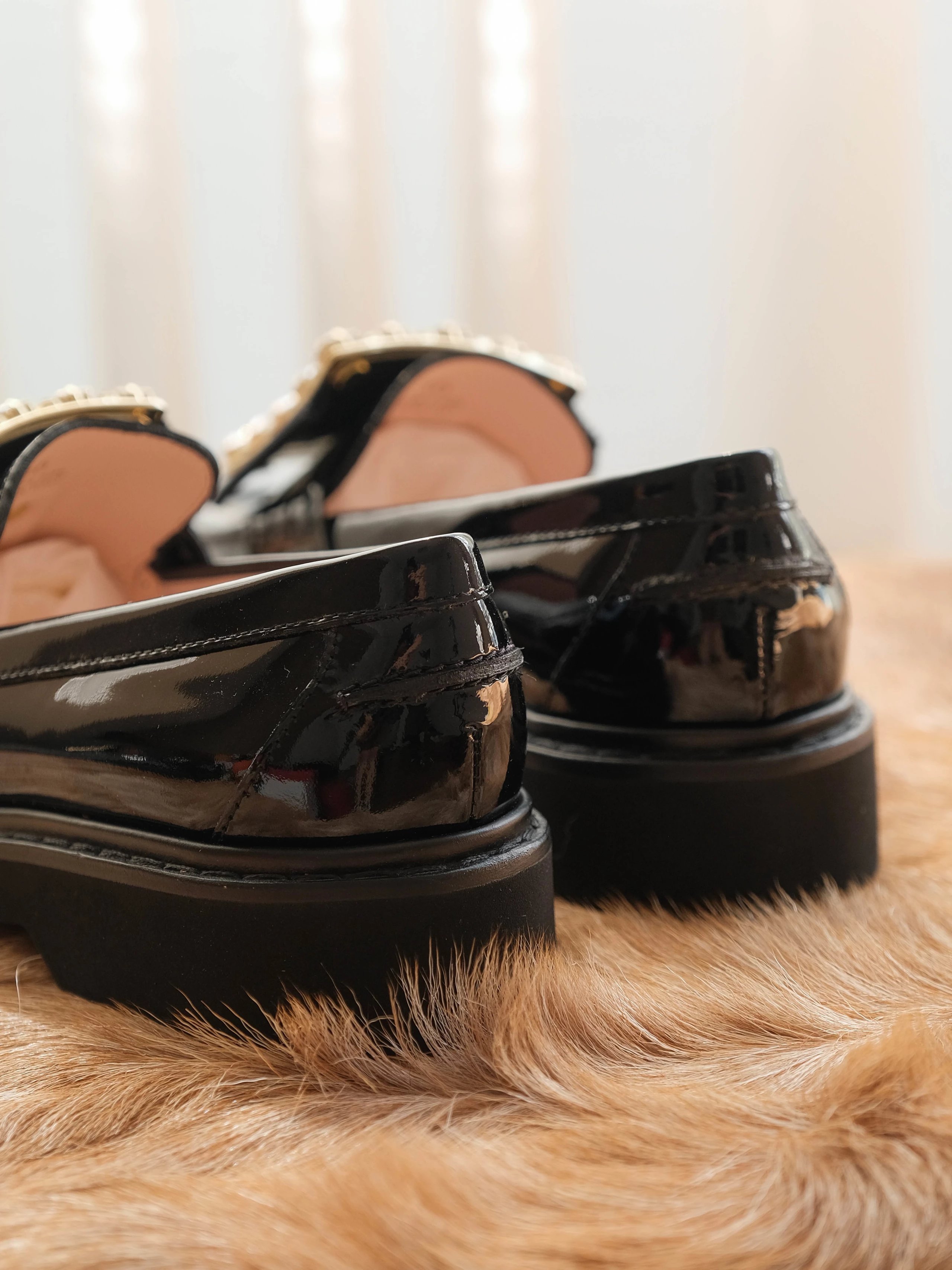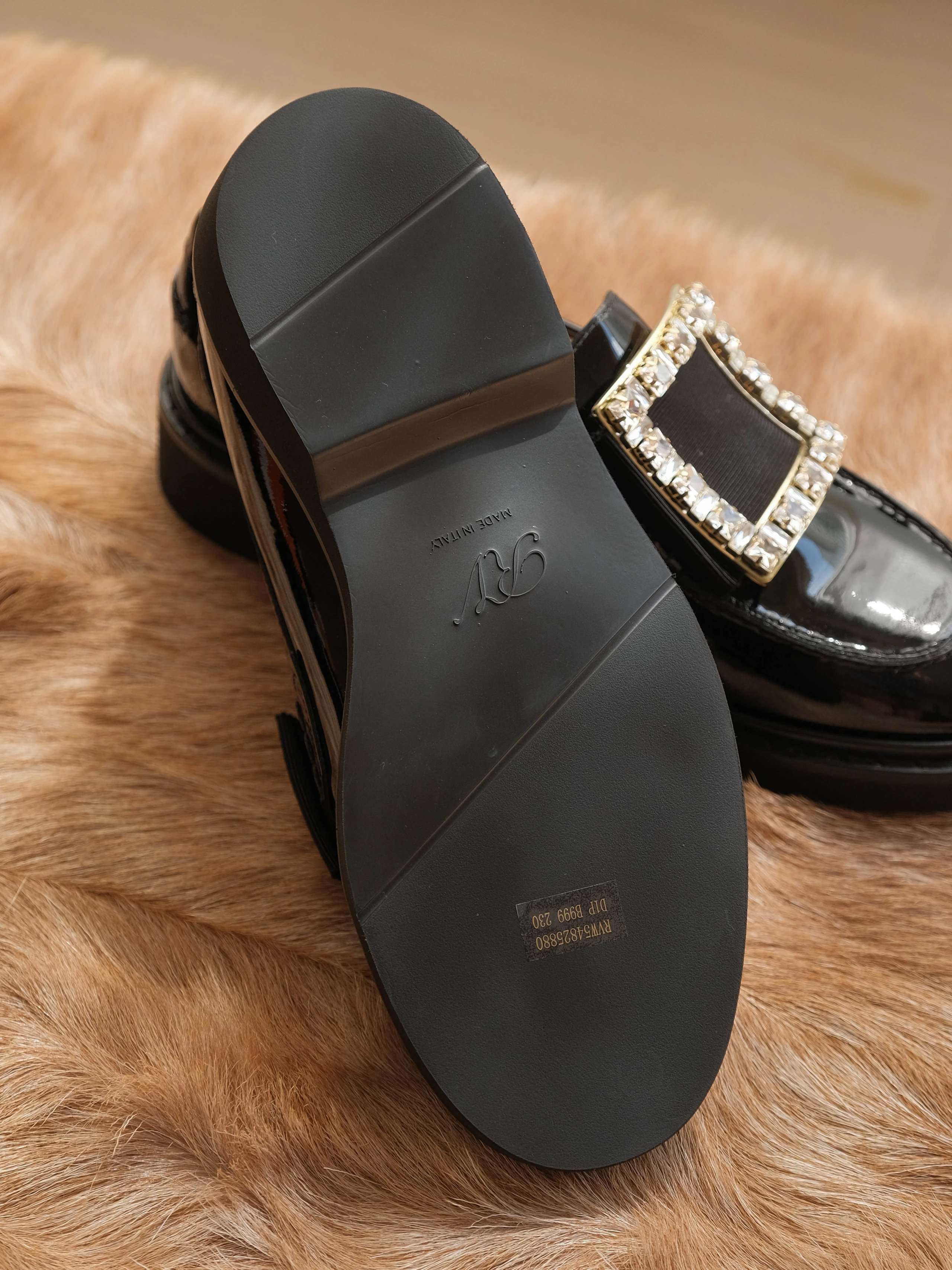 漆皮鞋面金属饰扣橡胶鞋底?