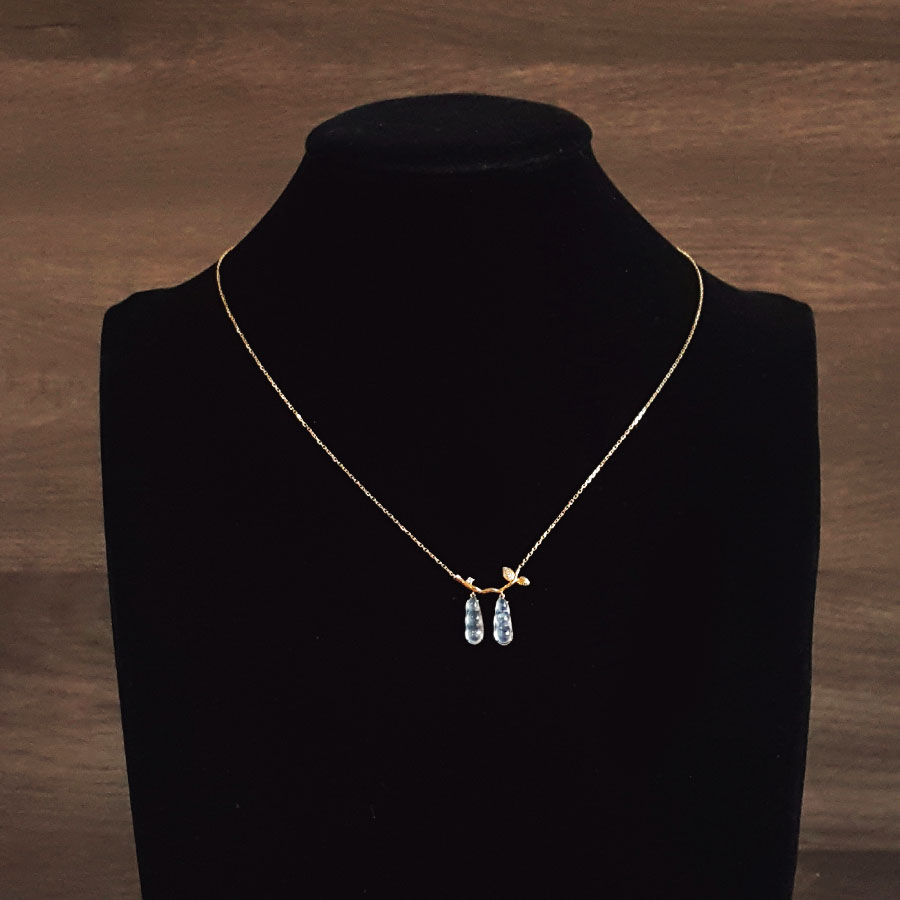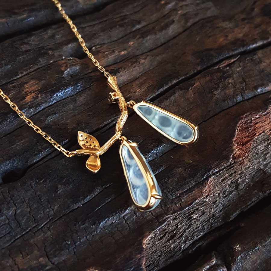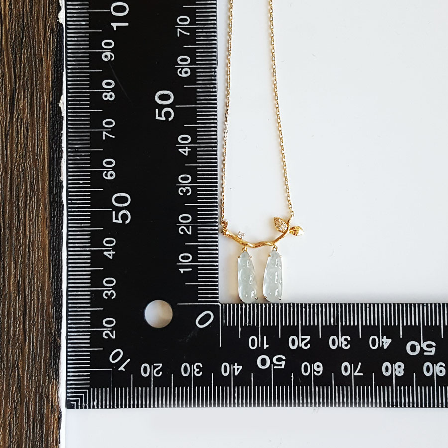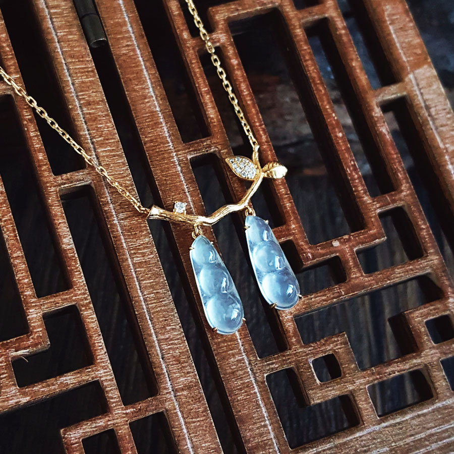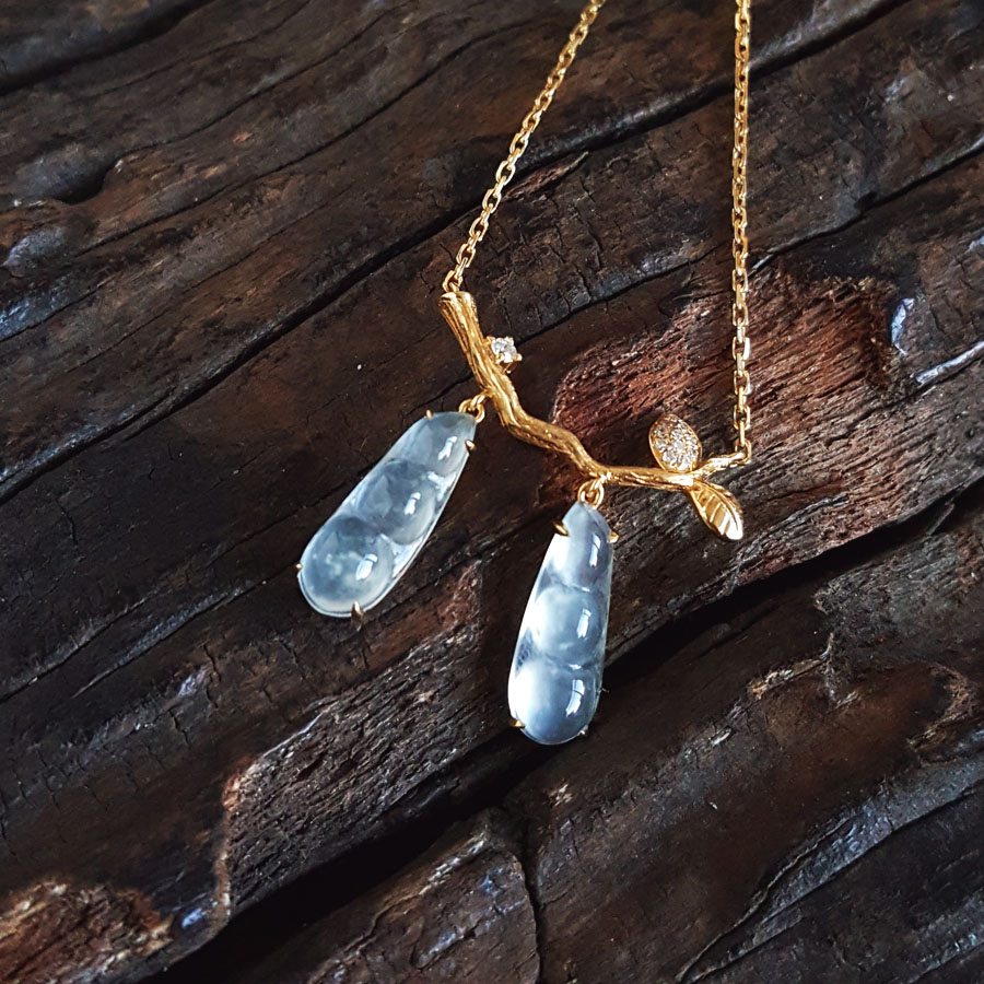 名称 | AU750黄金镶钻镶天然白色起荧高冰种金连枝福豆翡翠吊坠项链 |