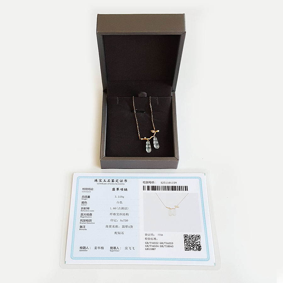 【天然正品】A货翡翠AU750黄金镶钻镶天然白色起荧高冰种金连枝福豆翡翠吊坠项链21.1*20.4*3.9MM(皆取最大值)链长:45CM(长度可调节)女士251125NJS21