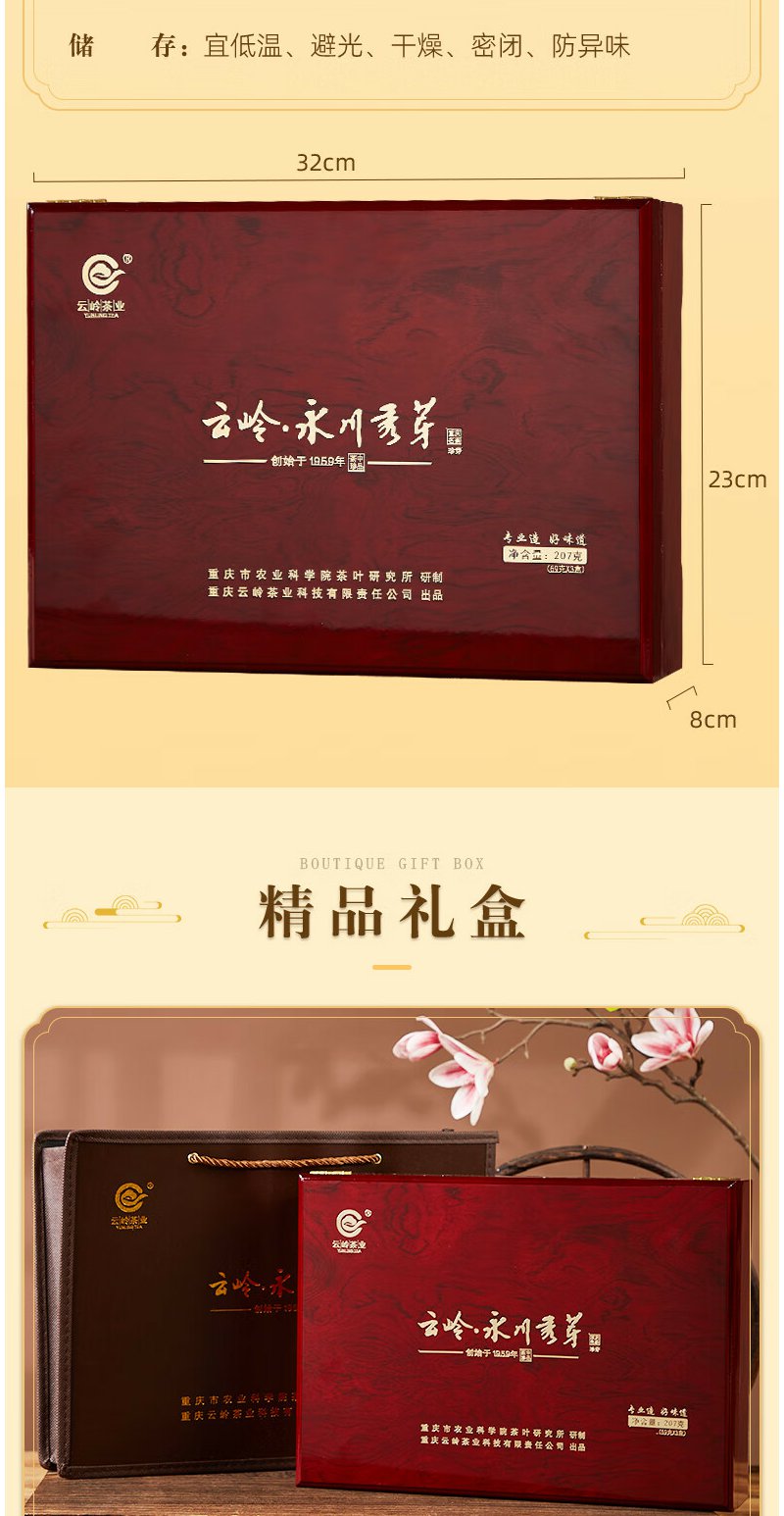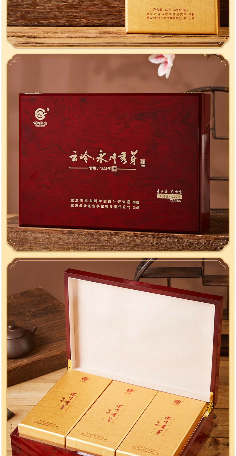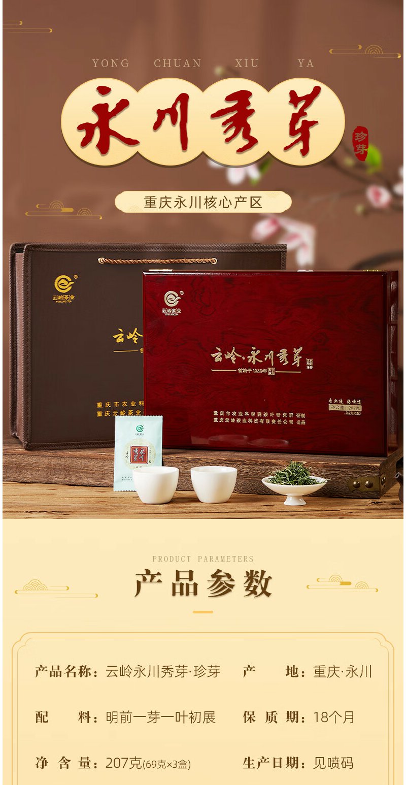 云岭茶业永川秀芽2024年新茶 明前绿茶(珍芽)茶叶礼盒装送礼207g 高档木质茶礼207g