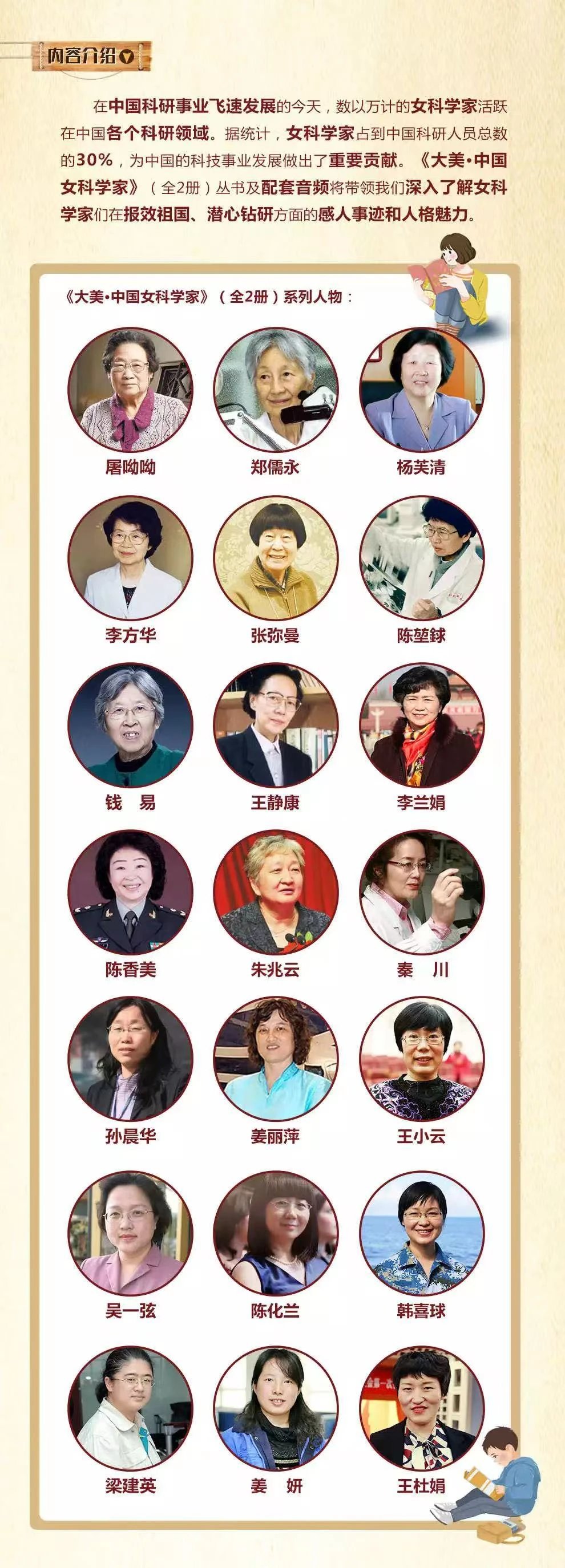 《大美 中国女科学家(全2册),讲述一批中国女科学家的人生故事,以人物短篇传记的形式来呈现她们的求学经历、科研历程,来呈现她们如何平衡工作与家庭的故事,力图以真实故事的形式,展现中国当代杰出女科学家“爱国、创新、求实、协同、人梯”的精神风貌,号召青少年爱科学,学科学,以当科学家作为自己的人生理想。本丛书的出版,旨在继承发扬的基础上凝练新时代中国科学家“爱国、创新、求实、协同、人梯”精神的新内涵,广泛宣传女科学家胸怀祖国,服务人民的情怀;敢为人先,坚毅执着的精神;淡泊名利,忘我奉献的情操;精益求精,真诚执着的人格。