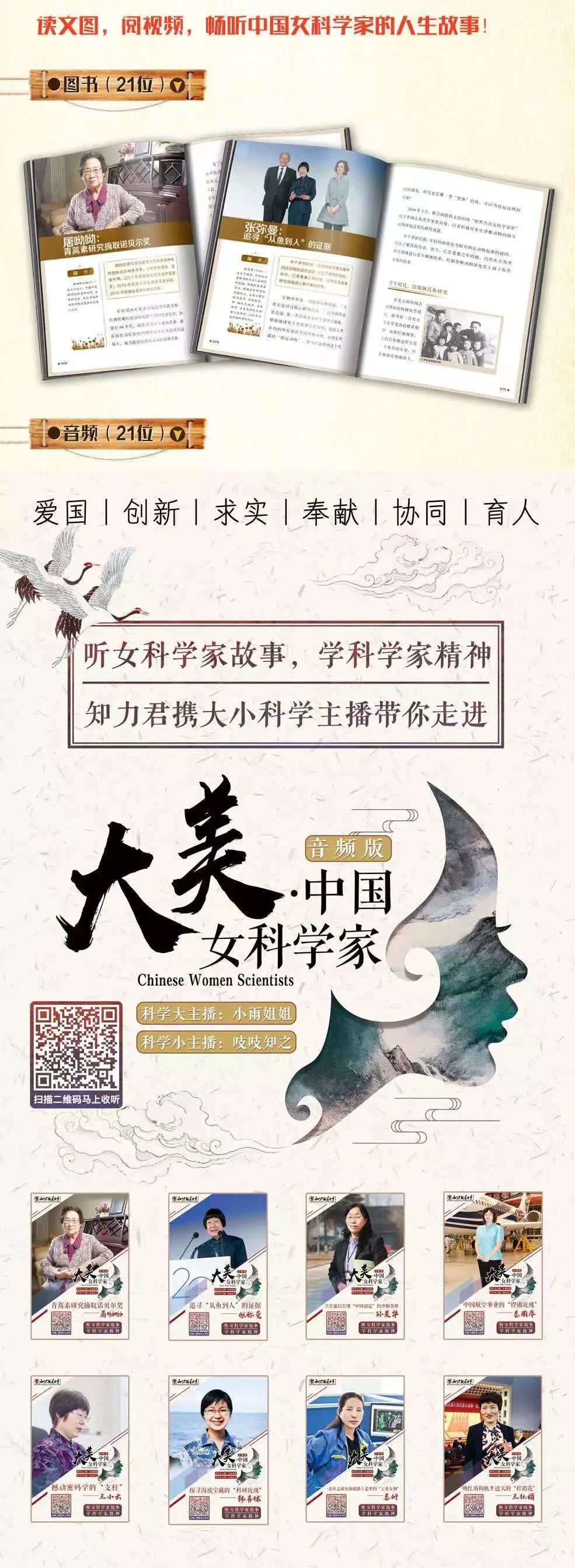 所谓“巾帼不让须眉!”“妇女能顶半边天!”在中国科研事业飞速发展的今天,数以千万计的女科学家活跃在中国各个科研领域。据统计,女科学家占到中国科研人员总数的30%,为中国的科技事业发展做出了重要贡献! 时值新中国成立70周年、改革开放40周年、中国科协成立60周年之际,由中国科学技术协会出品,中国科协常委会女科技工作者专门委员会和中国女科技工作者协会统筹策划出版了《大美?中国女科学家》系列丛书,传播科学知识,弘扬科学精神,进一步带领我们深入了解女科学家们在报效祖国、潜心钻研方面的感人事迹和人格魅力。