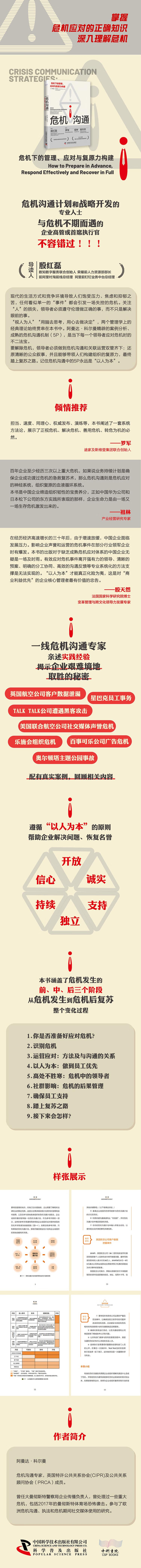 我在危机处理和针对突发事件进行有效沟通的领域已从业多年,很渴望能以某种方式分享个人经验并帮助其他危机沟通专家。有时我几乎每天都要应对新的危机,这已成为我的生活常态。但对于公共关系和传播领域的众多专业人士来说,其职业生涯可能只是遭遇过一次危机,但那会使他们猝不及防地陷入一种高风险、高压力的境地。希望本书能促使人们居安思危。本书将主要探讨企业应该如何投入时间以准备应对随时可能来临的黑暗时刻。 以我的全部经验来说,人们通常并不能充分考虑到危机沟通的所有方面。一言以蔽之,一切问题的关键可归结为:我们面对的是“人”。我们可能会花时间制订方案、计划或程序,但可以相当确定的是:这些方案、计划或程序都没有被充分考虑到其对“人”产生怎样的影响。这里说的“人”不仅包括企业的内部员工,还包括那些受到危机影响的人,后者同样重要。这些都是我们要关注的方面。同时,我也很鼓励人们尝试新的危机沟通的方式。 本书内容涵盖了危机发生的前、中、后三个阶段,包括从危机发生到危机后复苏的整个变化过程。我将提供有关思考与行动的详细指导和提升危机应对能力的诀窍,旨在帮助大家顺利度过每个阶段。此外,我还会提供案例来详细阐明部分企业在何处做出了危机应对,并且指出它们何处应对得当以及何处尚需改进。 书中的建议将对从事危机沟通计划和战略开发的专业人士有所帮助,与此同时,也会对那些难免与危机不期而遇的企业高管或首席执行官有所裨益。制订危机沟通的有效战略,首先要掌握危机应对的正确知识并且深入理解危机。 如果你已经准备好了,现在就投入学习吧!