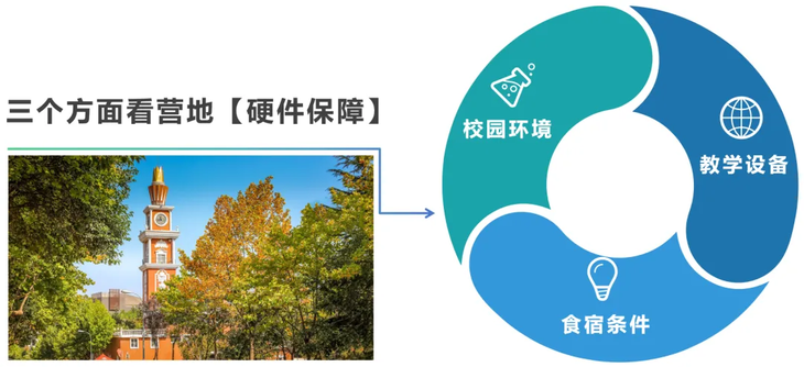 夏(冬)令营营地设立在大学校园内,全封闭营地,环境优美,配套设施完备,为孩子提供一个既有学术氛围又有安全保障的全封闭营地。