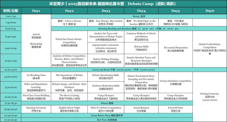 6天5夜封闭浸泡式环境,采用小班制教学,配备资深辩论教练与专家老师,结合理论与实践,帮助学员在思辨中成长,在表达中自信。夏令营不仅注重辩论技巧的训练,还融入跨学科知识,培养学员的逻辑思维、团队合作与问题解决能力,助力他们成为未来社会的思想引领者。