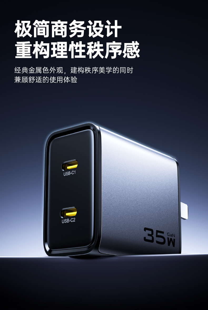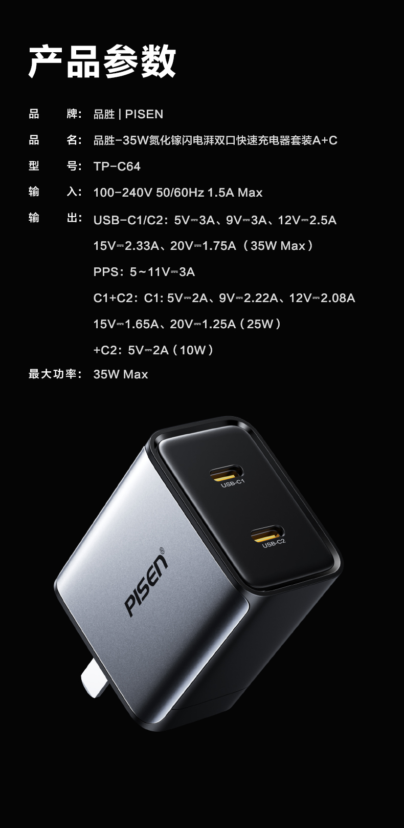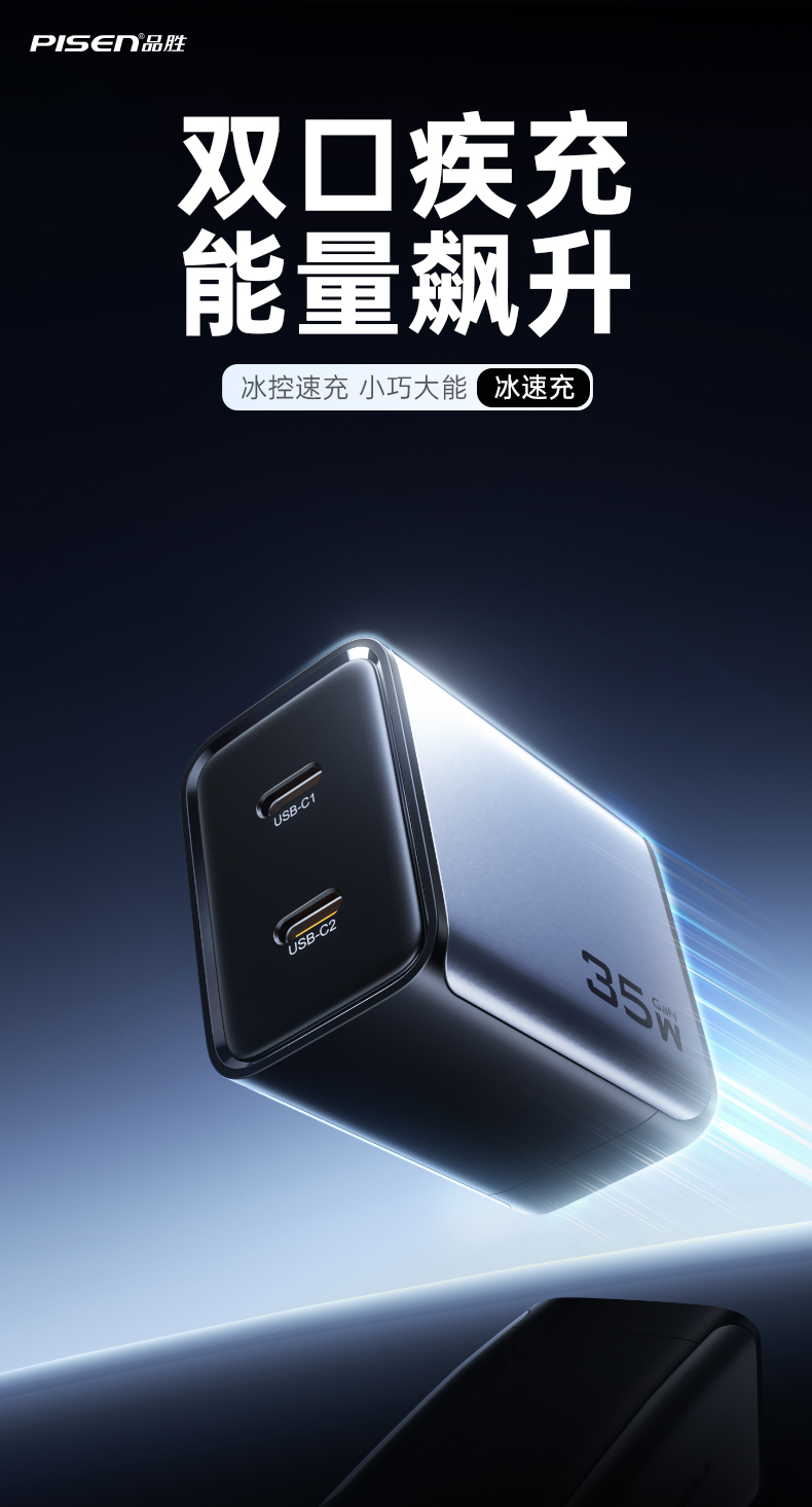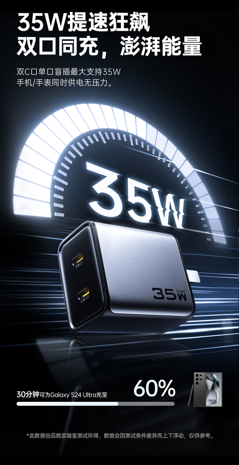 品胜 35W氮化镓闪电湃双口快速充电器2C苹果16充电头30W快充插头Type-c适用iPhone16/15/14华为小米手机平板小巧