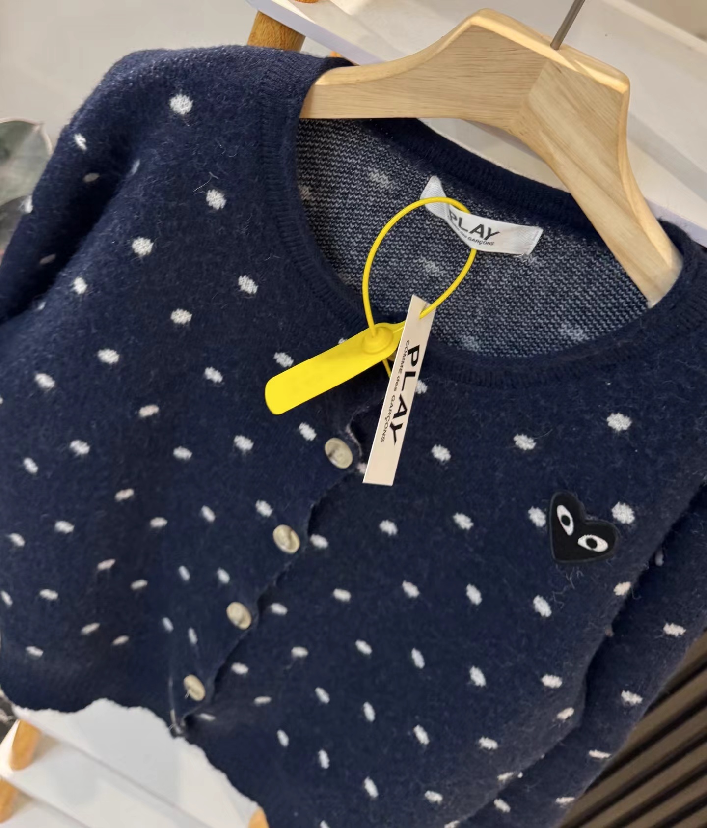 波点针织开衫,整体风格清新减龄,兼具日系松弛感与品牌标志性的辨识度。采用短款宽松版型,对身材包容性强,圆领+单排扣设计简约利落,既可以单穿,也能作为叠穿内搭,适配春秋季多种穿搭场景藏青色底色搭配满印的白色小波点,营造出俏皮温柔的视觉效果;胸口点缀品牌标志性的黑色爱心Logo,在清新风格中融入了品牌辨识度。针织面料柔软亲肤,保暖性适中,袖口与下摆的罗纹收口设计贴合身形,既提升了穿着舒适度,也增强了整体的jing致感。内搭的白色基础款T恤弱化了波点的视觉繁复感,下身搭配灰色半裙延续了日系简约调性,整套搭配色彩柔和、风格统一,轻松打造出清新甜美的日常造型。