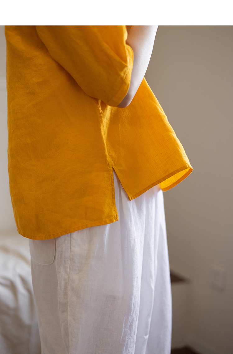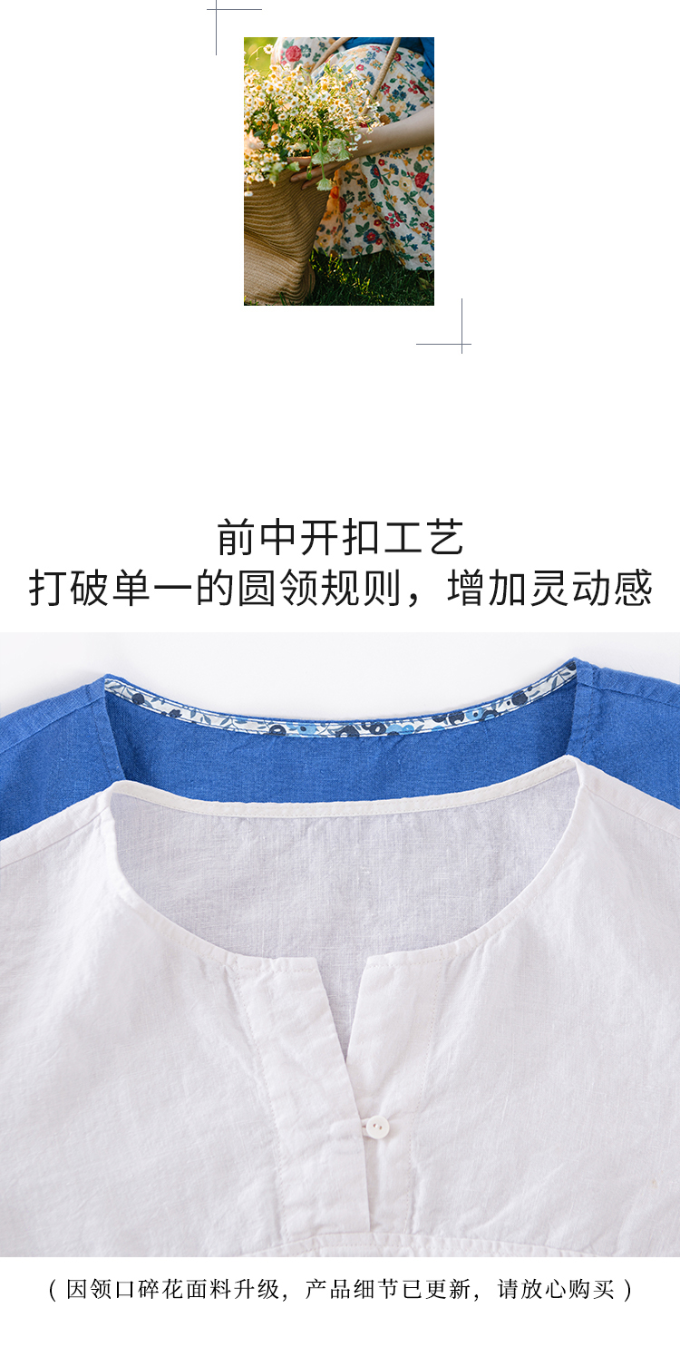 绽放旅行女装360+182朵/文艺短款v领分割短袖小衫亚麻短袖衬衫女百搭