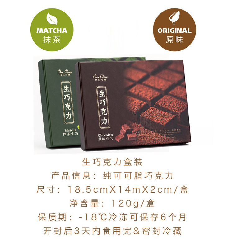 | 【品名】巧克巧蔻生巧克力 【规格】120g*2盒 【保质期】6个月 【发货包装】独立包装盒 【产地】上海 【发货地】江苏昆山 【发货快递】顺丰冷链 【不发货区域】新疆、西藏、内蒙、甘肃、宁夏、青海、贵州、港澳台地区不发 【发货时效】48小时,周末节假日顺延 |