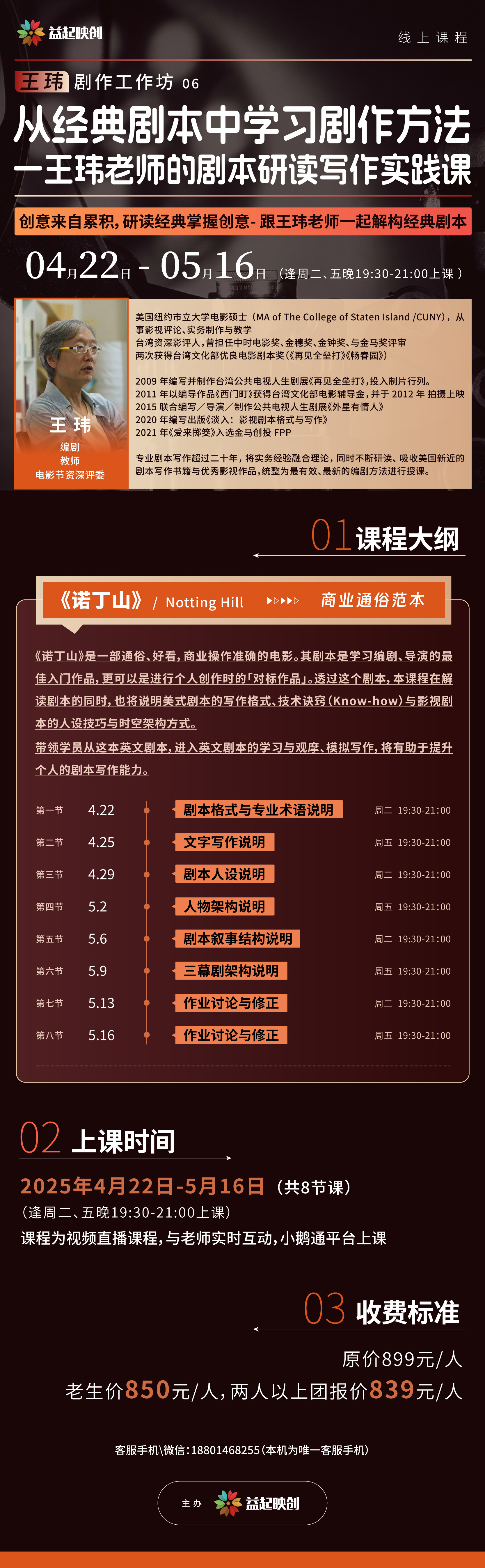 【线上课程】王玮:从经典剧本中学方法系列一<<诺丁山>>4.22-5.16