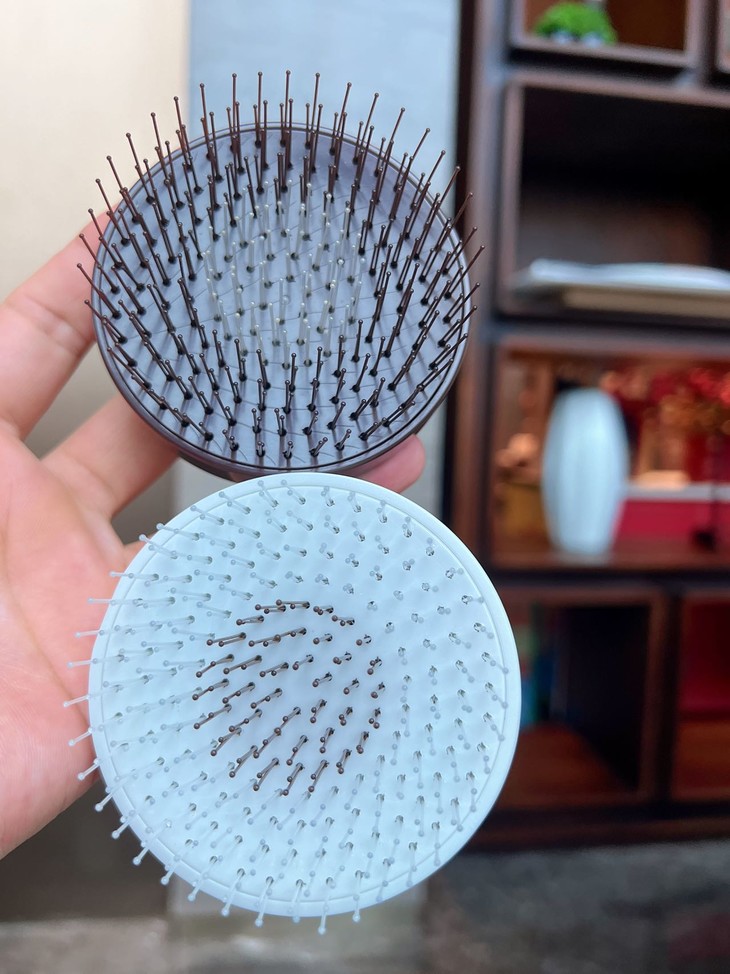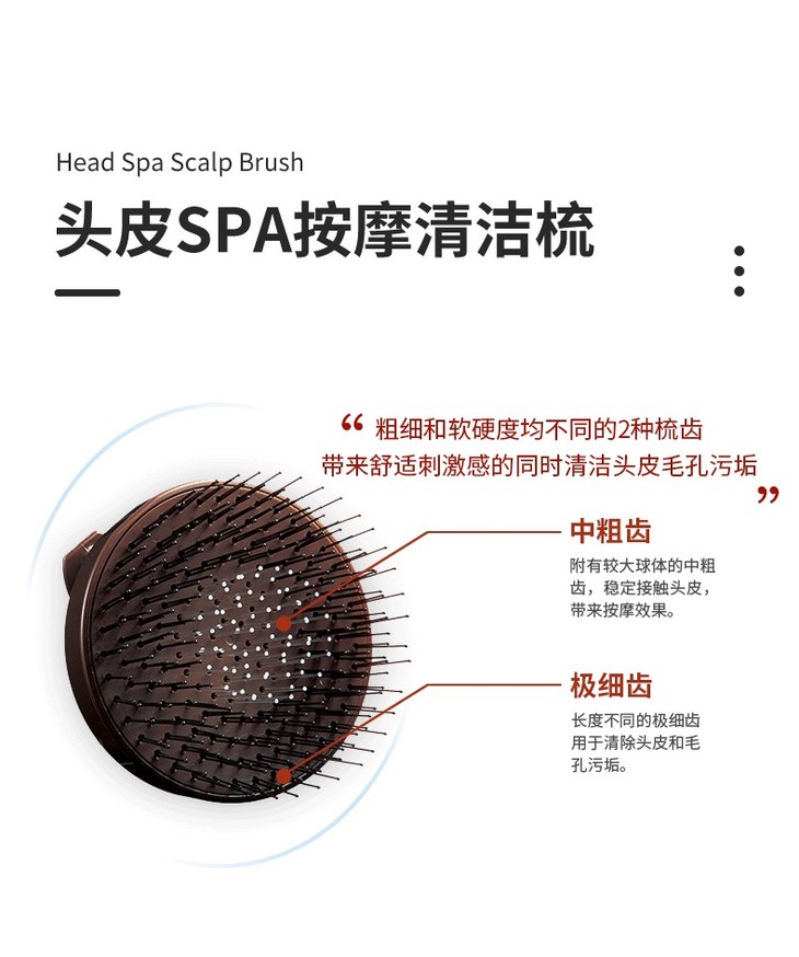 这款梳子圆形的设计,而梳毛的外圈比其他部分长,内层短,长短阶梯的设计就是为了完全接触头部,无死角接触,真是一点儿都不放过‼