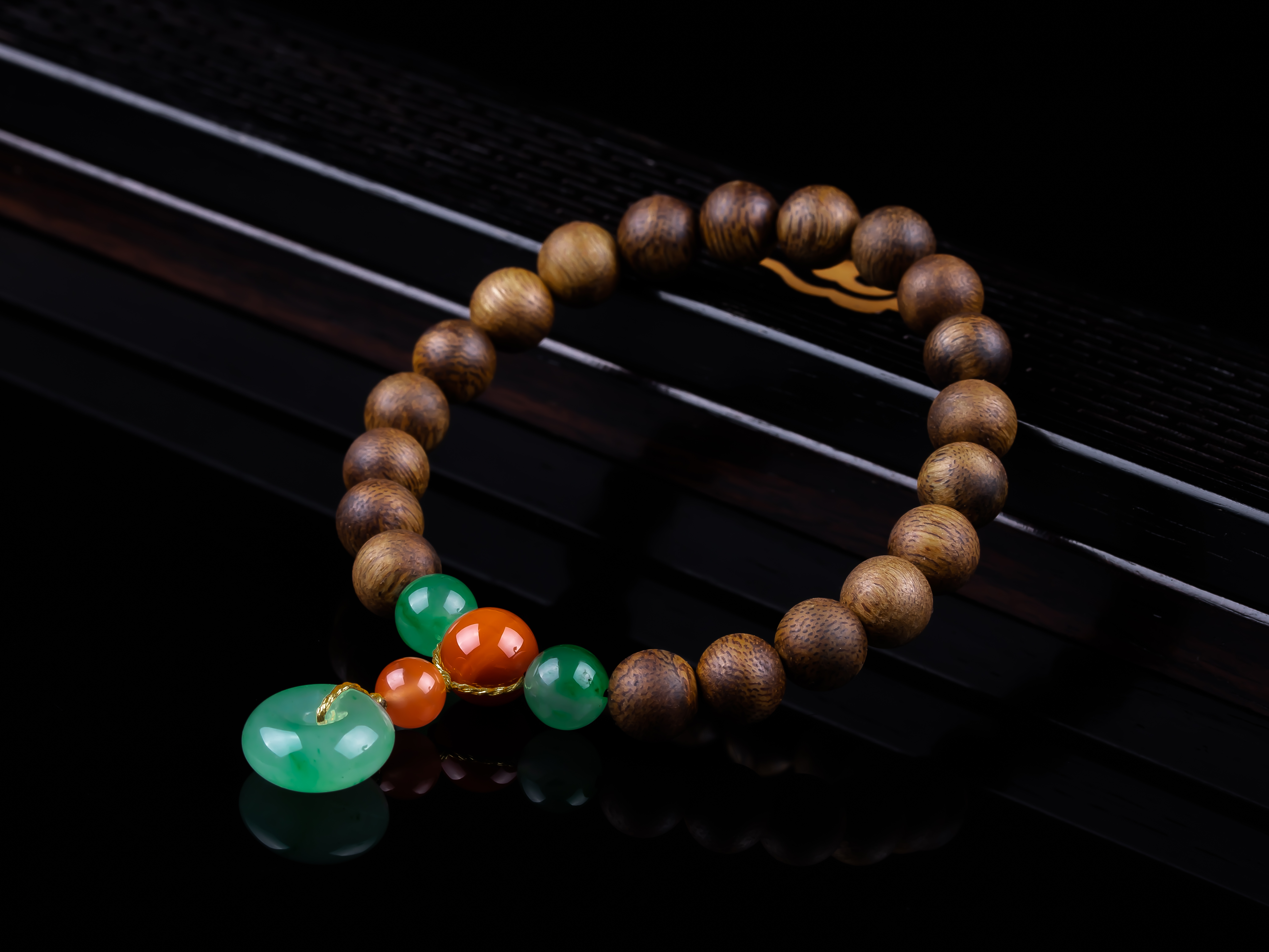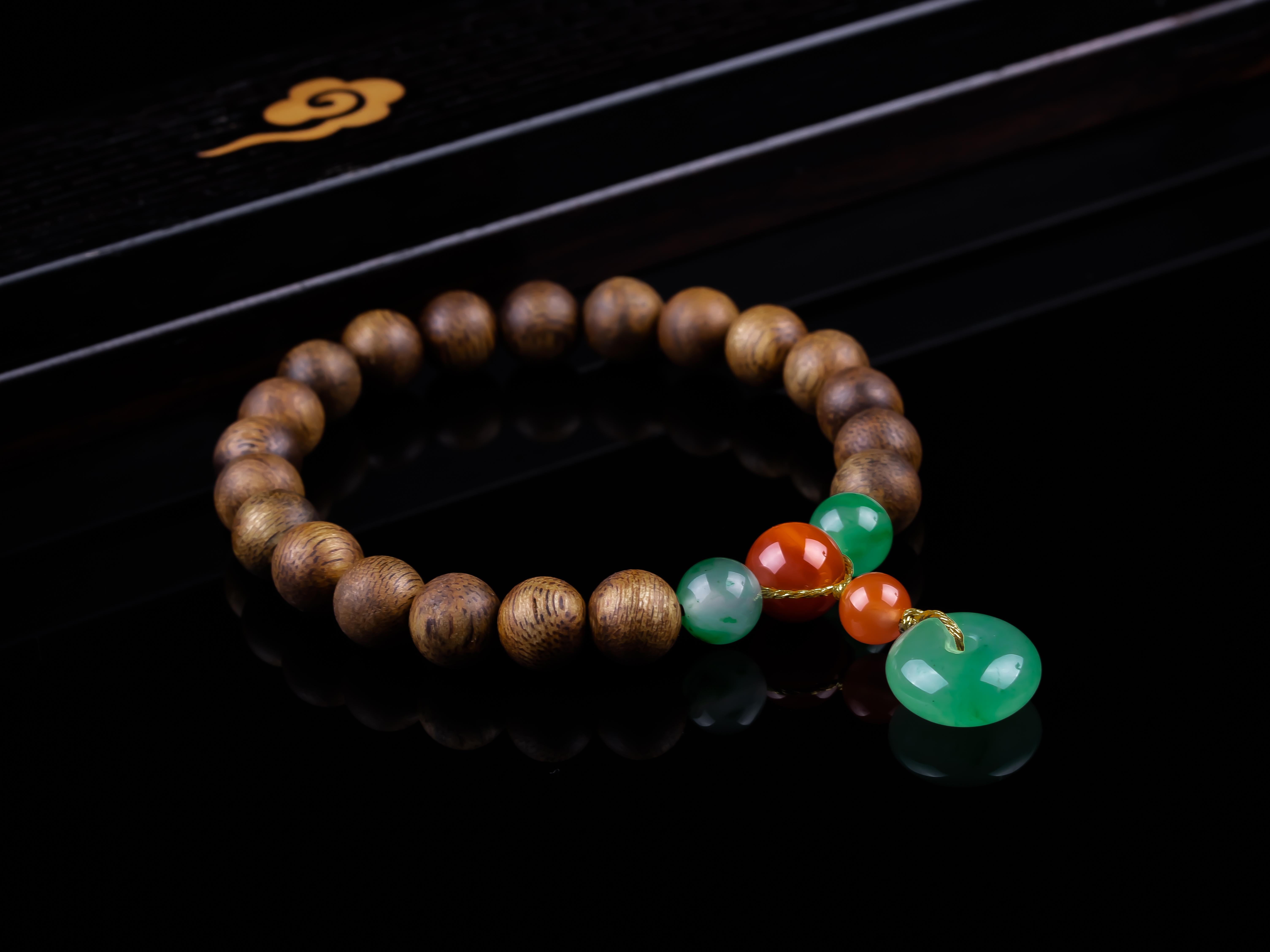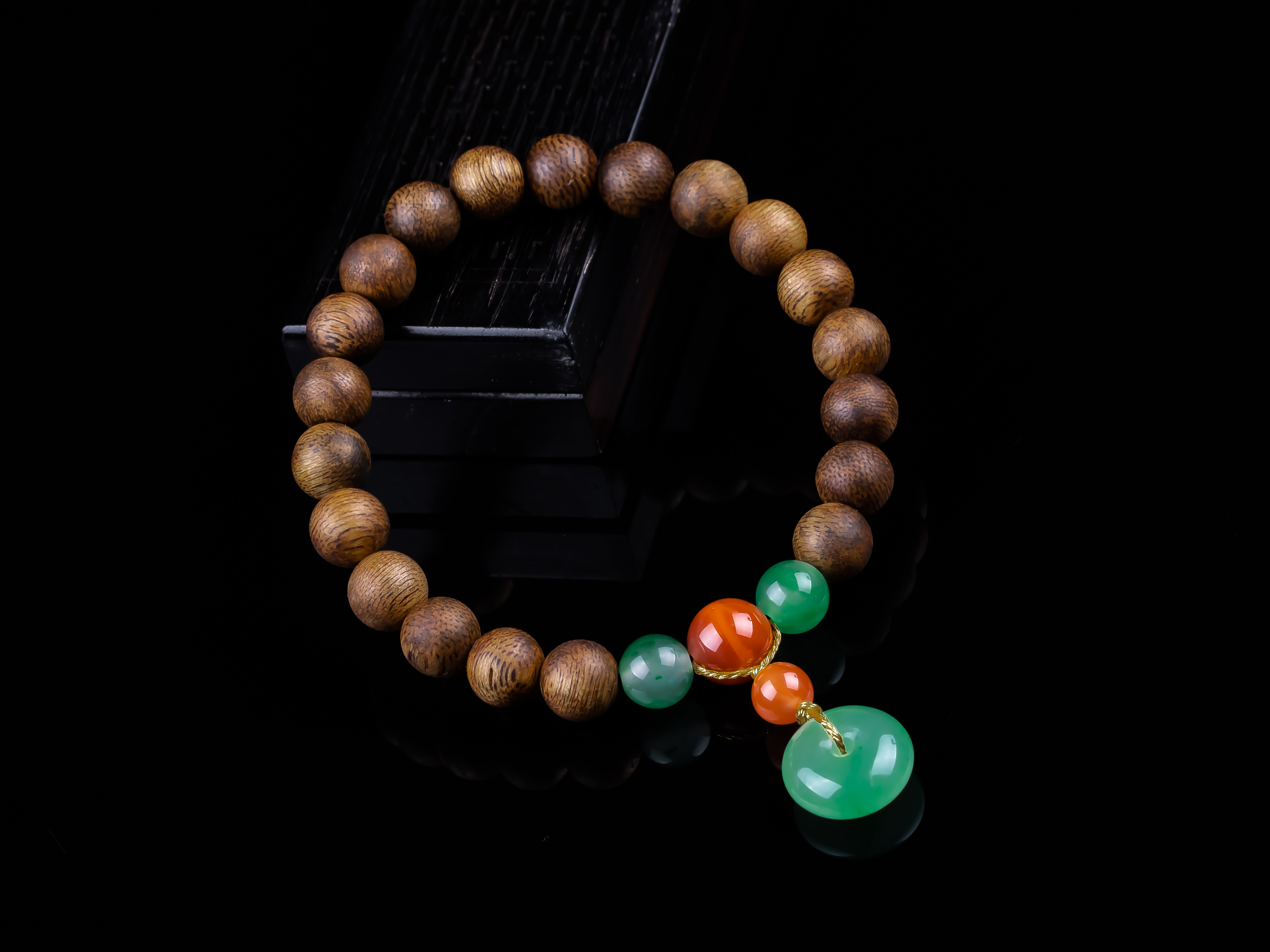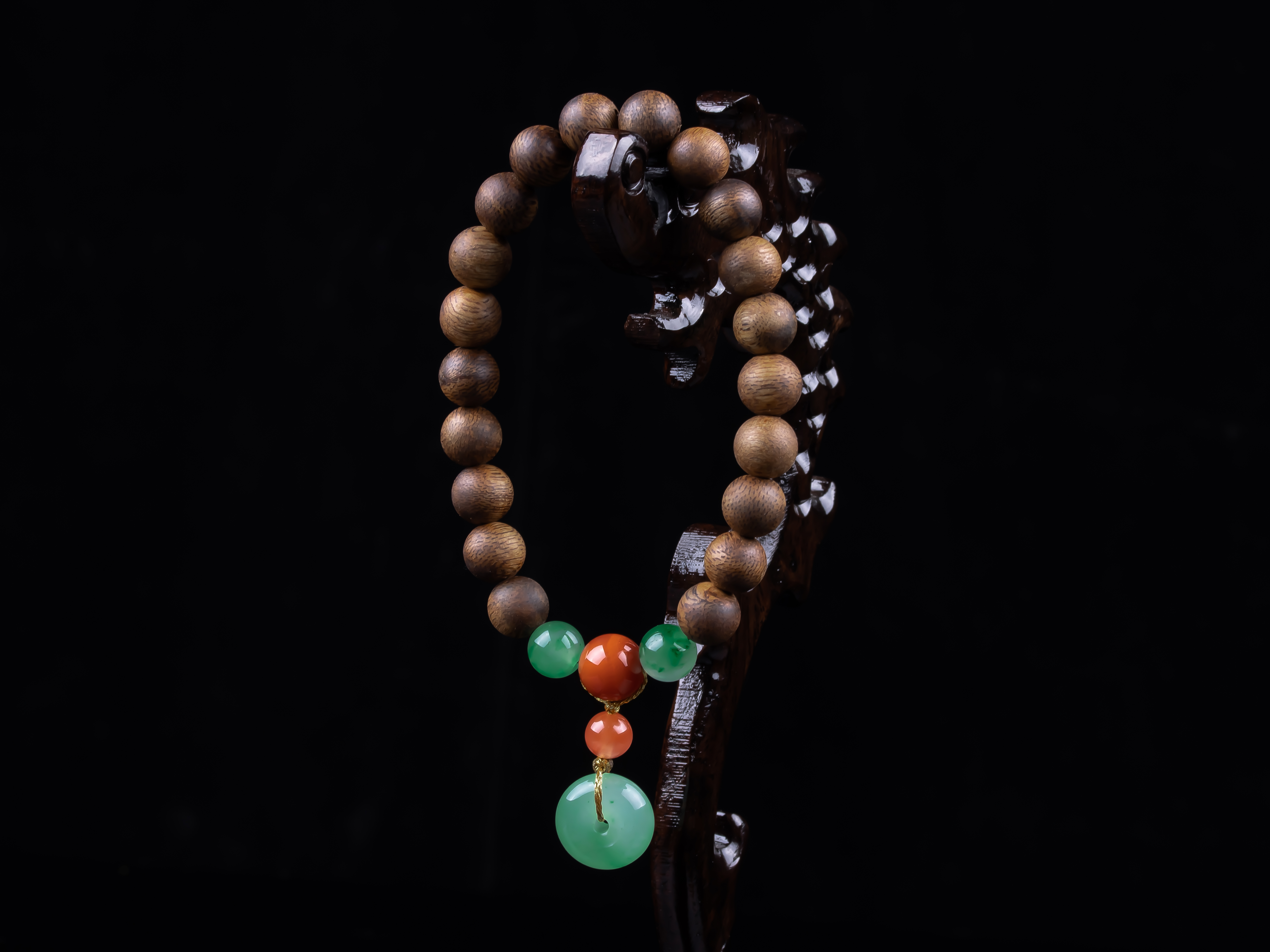 XY0247沉香+南红非洲翠平安扣手串,天然沉香约8.5mm,原色原味,香味自然清甜,南红与非洲翠相配,红绿盎然,色泽鲜明,吉祥平安!
