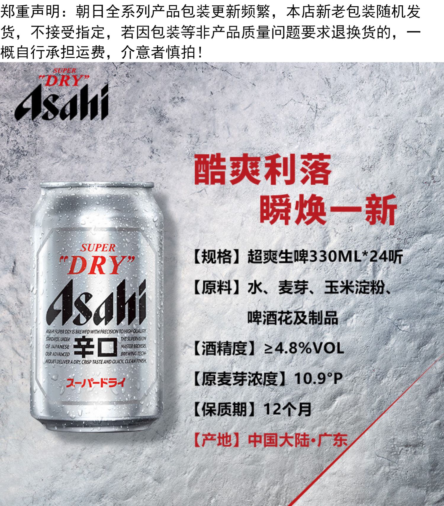 朝日辛口超爽生啤拉格啤酒易拉罐 4.8%vol 330ml*24罐