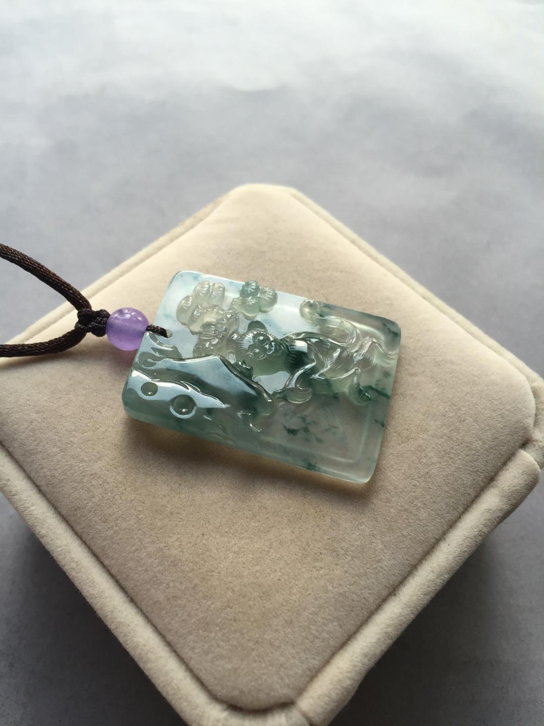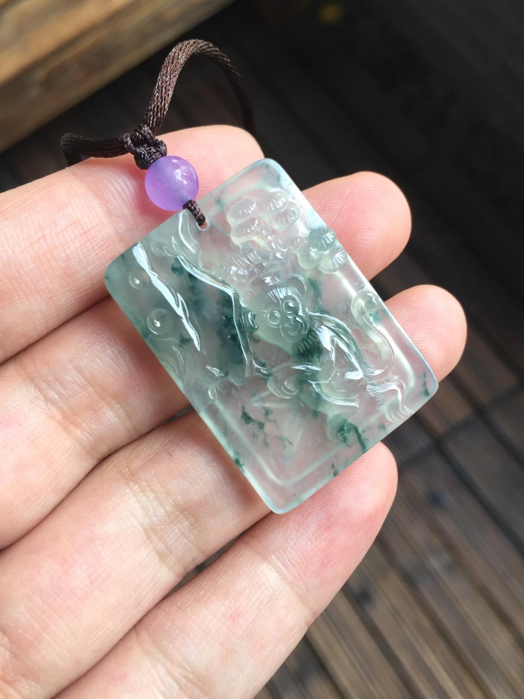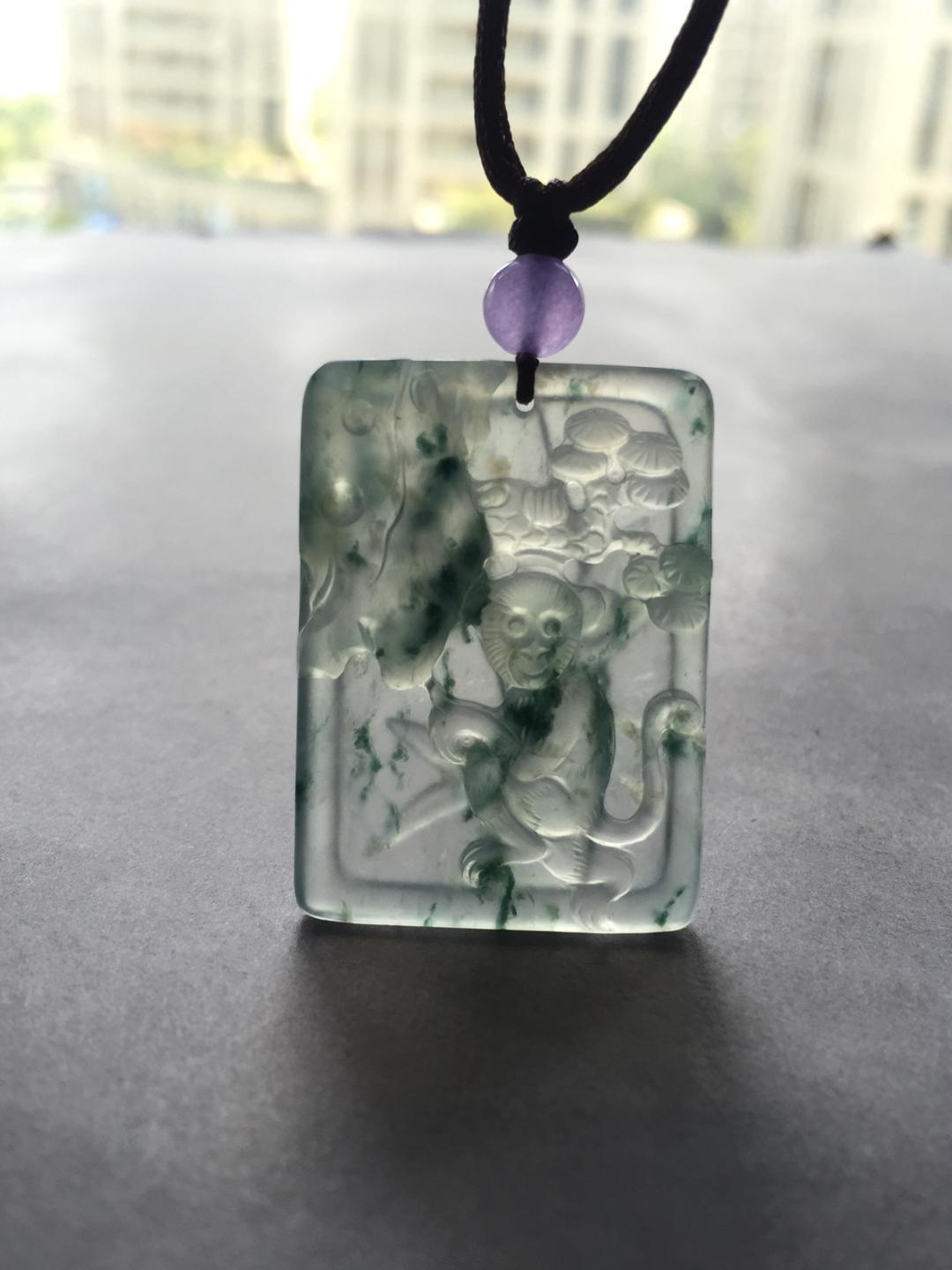 翡翠高冰种飘花灵猴献瑞,竹报平安,35.9*26*5.1mm,种水绝了,荧光四射,飘花灵动,让人一见倾心的漂亮宝贝,雕工特精致,正面小猴栩栩如生,背面玉竹节节高升,一件吉祥寓意的好宝贝,这么大尺寸的高冰种雕牌现在都在一万五以上,禄来性价比一绝,一直在找生肖猴儿的别错过