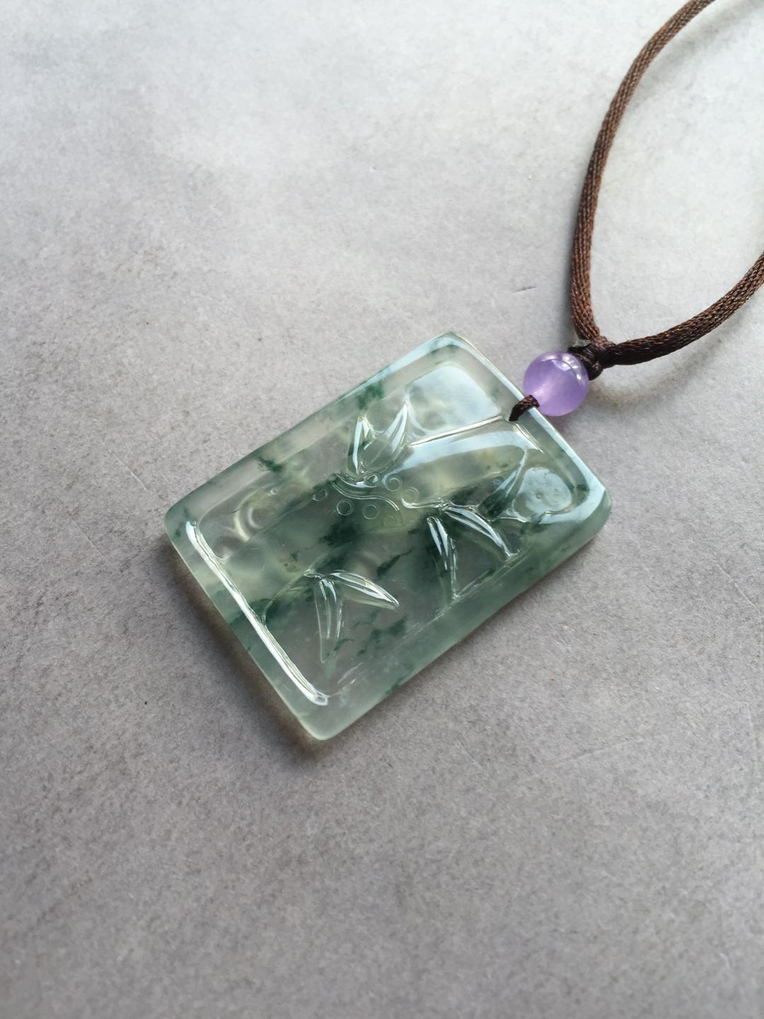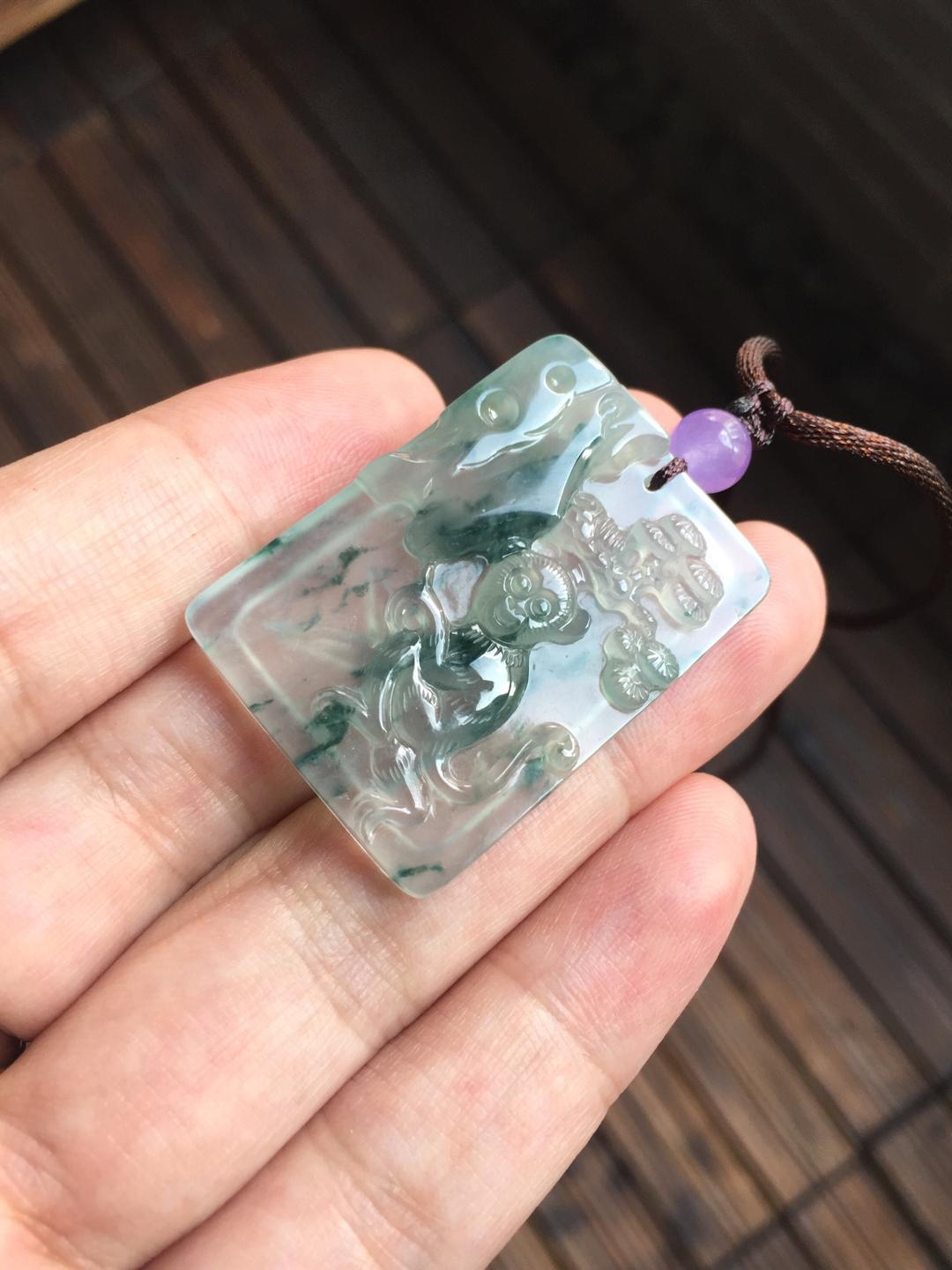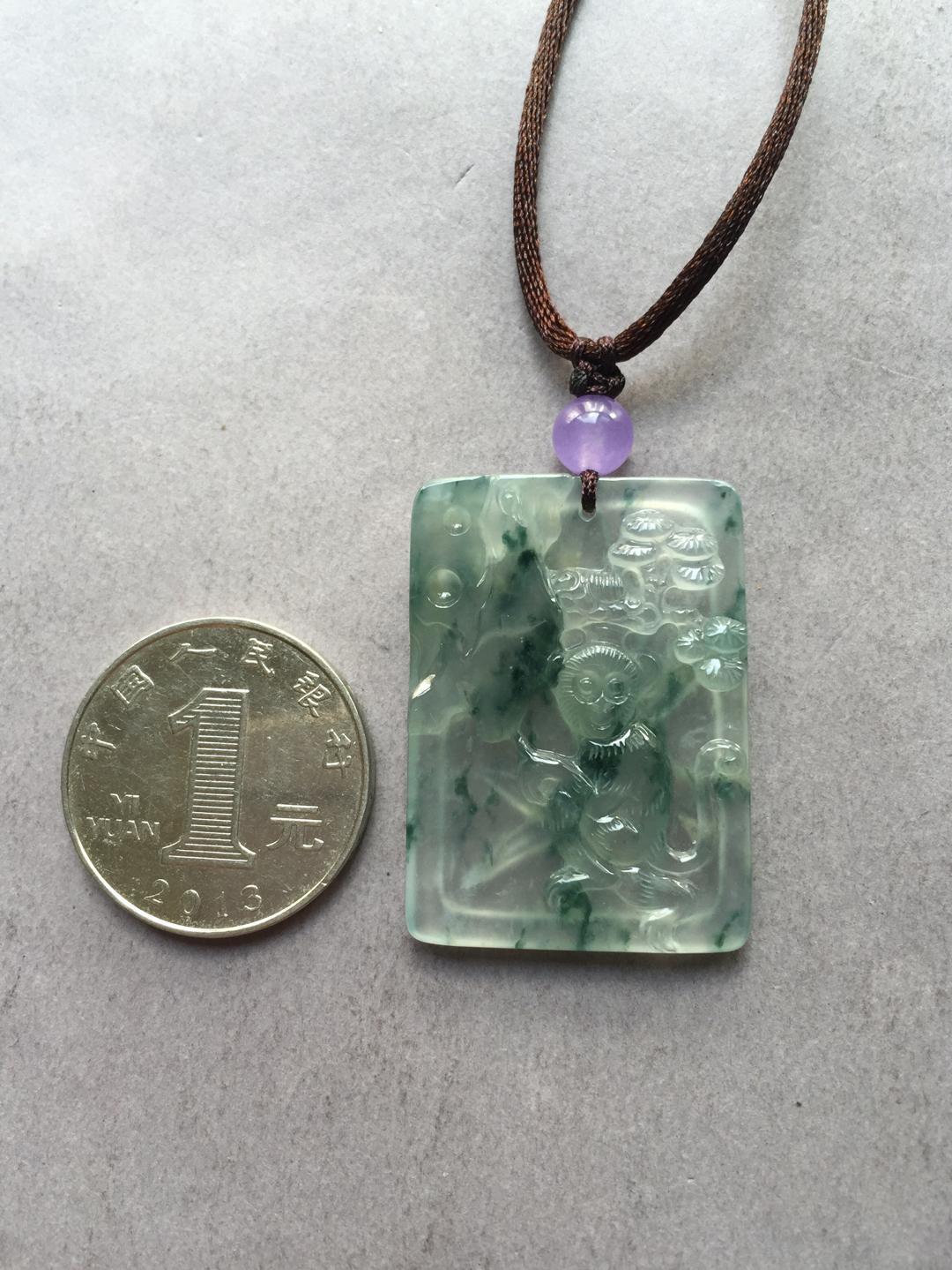 翡翠高冰种飘花灵猴献瑞,竹报平安,35.9*26*5.1mm,种水绝了,荧光四射,飘花灵动,让人一见倾心的漂亮宝贝,雕工特精致,正面小猴栩栩如生,背面玉竹节节高升,一件吉祥寓意的好宝贝,这么大尺寸的高冰种雕牌现在都在一万五以上,禄来性价比一绝,一直在找生肖猴儿的别错过