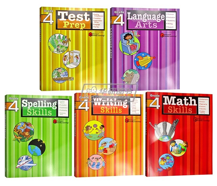 书名:Math Writing Spelling Language Arts Test Prep Skills: Grade 4 Flash Kids美国小学四年级练习册5册套装