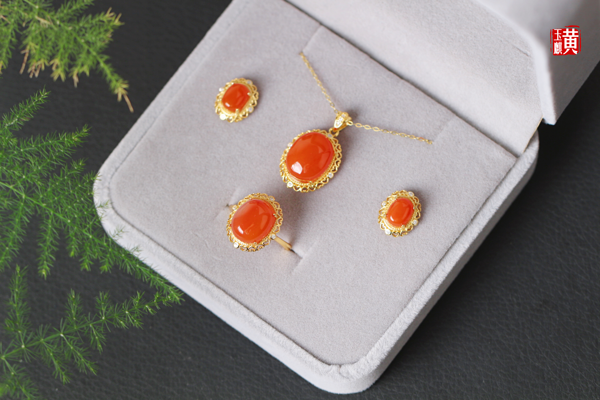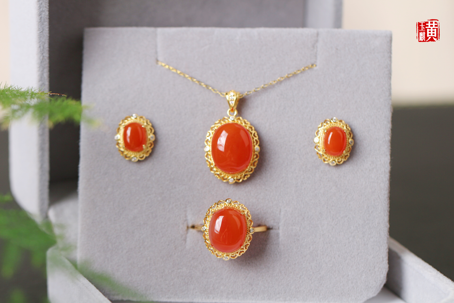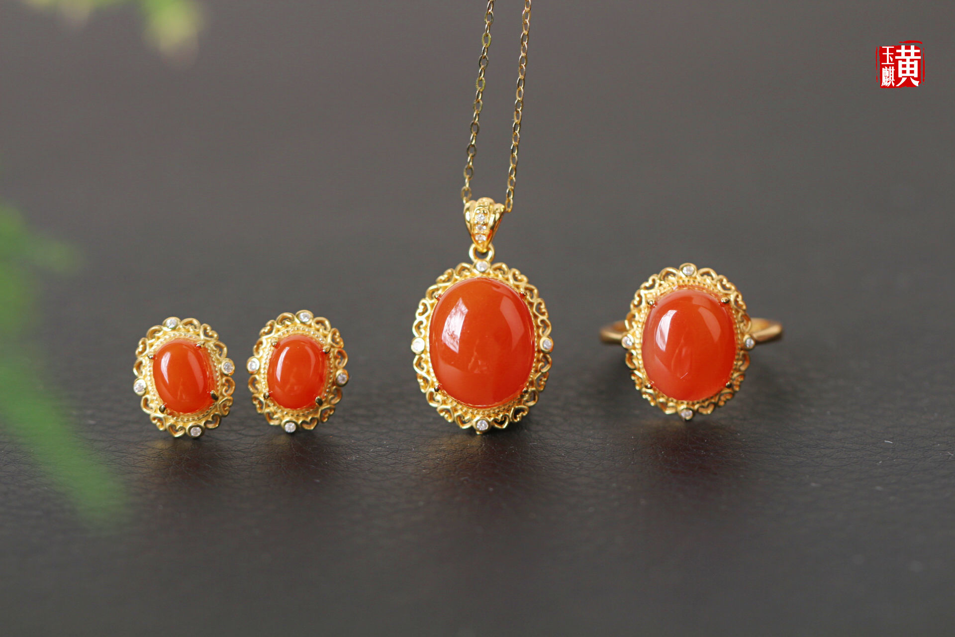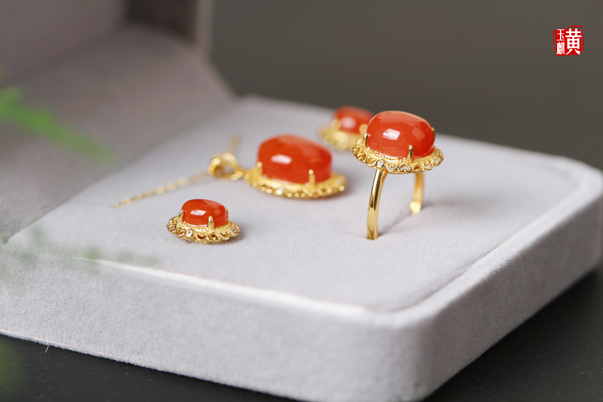 南红樱桃红吊坠、戒指、耳钉套装,蛋面饱满,水润透亮的樱桃红,鲜艳红润,醉人心扉,925银镶,精致好看,佩戴高贵优雅,出席各种场合,焦点的所在。