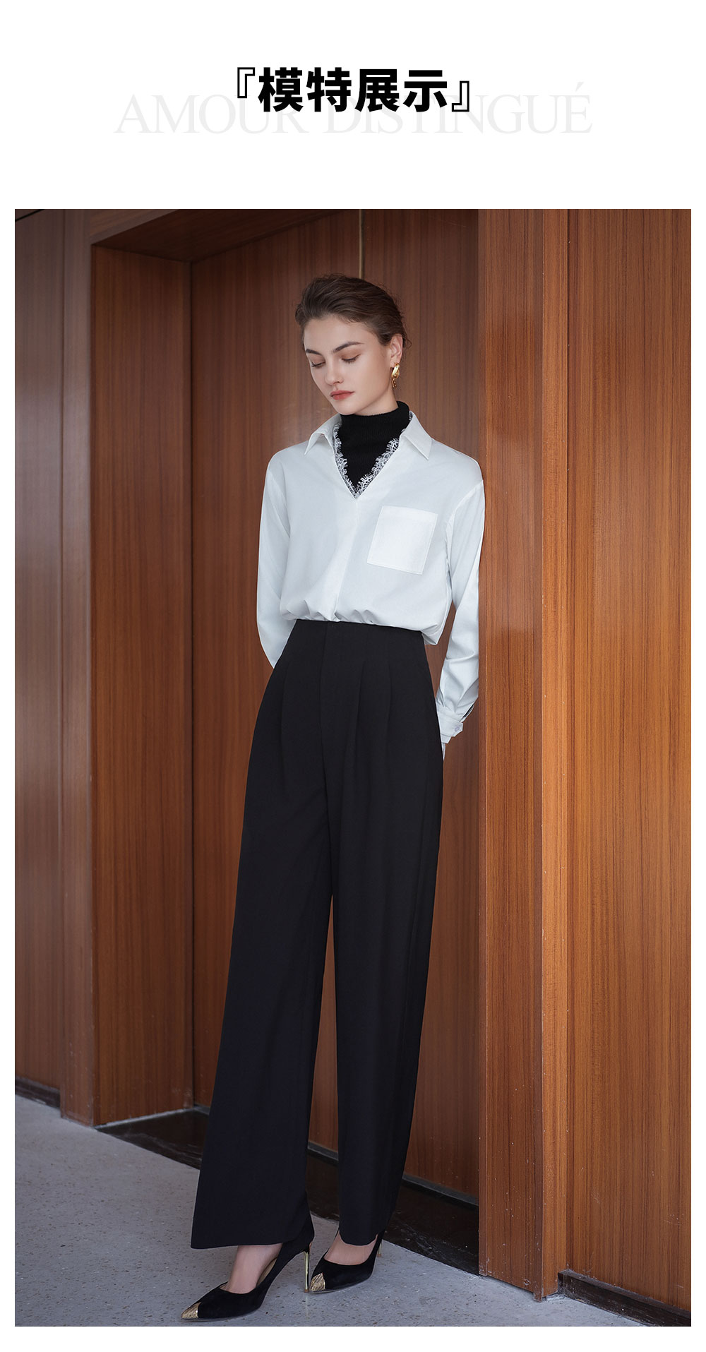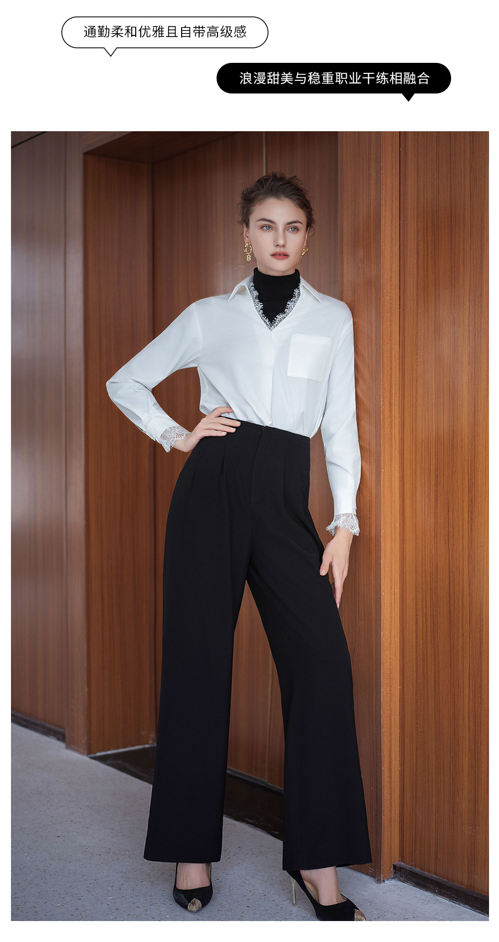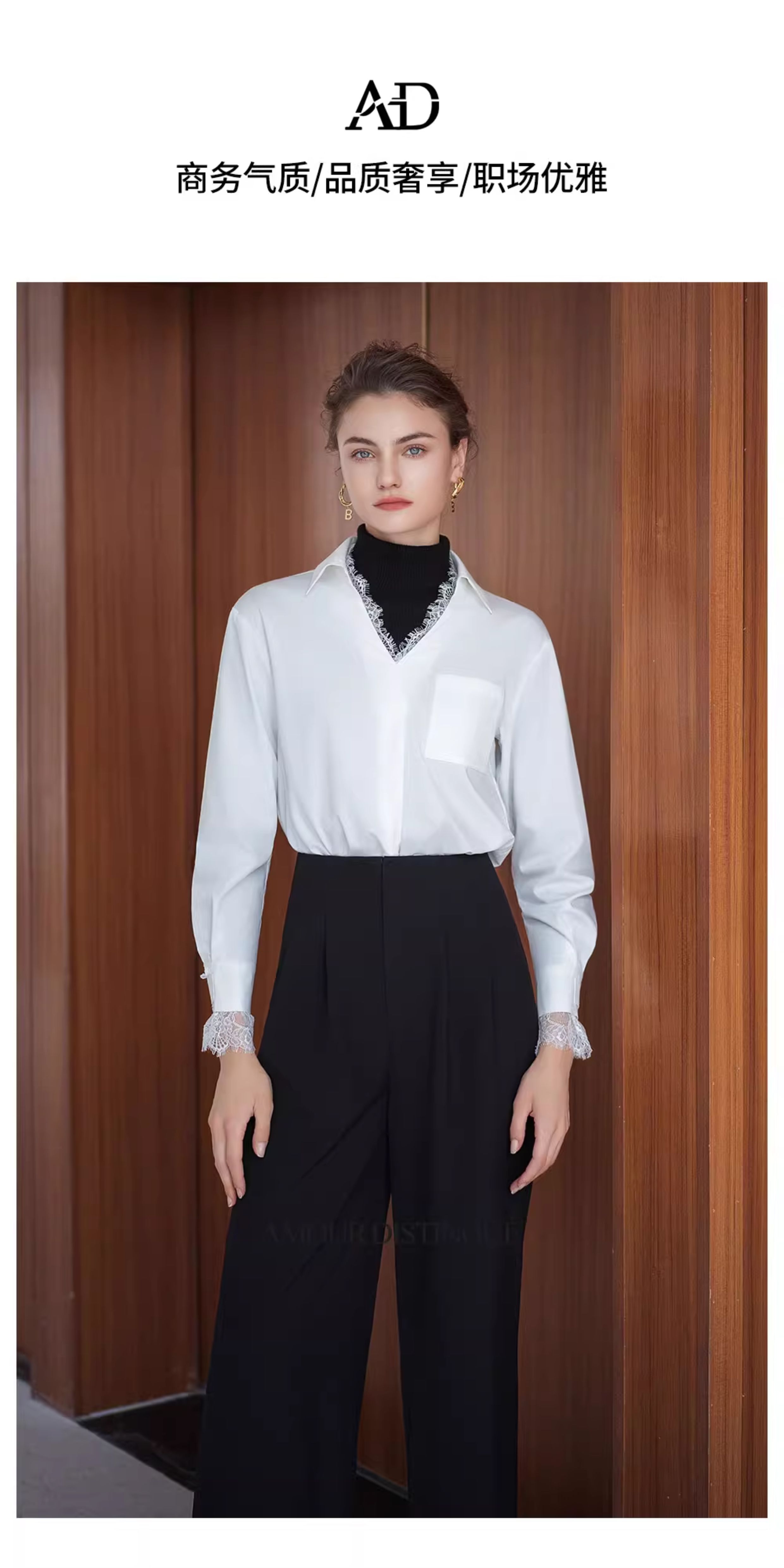 AD高级轻奢穿搭一整套2025新款蕾丝边V领衬衫女百搭高腰黑色西裤
