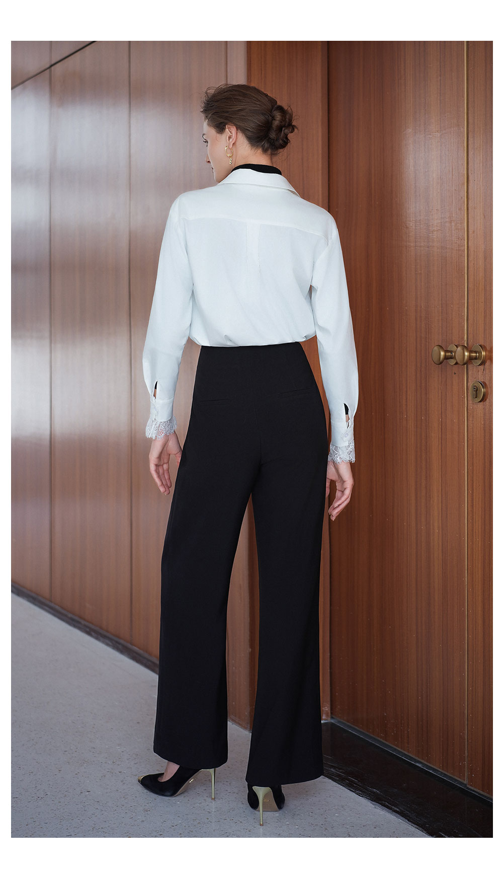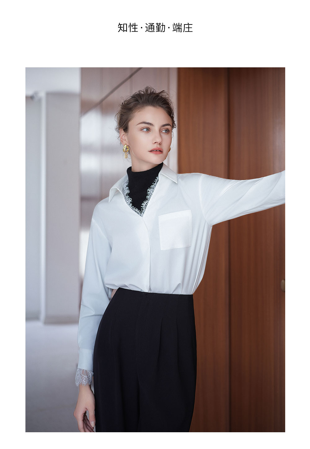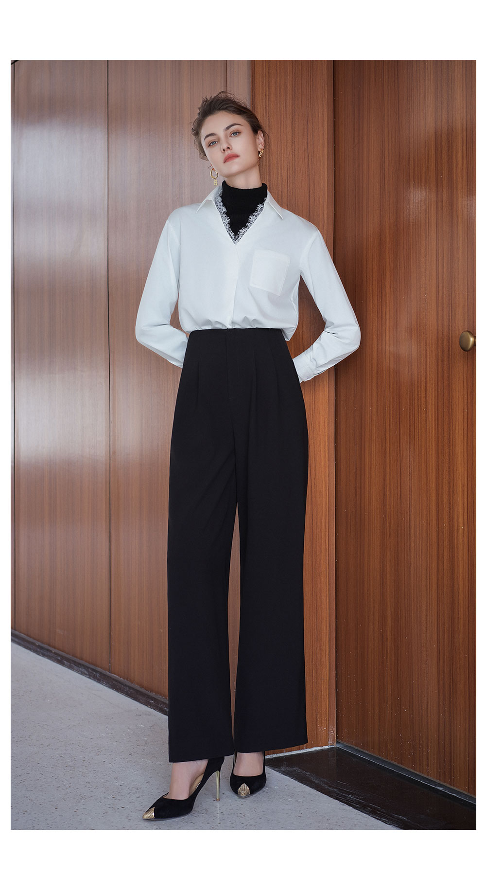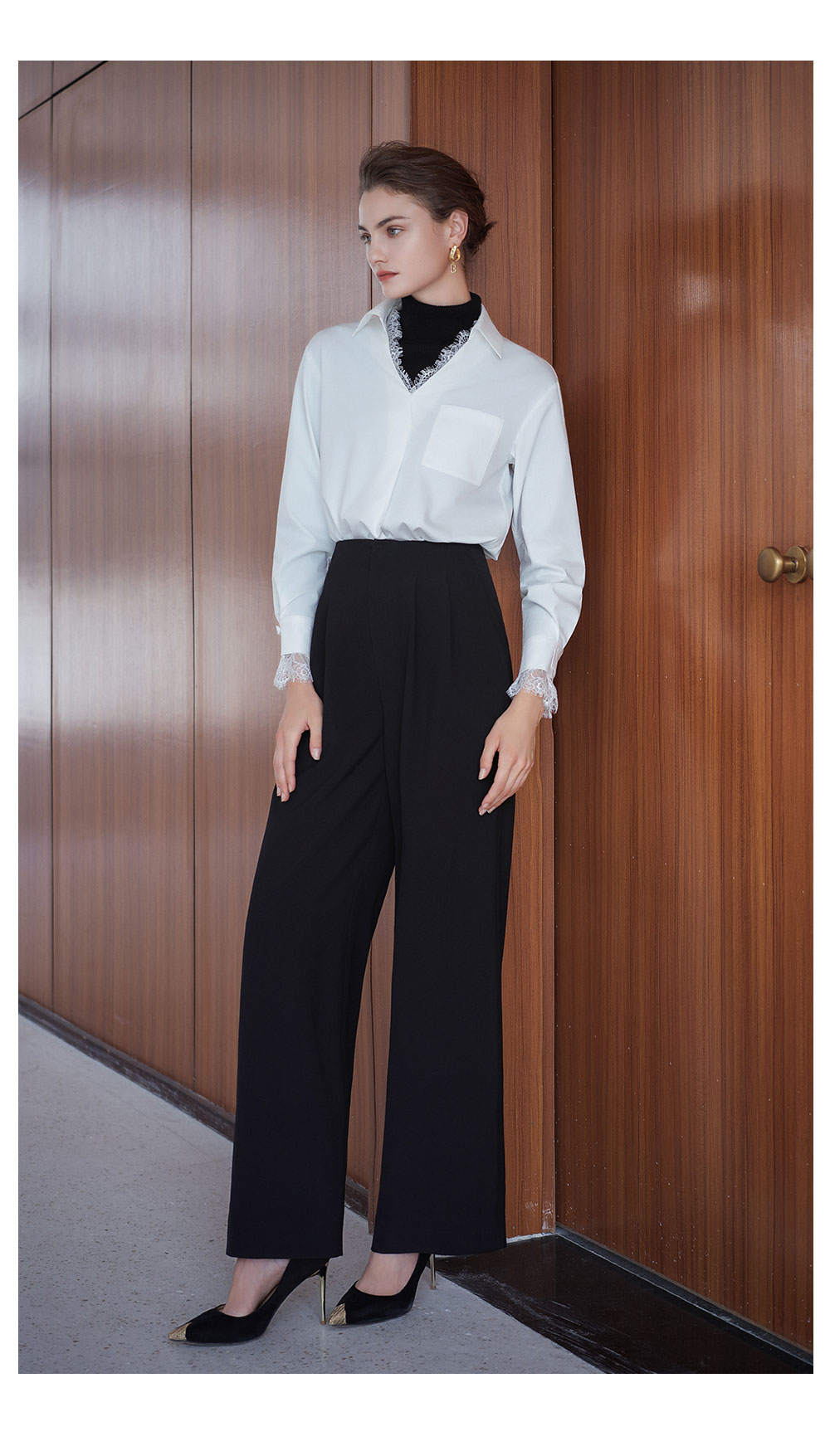 AD高级轻奢穿搭一整套2025新款蕾丝边V领衬衫女百搭高腰黑色西裤
