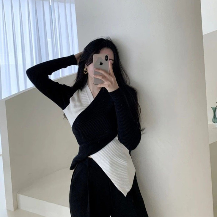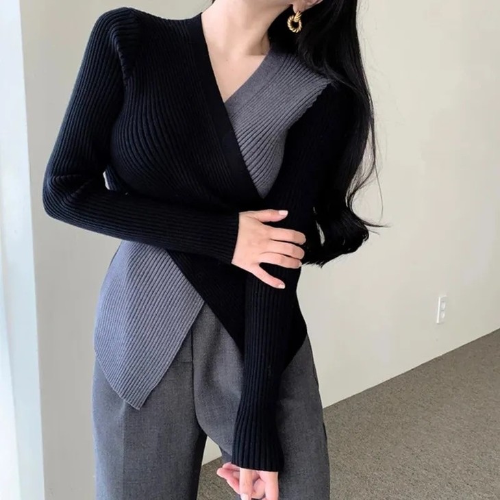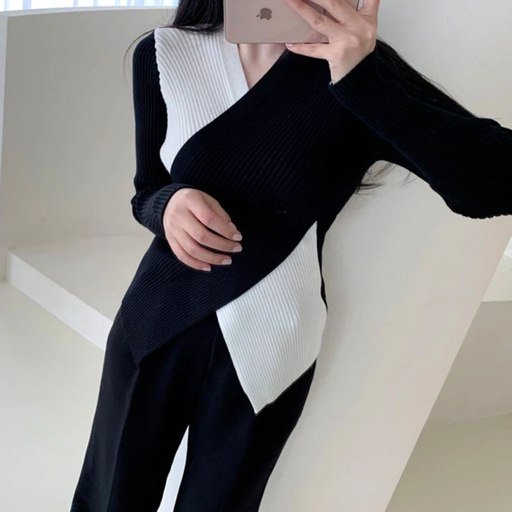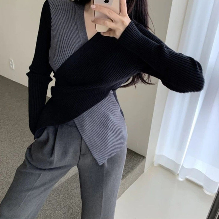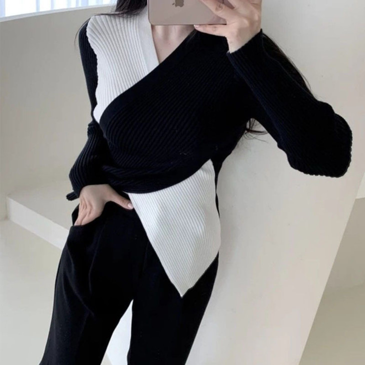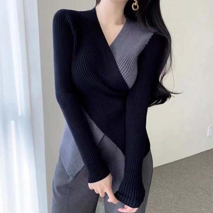 【真正实现穿衣显瘦】韩版chic 秋冬复古性感 交叉V领 不规则设计 修身百搭撞色针织衫女