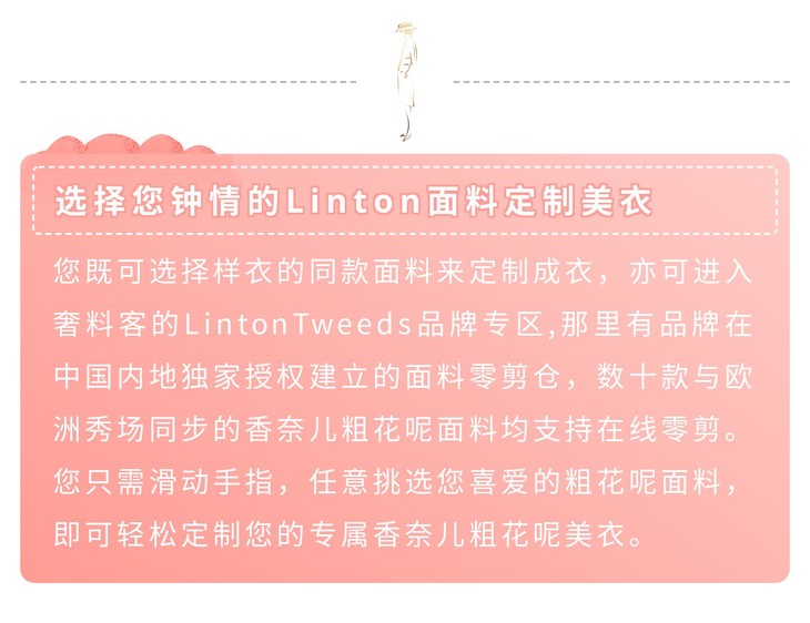 - 拥有欧洲多个面料品牌的在线零剪资源和最惠价格,香奈儿粗花呢面料的中国总代理。进口面料一米起剪,秒速直达