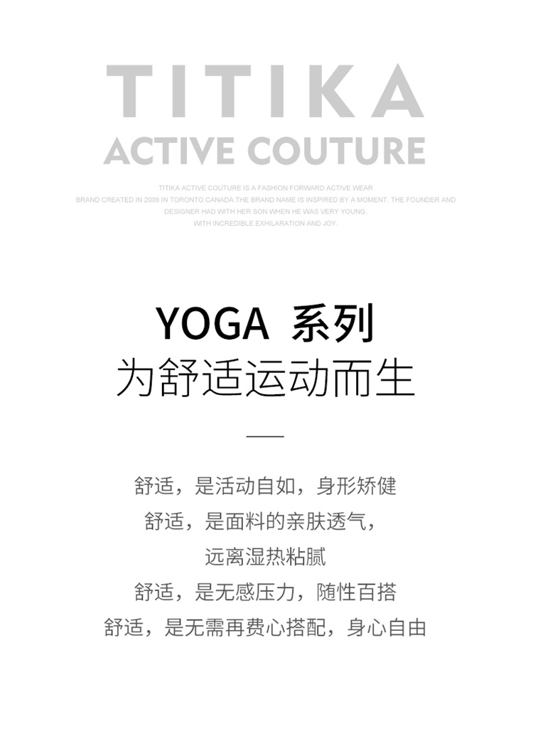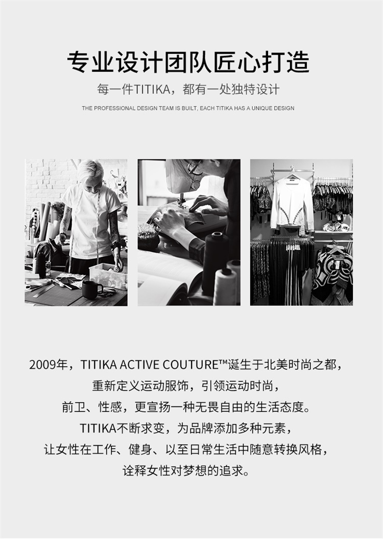 - 2009年,Titika Active Couture诞生于北美时尚之都,重新定义运动服饰,让运动时尚,前卫、性感,更宣扬一种无畏自由的生活态度。TITIKA缇缇卡不断求变,为品牌添加多种元素